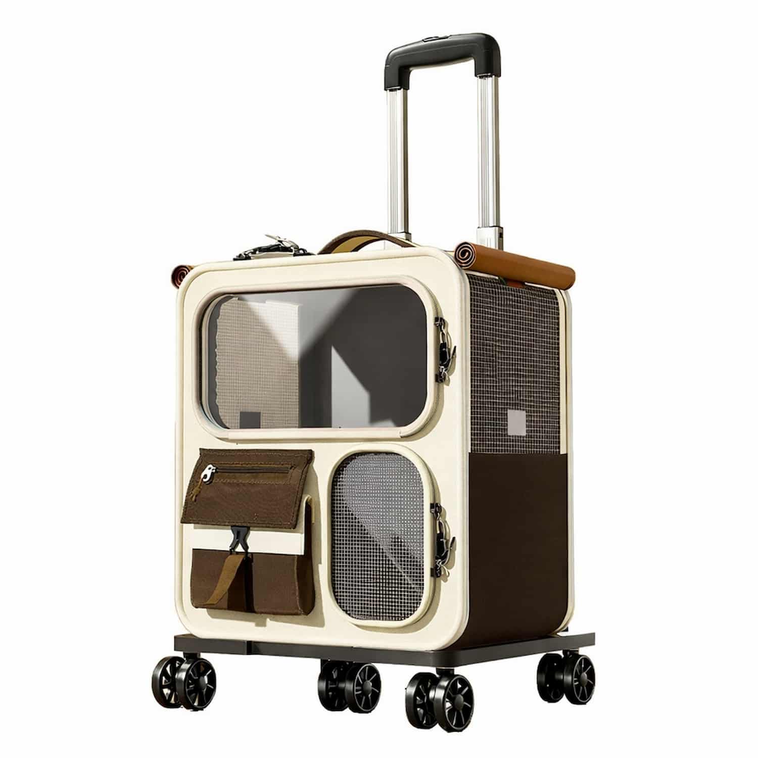 A 3-in-1 canvas pet carrier that rolls on four wheels with a three-stage telescopic handle, wears as a padded backpack, or carries by hand. The 10.6 x 14.6 x 16.5 inch cabin fits cats and dogs up to 15.4 lbs. A front feeding window passes food through without unzipping. Rigid plastic-grid mesh panels maintain ventilation under load. Exterior snack pouch and soft grip handle included. Available with or without pull rod.