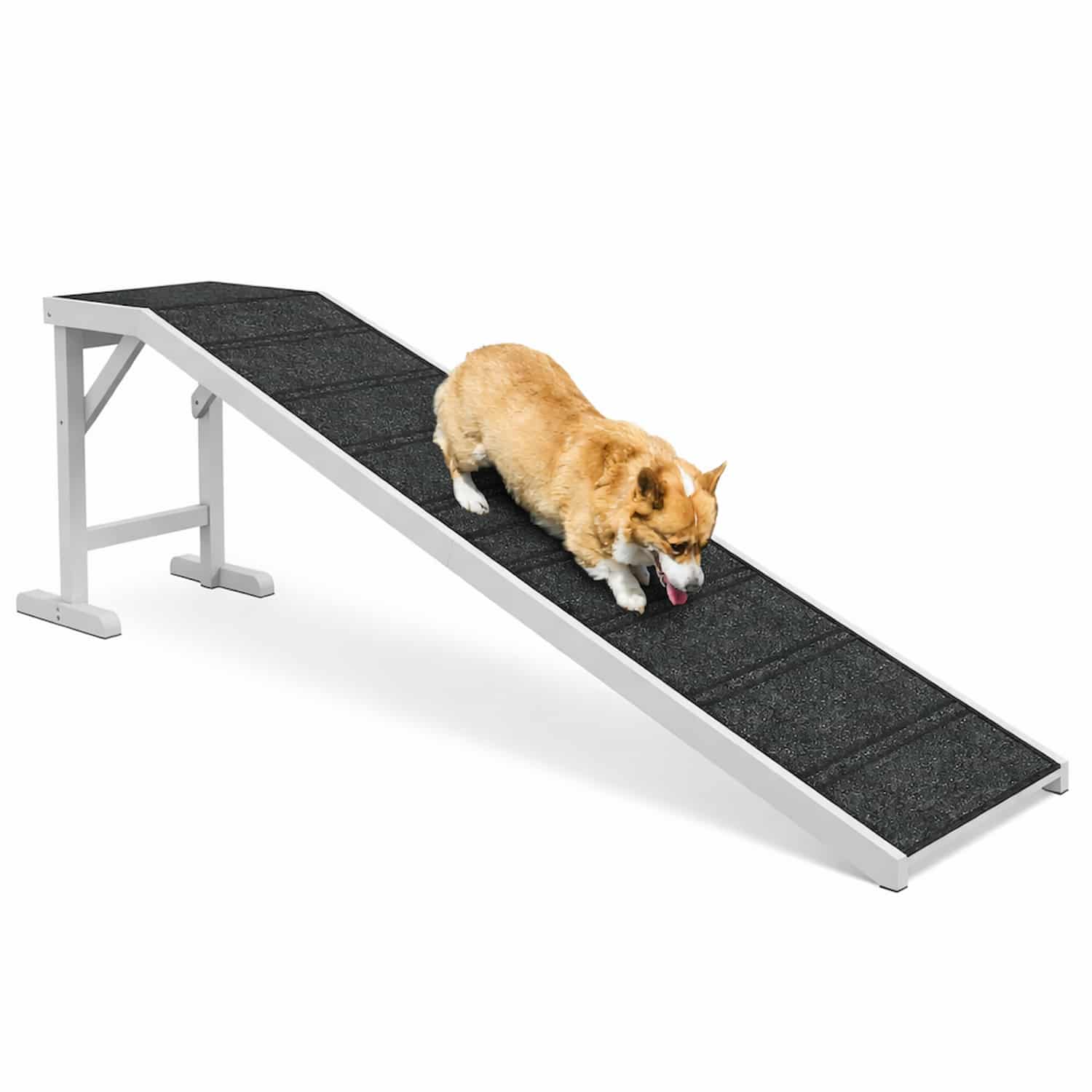 Carpet withstands use without fraying. Darker color hides dirt and fur. Solid pine with reinforced crossbars prevents wobbling or bending. White finish coordinates with bedroom furniture. Leans against beds or sofas without tipping. Pine withstands repeated climbing. Overall 74 inches long by 16 inches wide by 25 inches tall for beds 20-24 inches high. Gentle slope for aging dogs or small breeds. Ramp surface 73 inches long. Assembly required, hardware included. For cats and dogs.