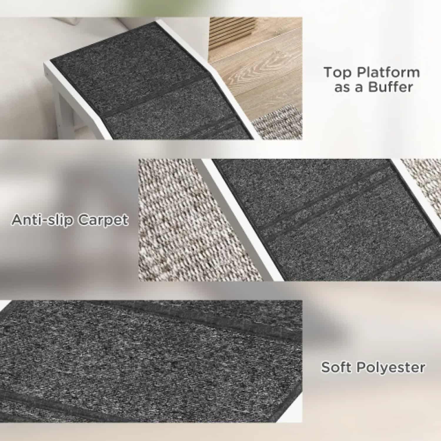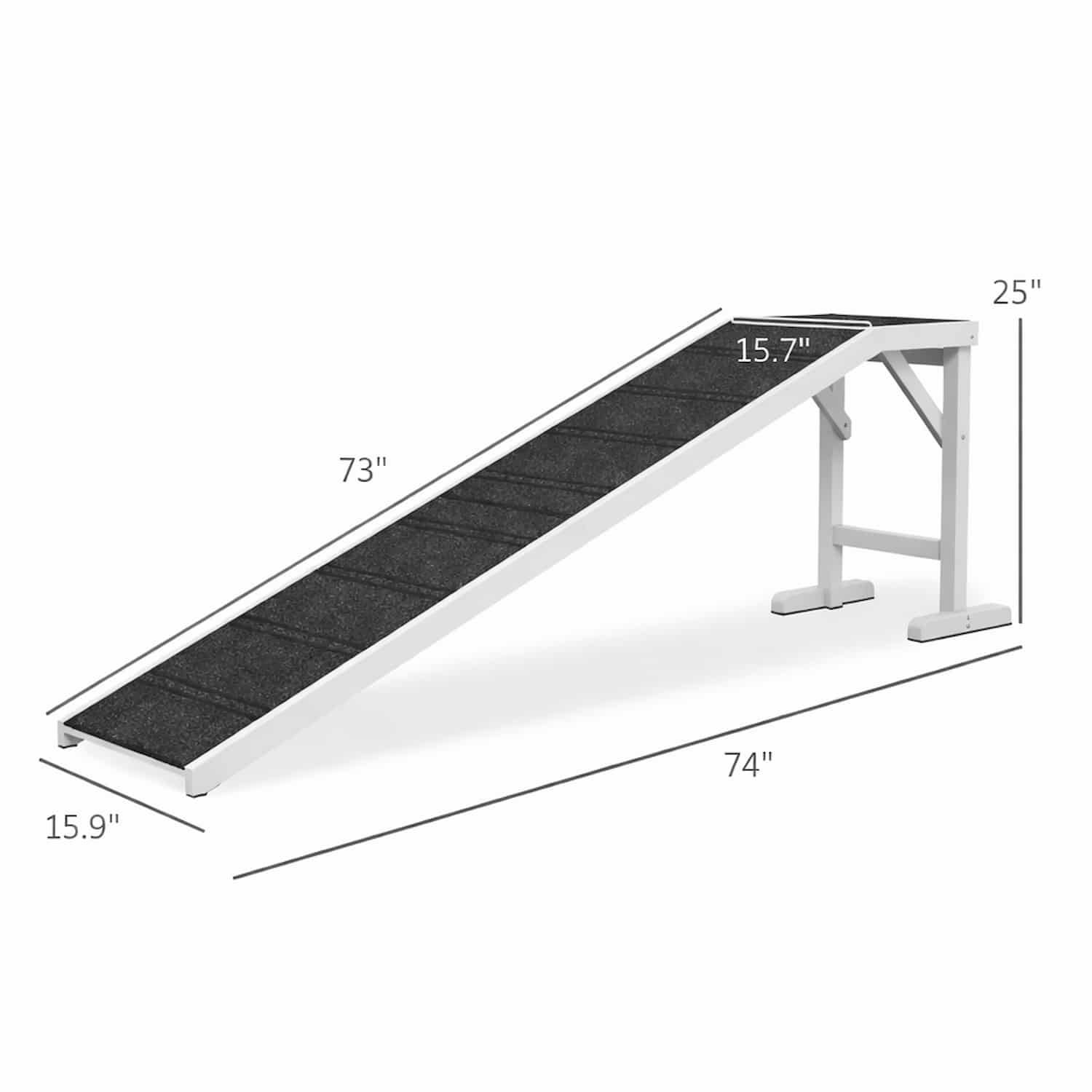 Pine wood pet ramp with non-slip carpet, flat landing platform at top, white painted frame, 74 inches long by 25 inches tall. Platform at top creates stopping point for rest before stepping onto bed or sofa. Flat surface gives confidence. Platform 15.75 inches long by 11.75 inches wide for small to medium dogs. Low slope reduces joint strain. Black carpet covering entire ramp and platform provides traction preventing sliding. Textured surface gives visual contrast for edge visibility.