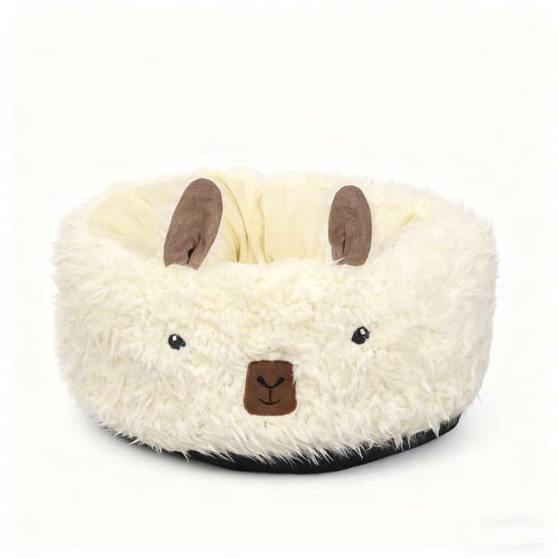 Winter warm alpaca-shaped dog bed with half-enclosed design that creates den-like environment, reducing anxiety in nervous pets. Raised sides provide head support and block drafts during cold weather. Cloud touch PP cotton sponge filling provides luxurious cushioned surface. Ultra-soft flannel plush exterior gentle on skin, maintains loft after use. Skin-friendly short velvet resists shedding hair. Charming alpaca design with ears, button eyes, and feet adds whimsical personality. Small (15.7 inches, 1.5 lbs) for toy breeds and cats, medium (19.7 inches, 2.3 lbs) for small to medium dogs, large (23.6 inches, 3.3 lbs) for medium breeds. Available in cream white or tan brown. Open front allows easy entry for senior pets.