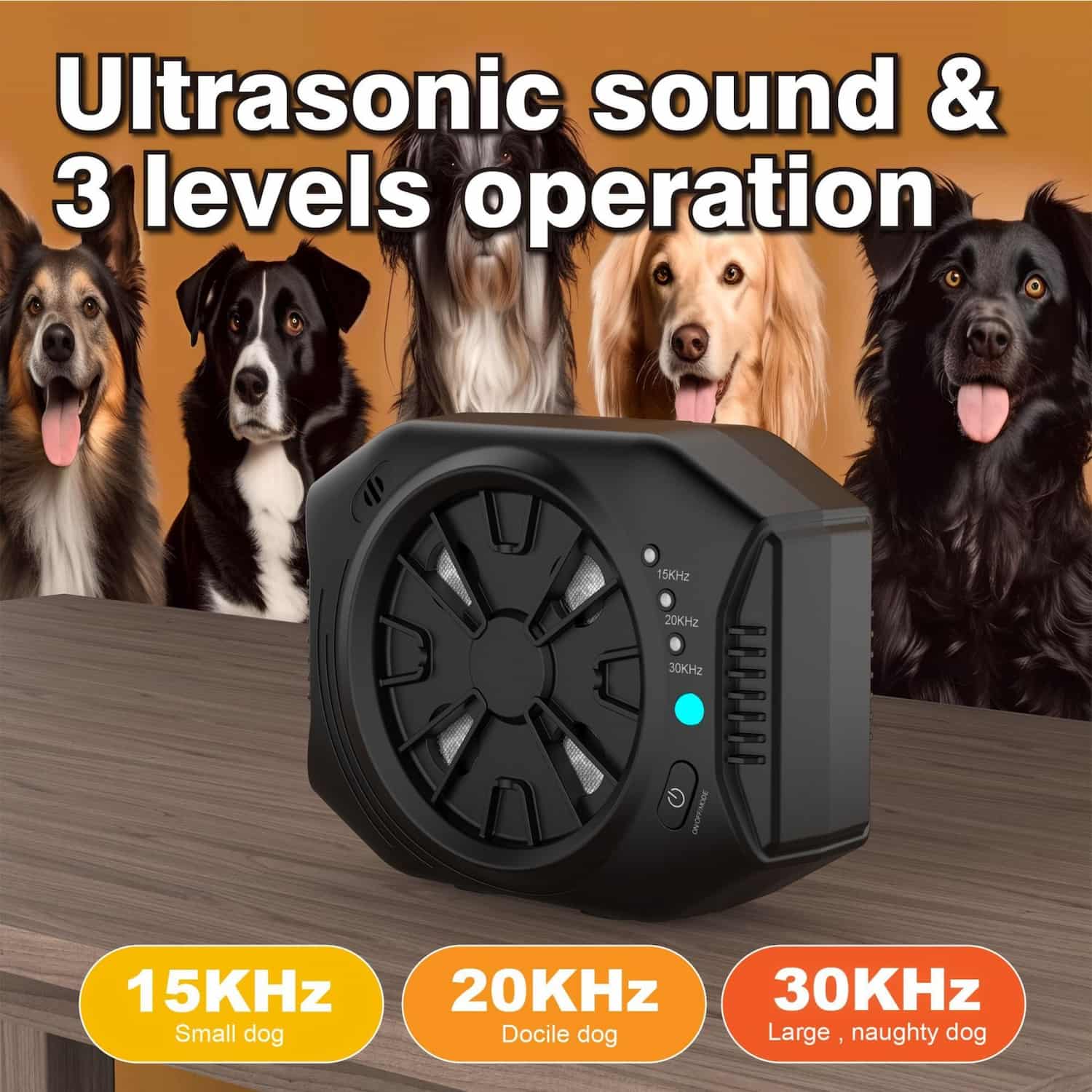 Mode 1 runs at 15 kHz for small dogs. Mode 2 at 20 kHz for calmer, mid size breeds. Mode 3 sweeps variable frequency up to 30 kHz for stubborn or large dogs that ignore lower frequencies. Start at mode 1 and increase if barking continues. Most dogs respond within 2 weeks of consistent use.