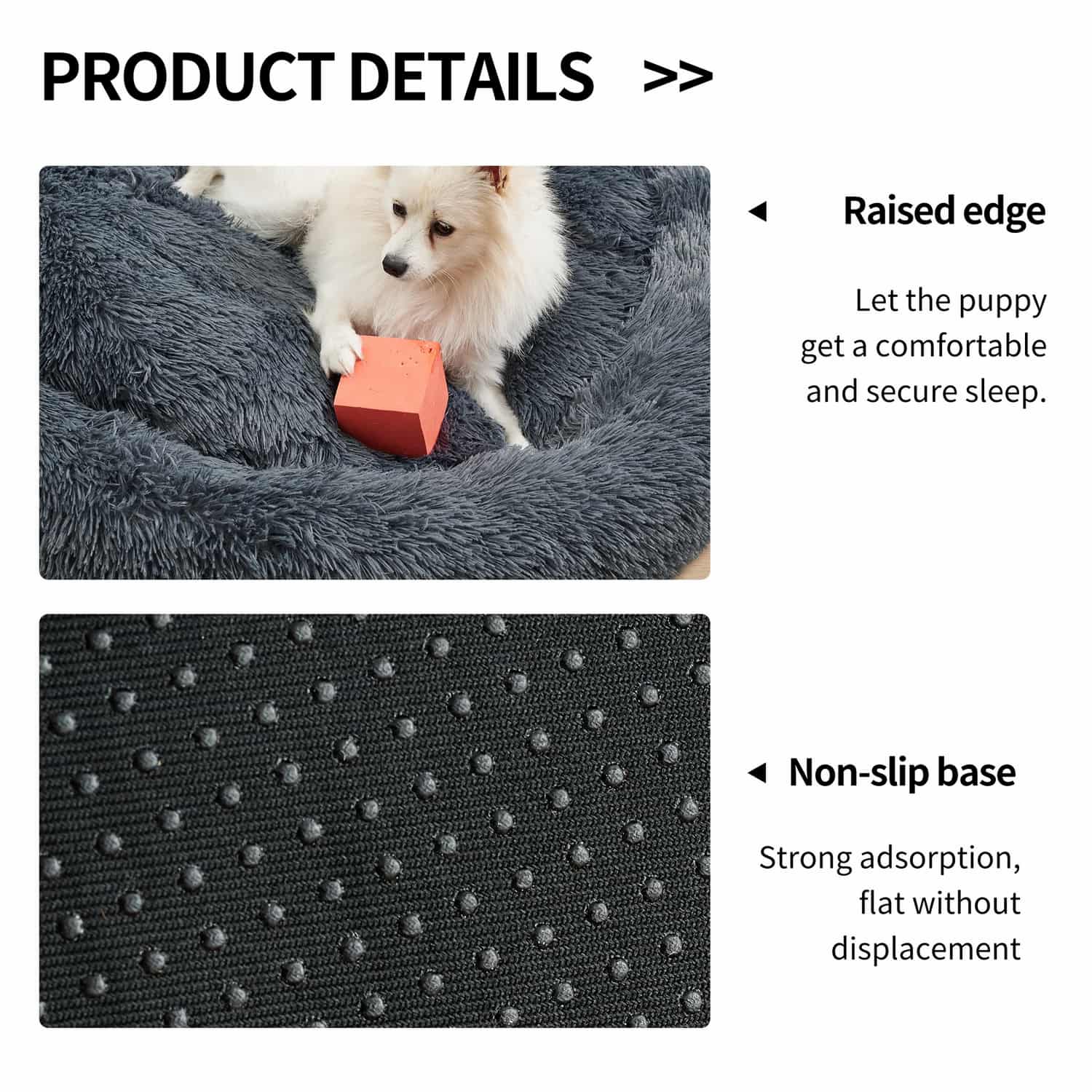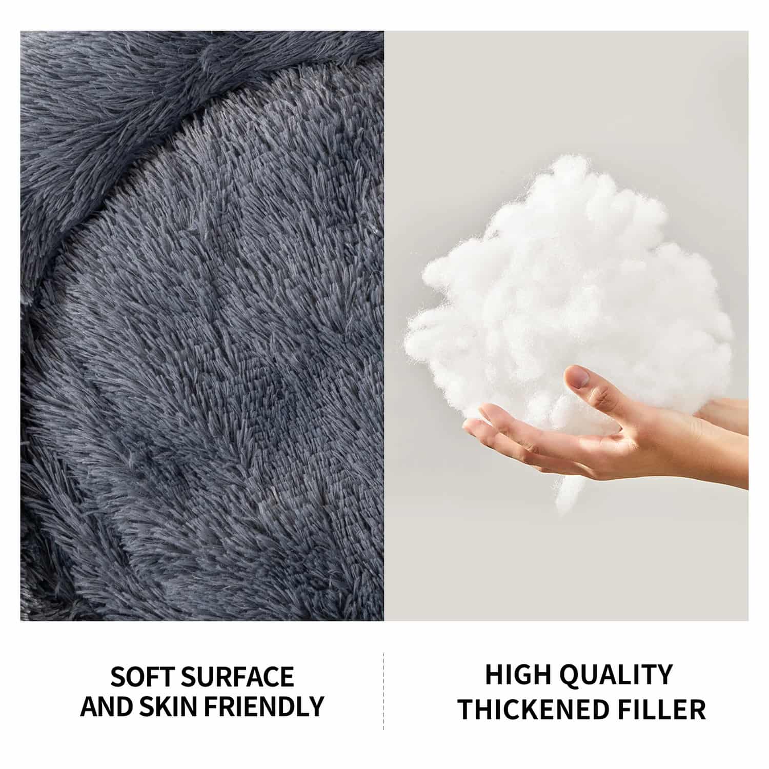 Medium fits pets up to 22 lbs and Large fits up to 44 lbs. Long plush fabric is skin-friendly with smooth seams throughout, removing rough contact points that cause pets to abandon beds after the first few uses.