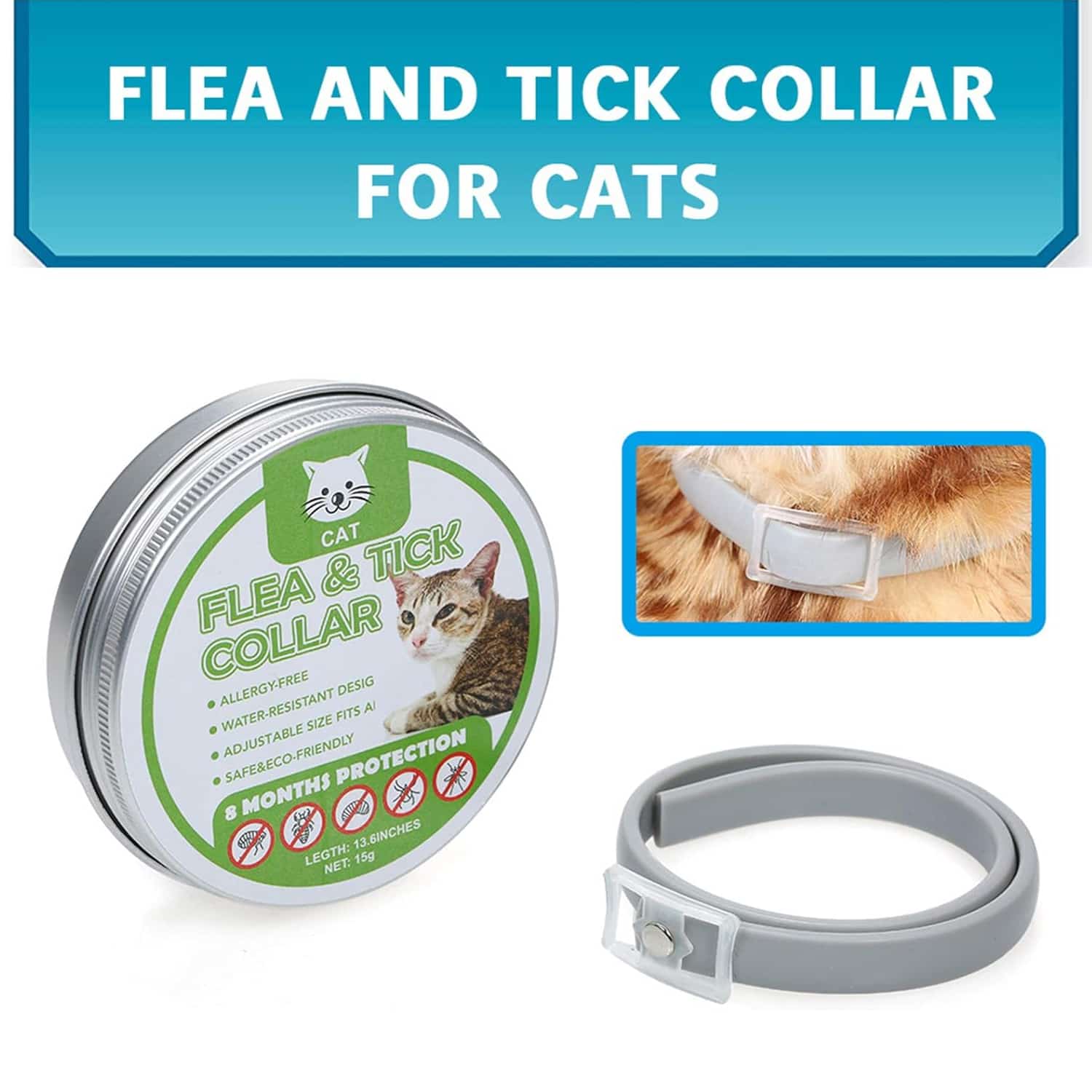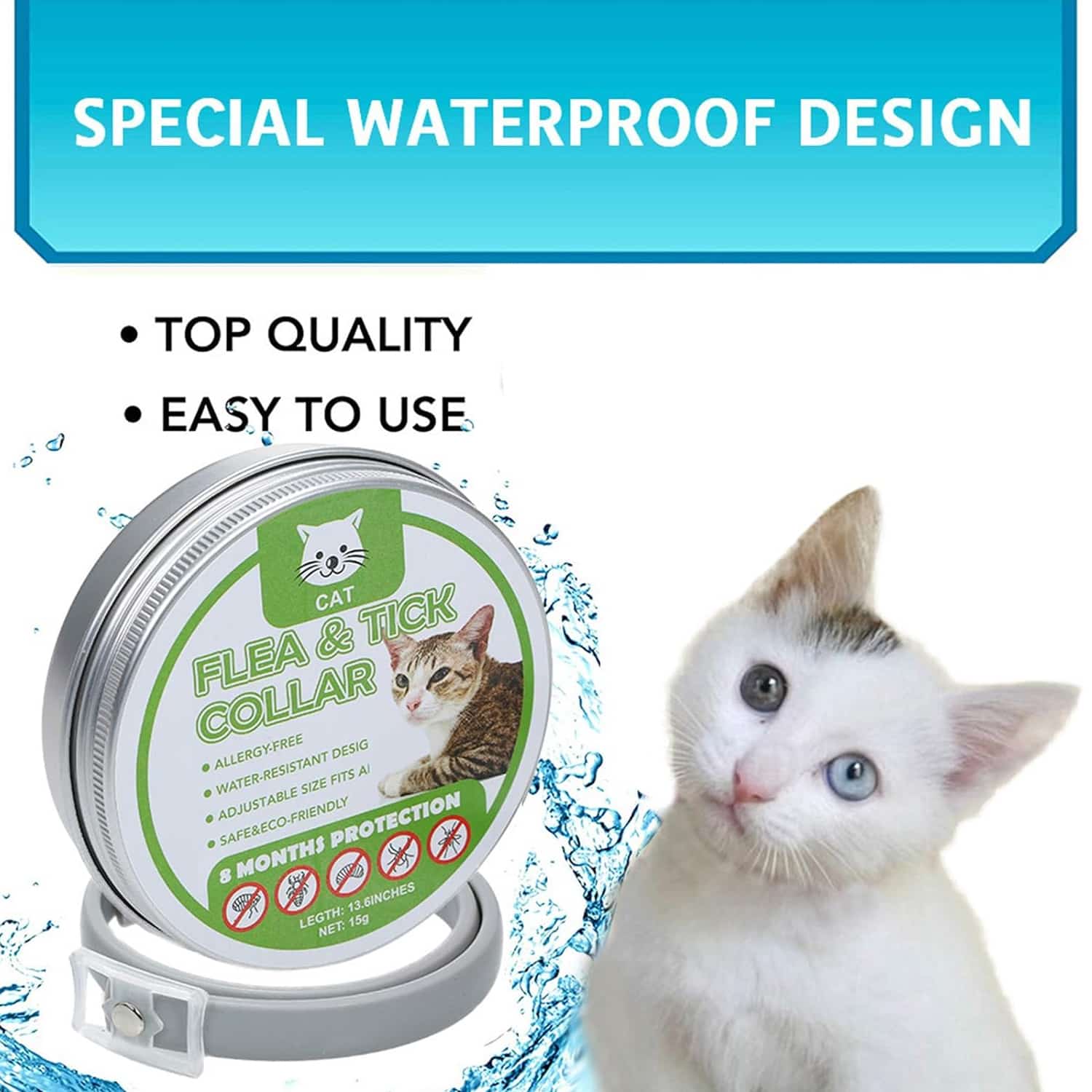 Cat flea and tick collar with natural essential oil formula that repels and kills fleas, ticks, larvae, and lice without synthetic pesticides. Unscented hypoallergenic, safe for sensitive cats including kittens, doesn’t cause irritation. Safe for households with children. Water-resistant design maintains effectiveness after rain, bathing, or moisture, no removal needed. Unlike topical treatments that wash away, collar continues working when wet. Provides up to 8 months of continuous prevention, eliminating monthly treatments. Prevents scratching, discomfort, disease transmission. 25-inch adjustable collar fits kittens and adult cats with secure buckle. Cut excess length for perfect fit preventing slipping. One-size-fits-all eliminates sizing guesswork.
