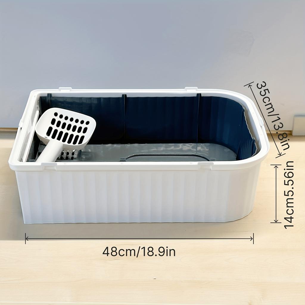 Accommodates clumping or crystal litter. Smooth plastic wipes clean. Integrated clip on side stores scoop preventing loss. Scoop included. Front entry door for comfortable access. Enclosed structure provides privacy. Dimensions 18.89 inches long by 13.78 inches wide by 14.17 inches tall fit bathrooms or closets. Black and white blends with decor. Non-toxic plastic. Ventilation slots prevent ammonia buildup. Suitable for cats up to 15 lbs.