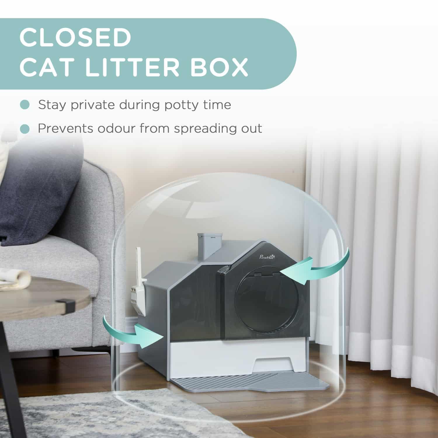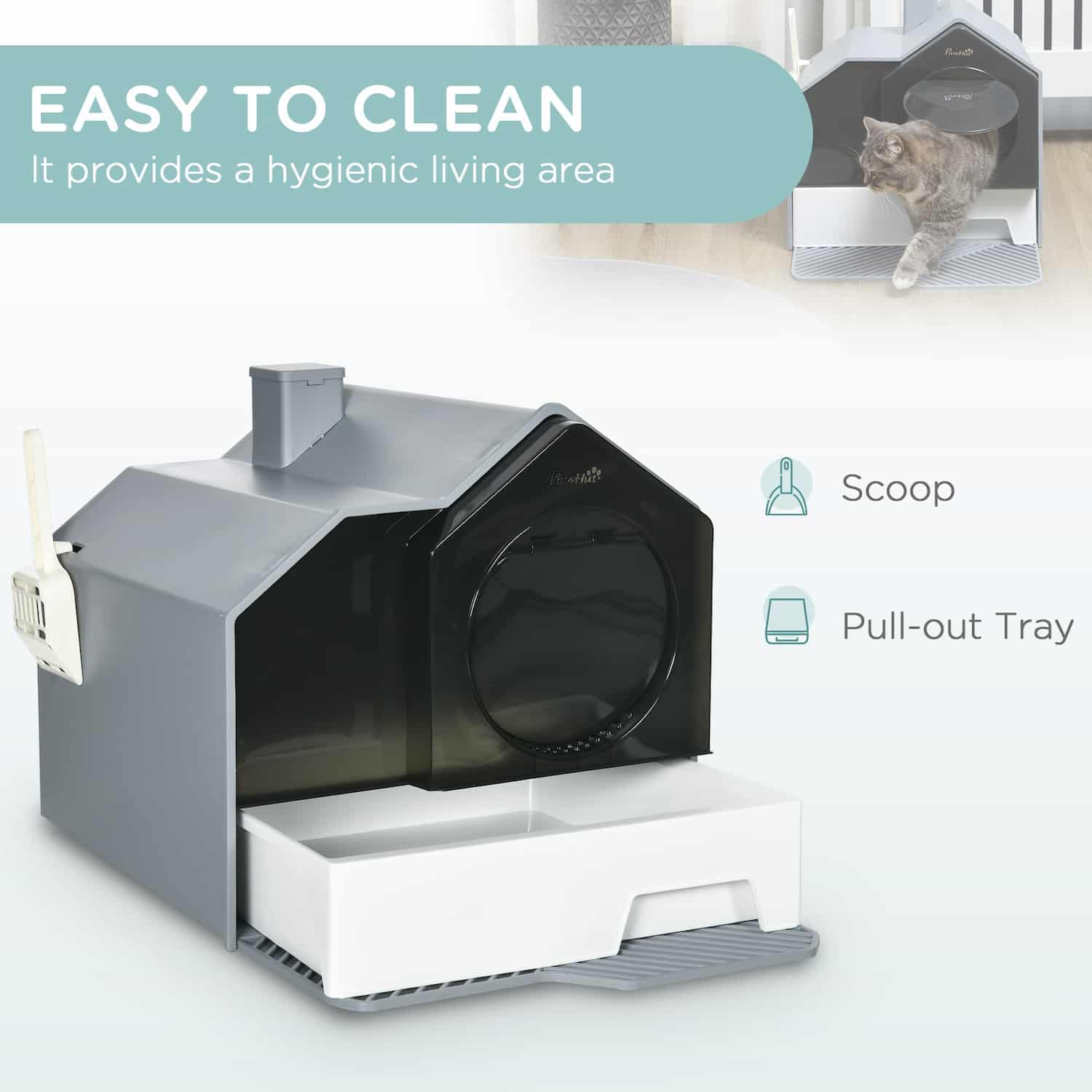Tray washes separately. Included scoop 8 inches long stores inside drawer or clips to exterior. Decorative chimney on roof functions as deodorizer holder. Insert two included pouches into chimney allowing air circulation through filters. Pouches neutralize ammonia and waste odors preventing room spread. Replace monthly for effectiveness.