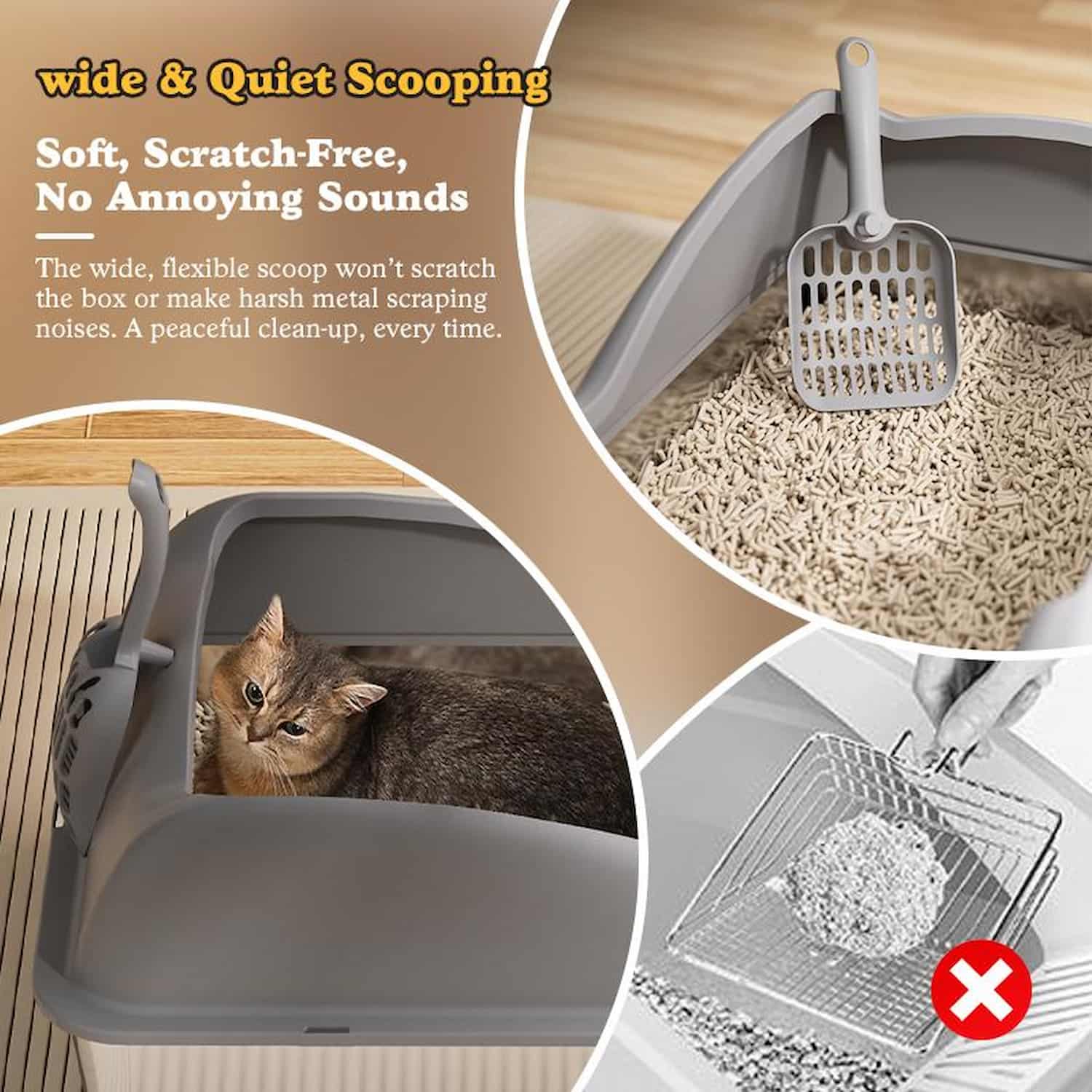 Grate optional for traditional scooping. Wide flexible scoop bends without scratching eliminating metal noise. Stores in tail cutout. Included textured mat at entrance traps litter from paws. Mat 15.75 inches wide matching box. Wide 5.91-inch entry for large cats. Open-top unrestricted access.