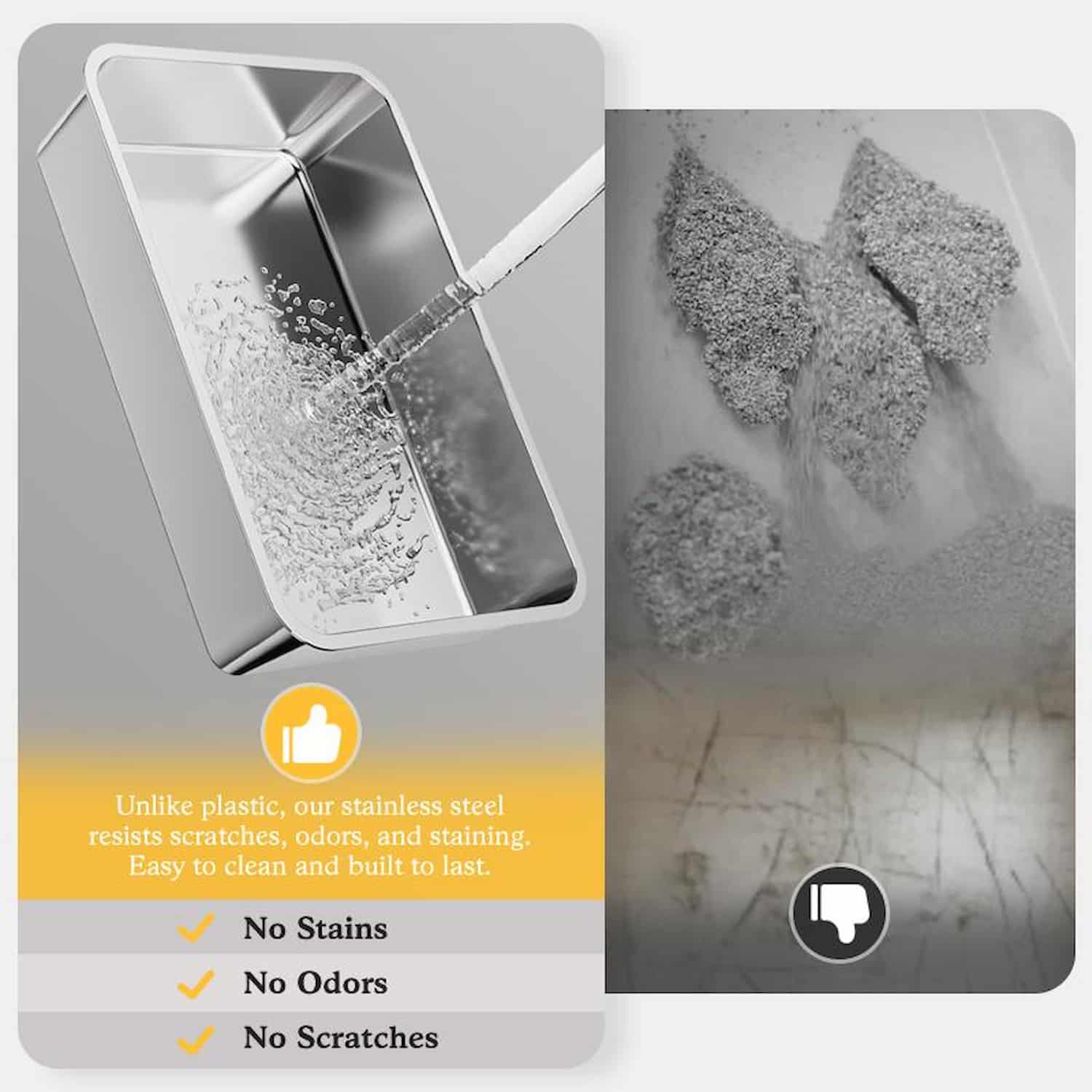Rinses clean eliminating residue buildup. Rust-resistant for long-term use. Spacious 23.62 x 15.75 x 11.22 inches. Perforated grate platform inserts allowing clean litter to sift while trapping waste. Lift grate to dispose of clumped waste without scooping entire box. Grate approximately 15.75 x 15 inches. Yellow decorative paw pads add interest.