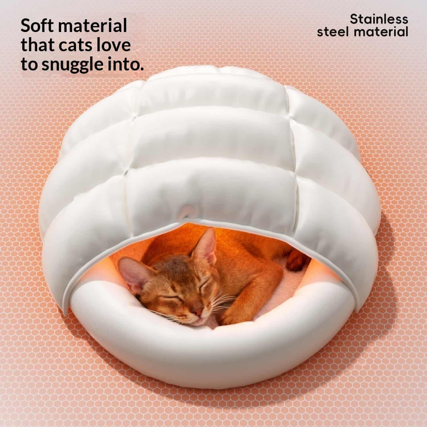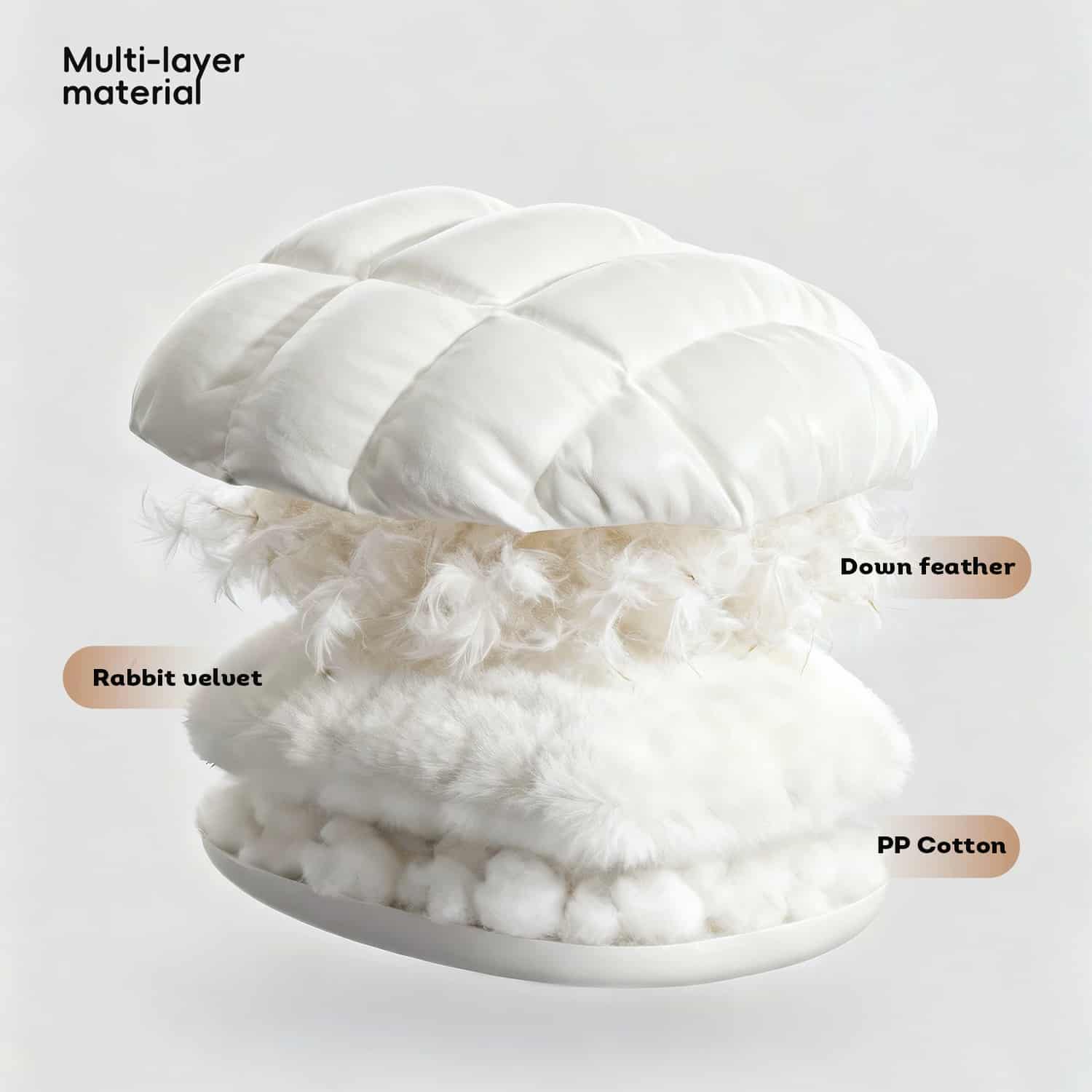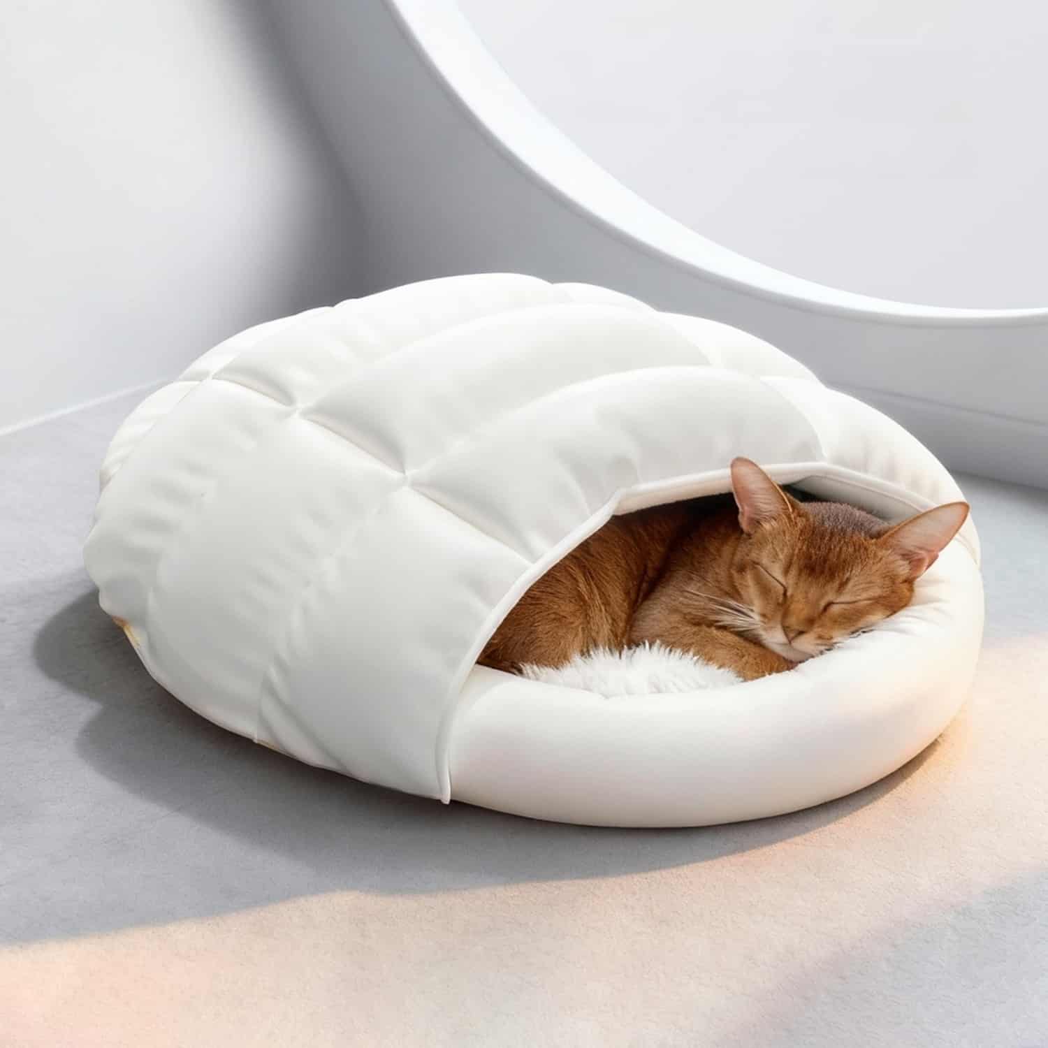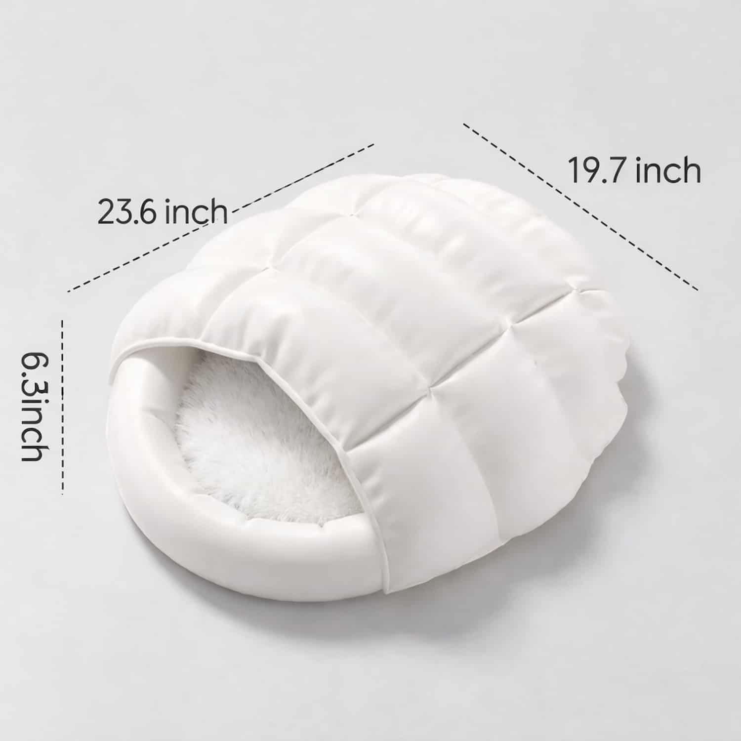 The down fill sits inside individual baffled chambers stitched across the bag surface, like a human down duvet, preventing the fill from shifting to the perimeter when the cat moves or kneads the fabric. Bags with single-chamber fill compress thin in the center where the cat actually sleeps, reducing insulation where it matters most.