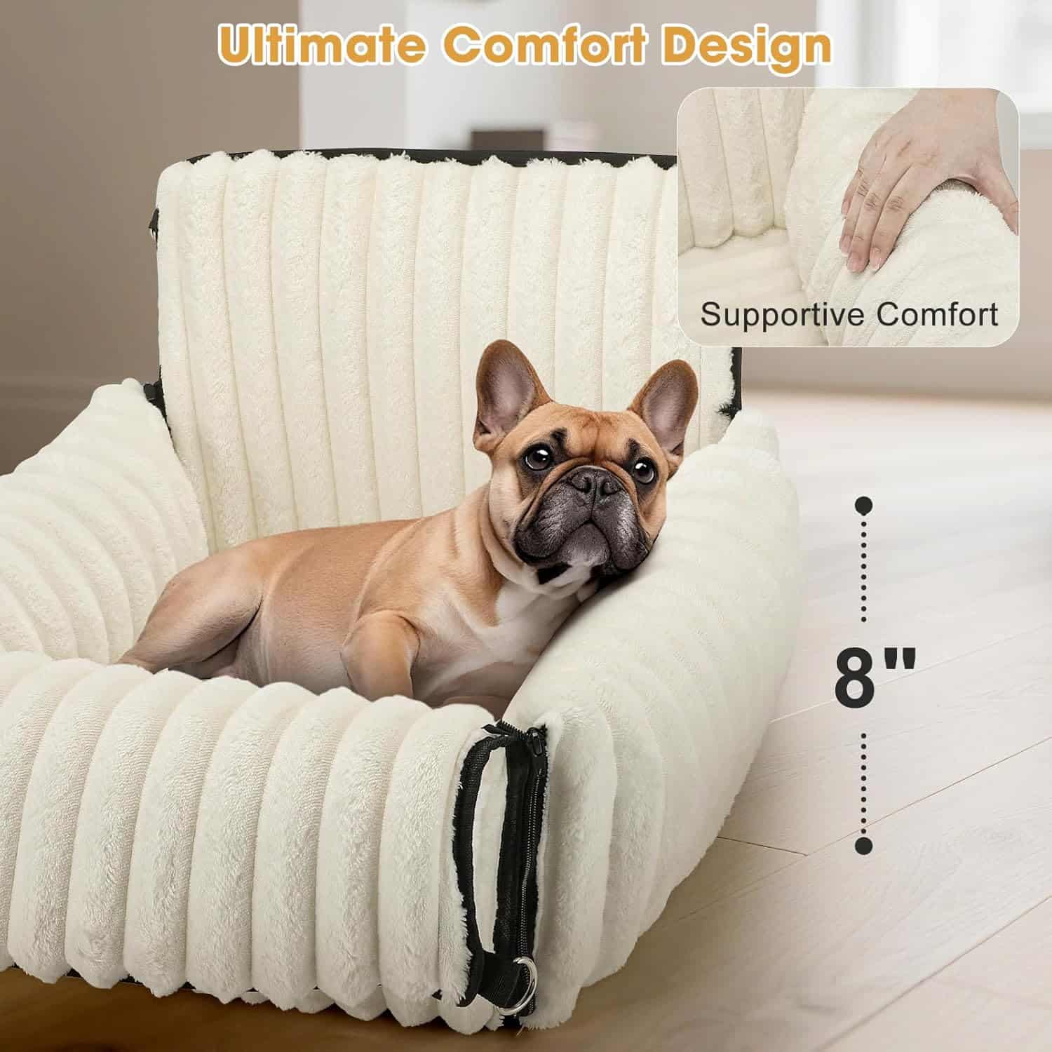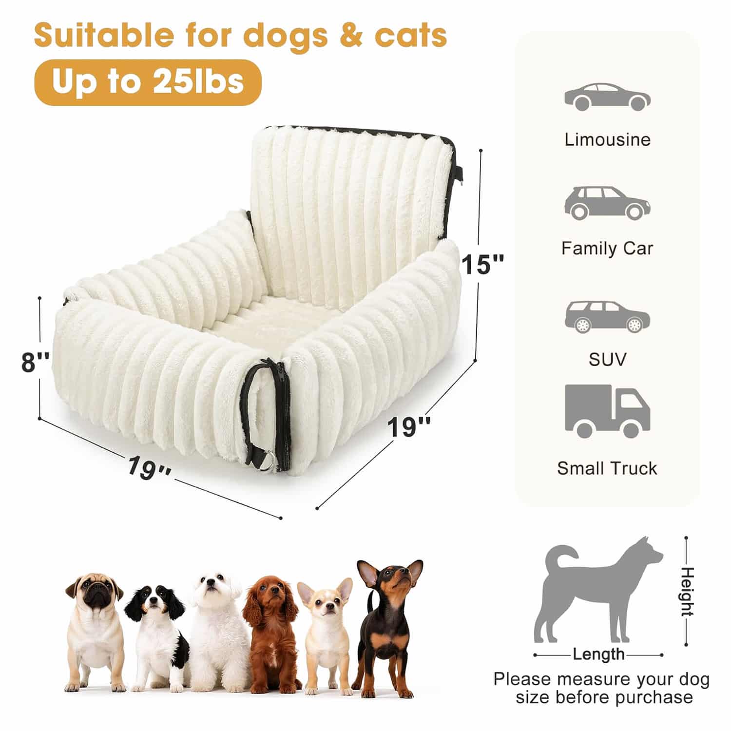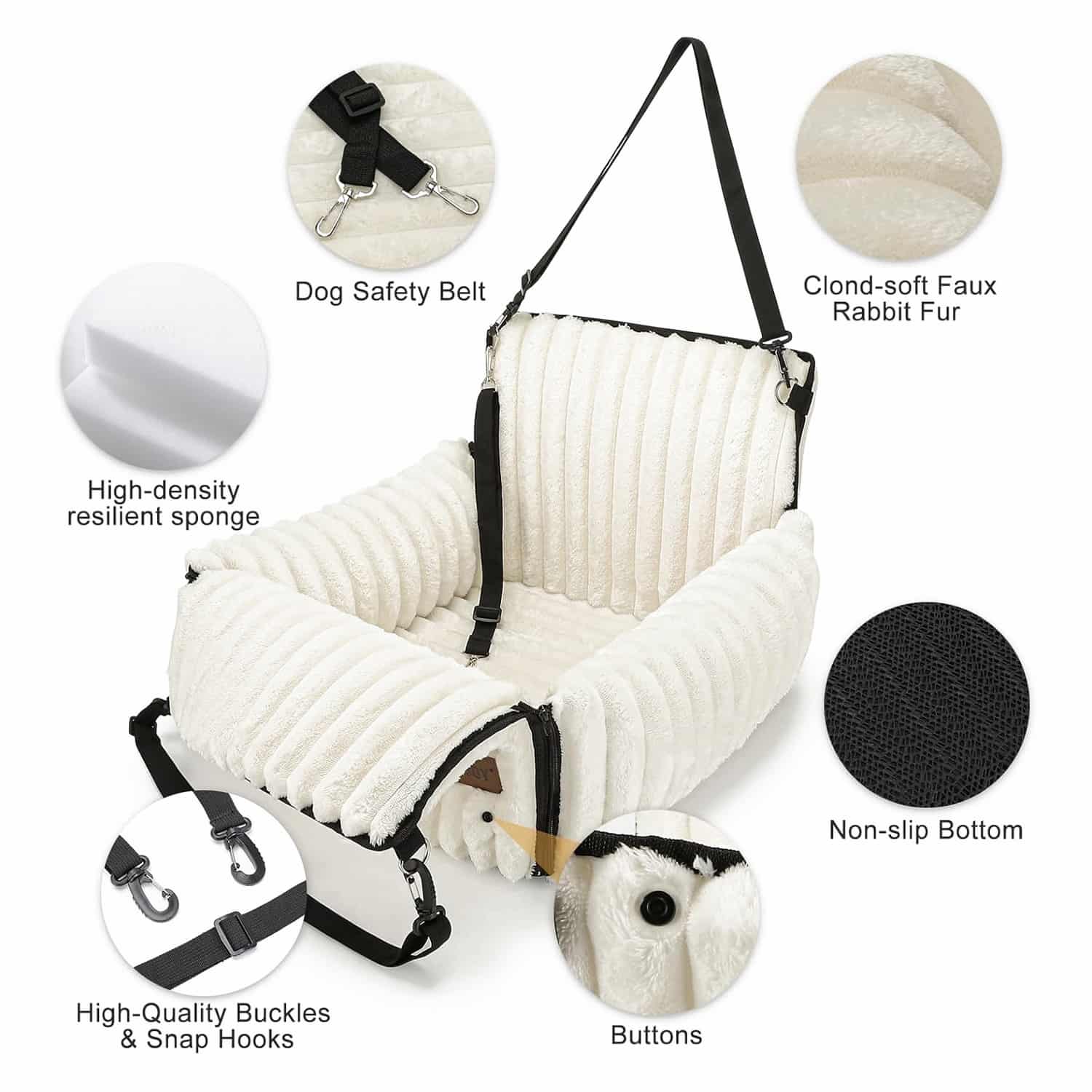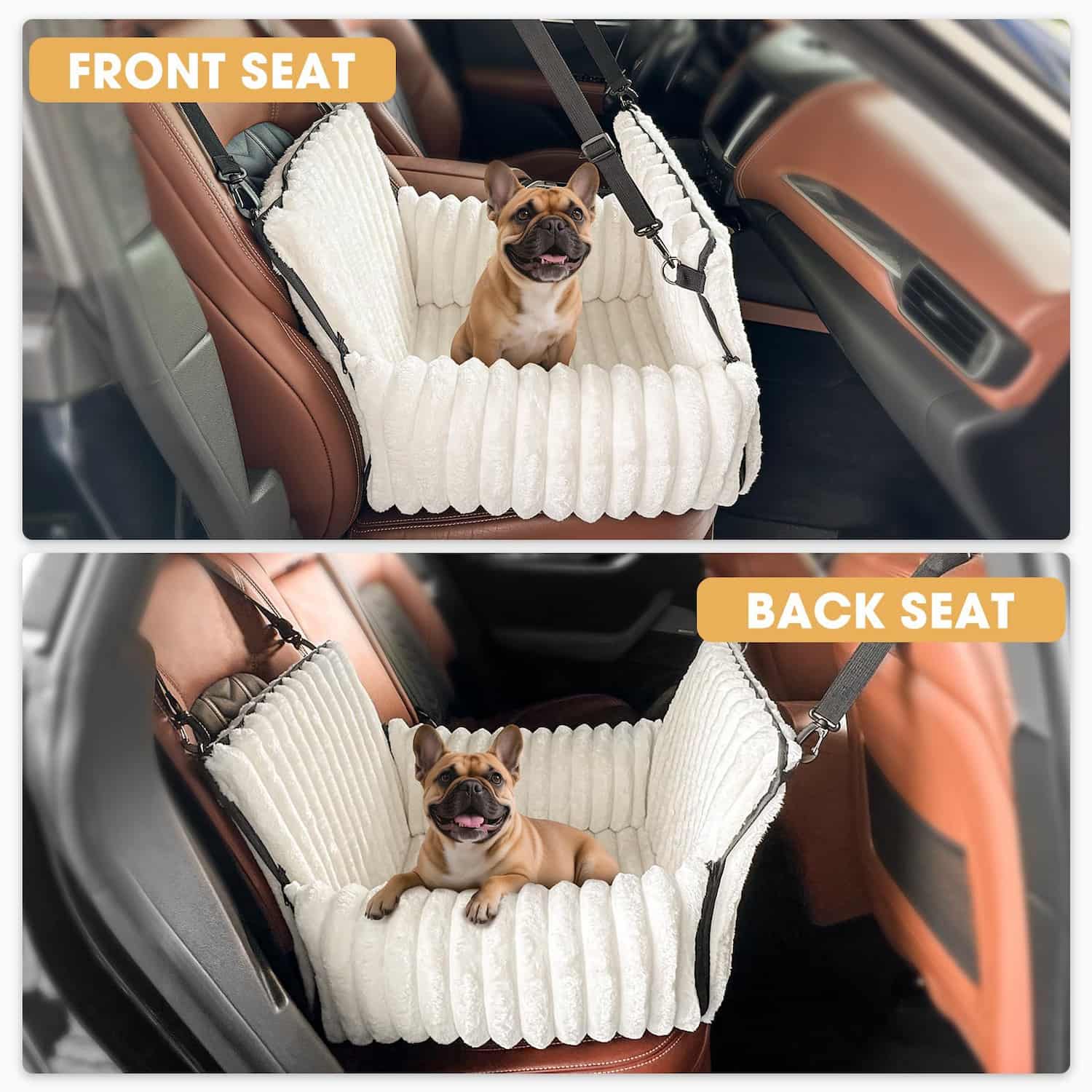 The only dog car seat that unzips into a flat home bed, replacing two products with one. Memory foam base (8 inches thick) and raised walls (4 inches) contour to your dog’s body for joint and spine support. Three quick release belts secure the seat to front seats, back seats, or trunk, with a short belt to clip your dog’s harness. Dual waterproof layers seal out urine and drool. Rubber anti slip bottom grips car upholstery and smooth floors. Removable foam insert for machine washing the cover. Measures 20 x 20 x 20 inches.