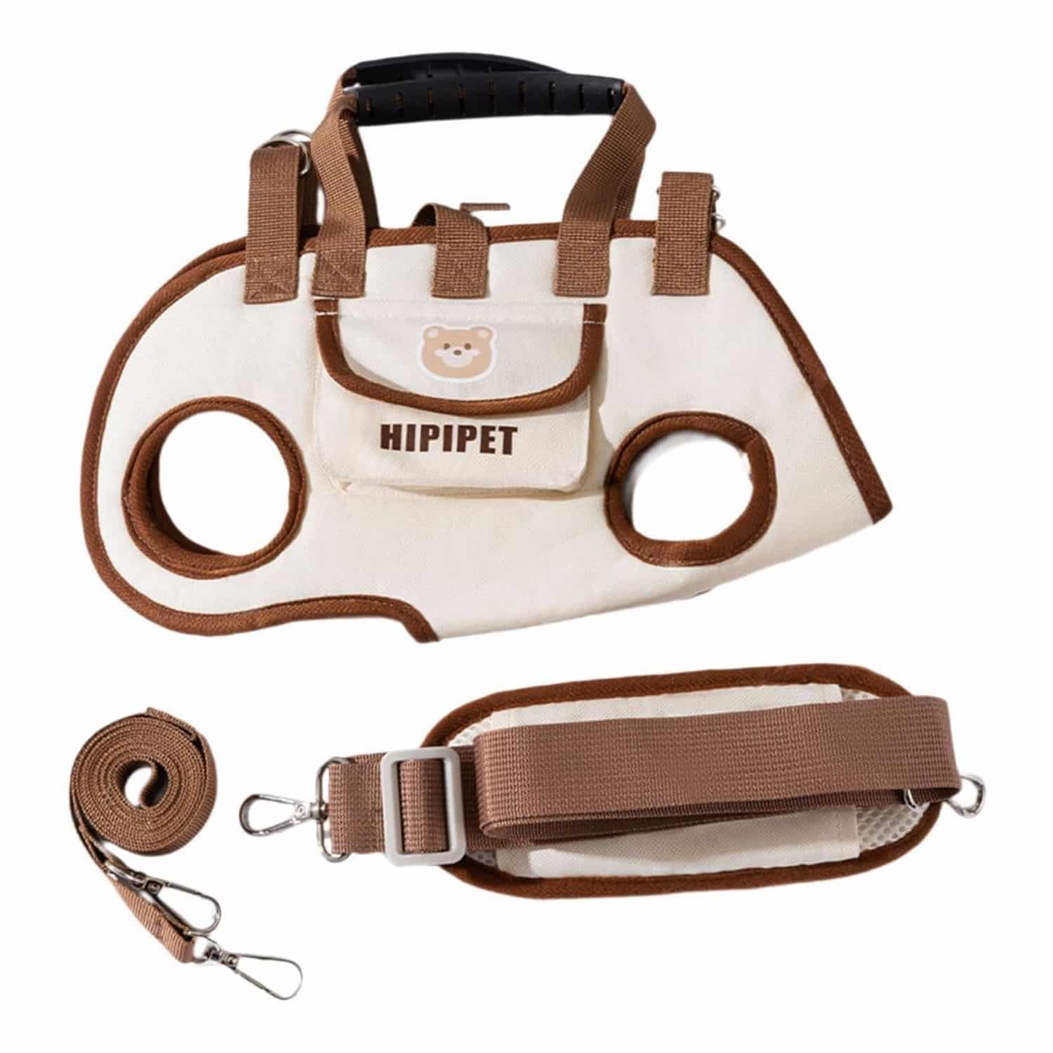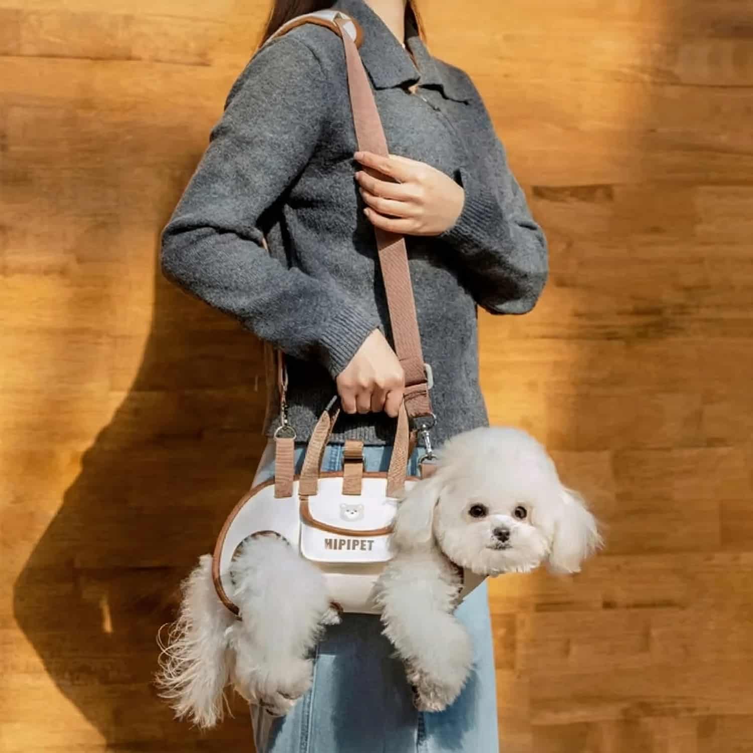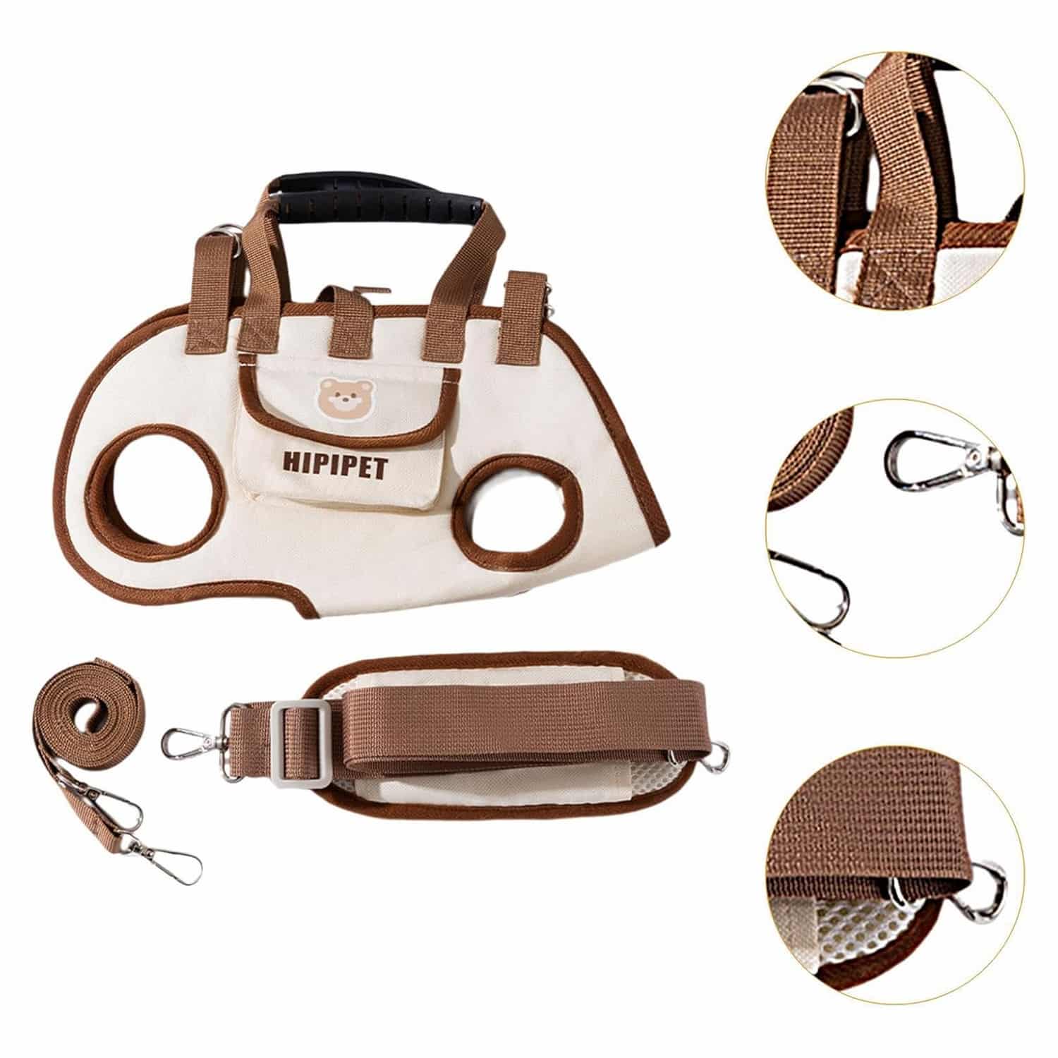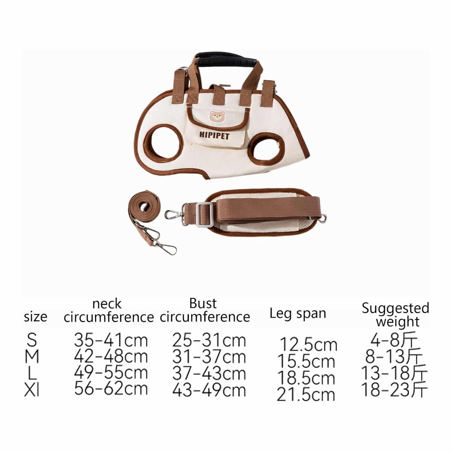 Dog carrier bag that converts between four modes: leash, hand carry, shoulder carry, and cross body sling. Horizontal design keeps your dog’s spine in a natural position with legs resting through padded openings. Three dimensional open structure allows airflow without trapping heat. Detachable thickened shoulder pad distributes weight on long walks. Side pocket for treats or waste bags. Four sizes fit dogs from 4.4 to 25 lbs with adjustable buckles for neck and chest. Canvas exterior with brown trim.