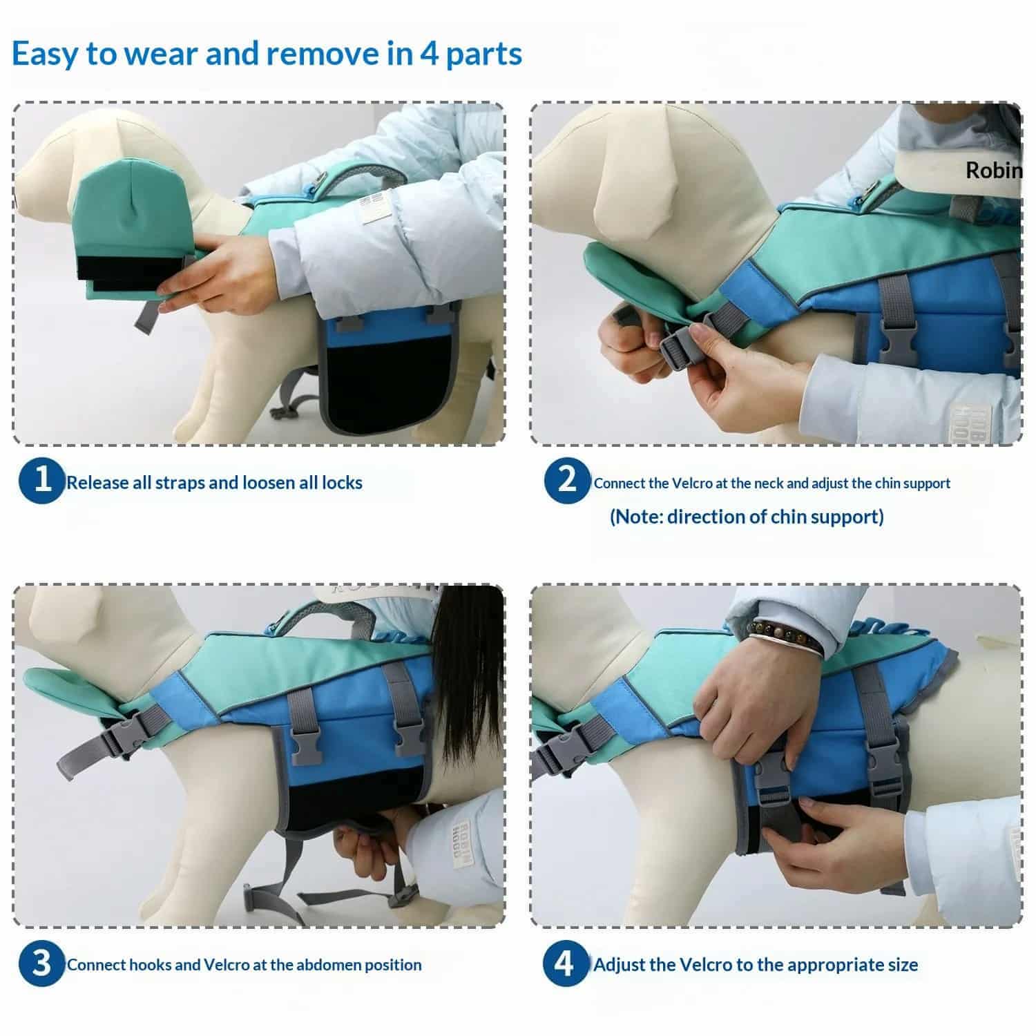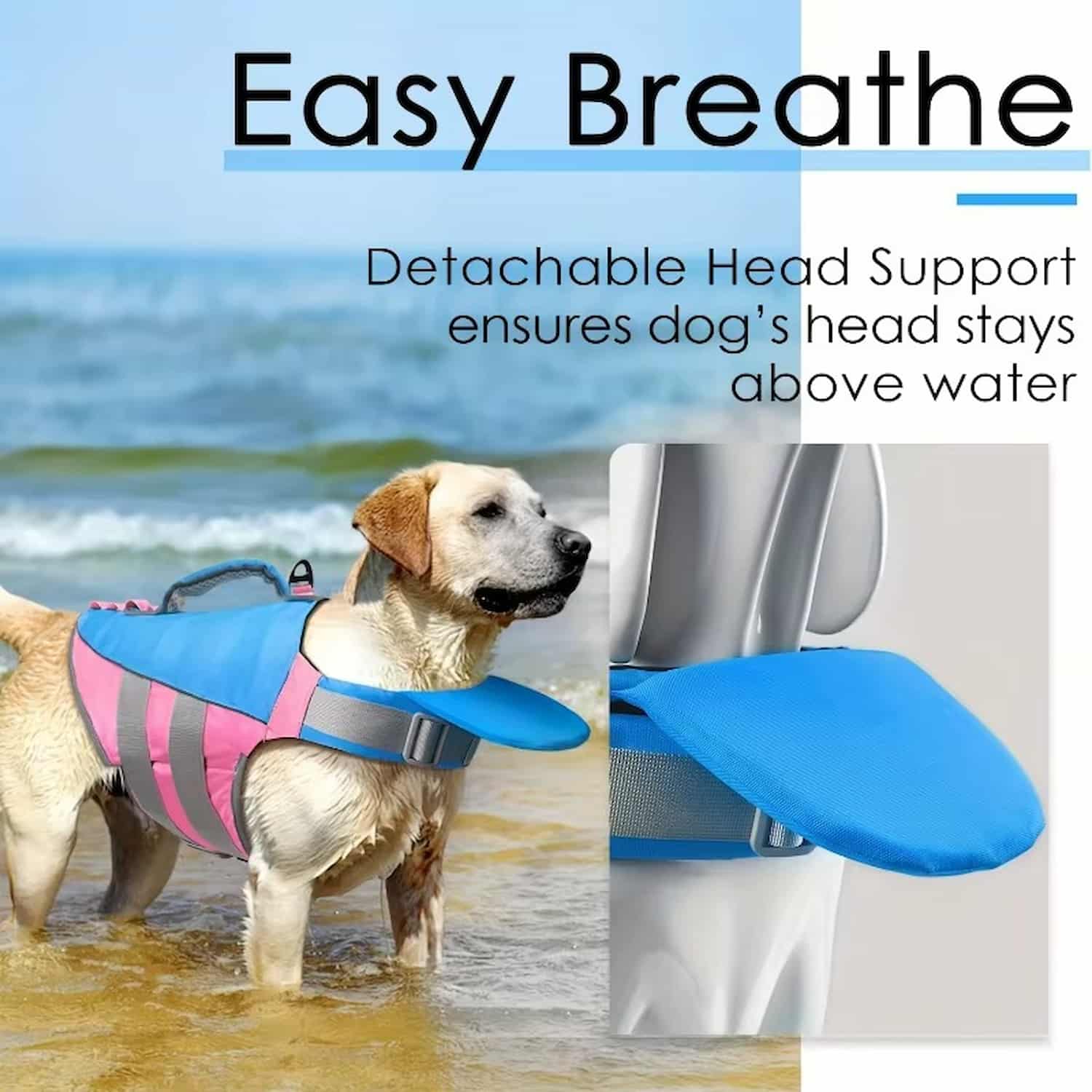 Dog life jacket with ergonomic grab handle and reflective strips for safe retrieval and night visibility.