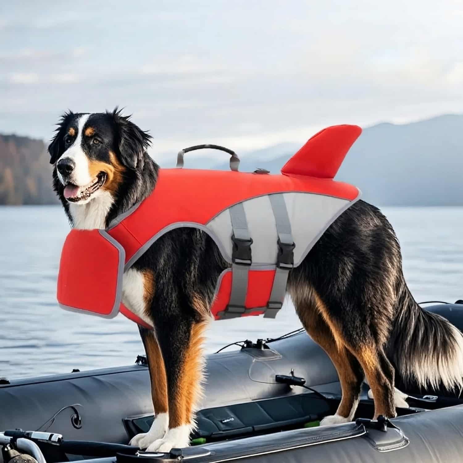 Side fins and the top dorsal fin are padded buoyancy panels that spread flotation across the body. They detach when your dog builds confidence in the water and no longer needs the extra lift. The shark fin silhouette also makes your dog visible from a distance in lakes, rivers, and open water.