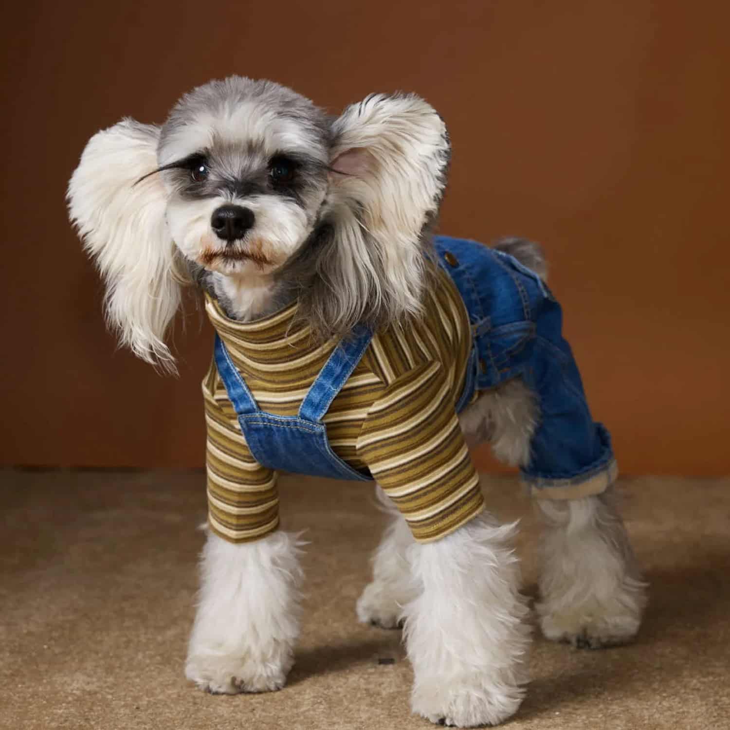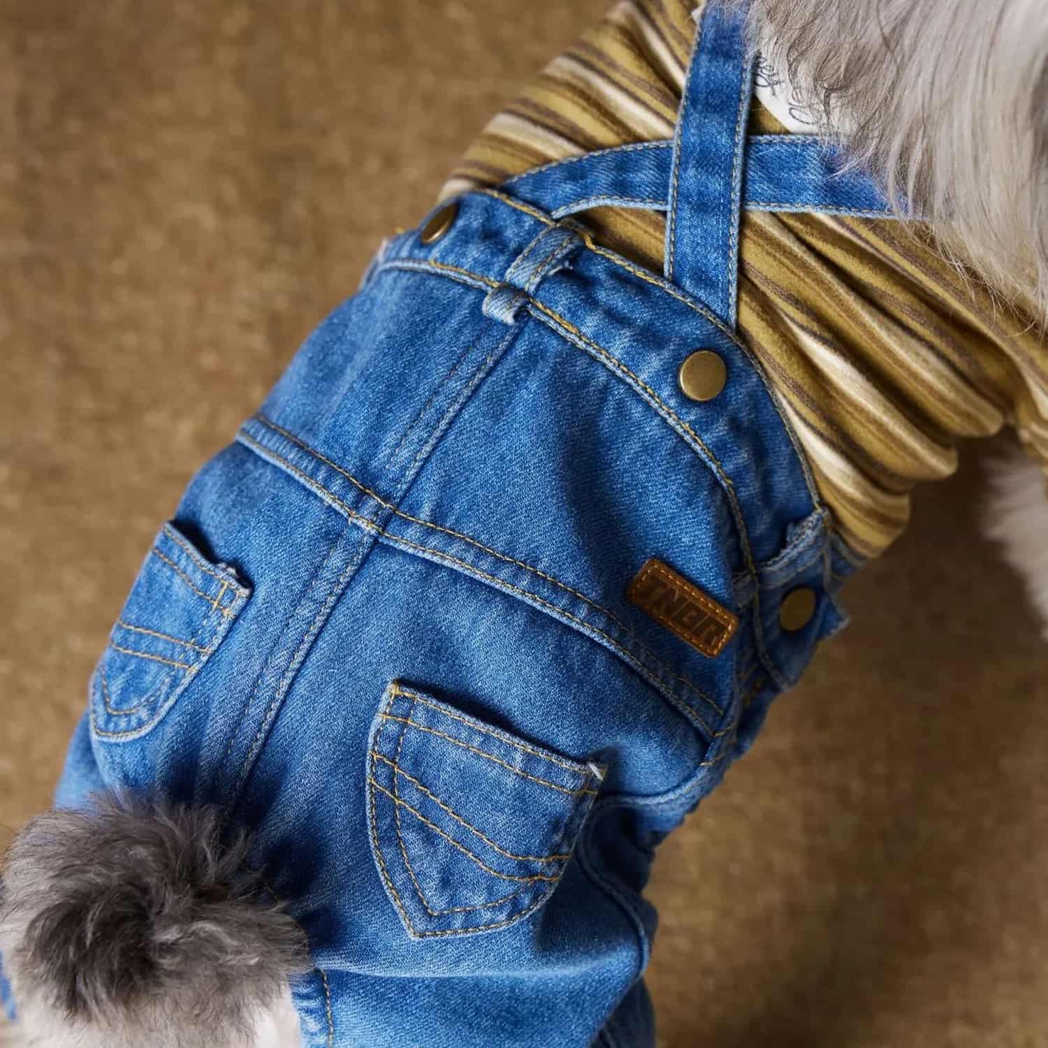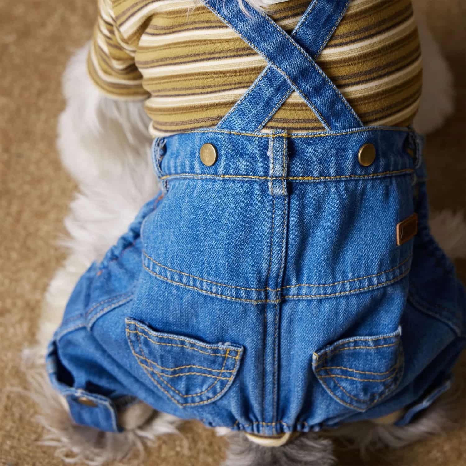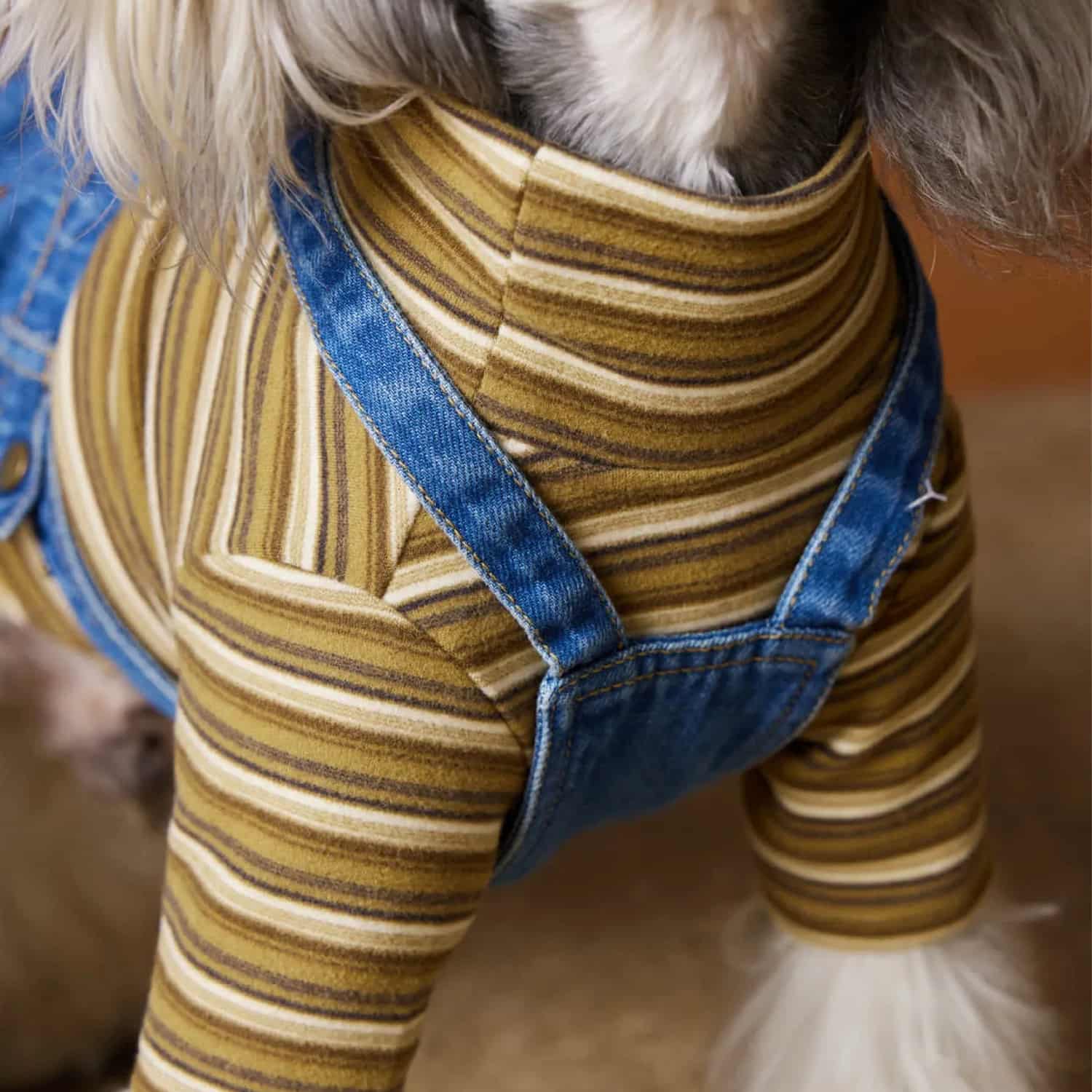 Two-piece outfit with fleece-lined denim overalls and mustard striped long-sleeve shirt, adjustable X-back suspender straps, back pockets with stitching, elastic leg cuffs, 6 sizes XS to XXL for small dogs. Polar fleece interior bonded to denim creates warm layer for 35-50°F. Soft fleece comfortable without irritation. Denim provides wind resistance. Thickness cushions joints. Two-piece allows mixing with other tops or wearing overalls alone. Mustard and white horizontal striped top with four-leg sleeves covers all limbs. Turtleneck protects throat. Retro aesthetic coordinates with denim.