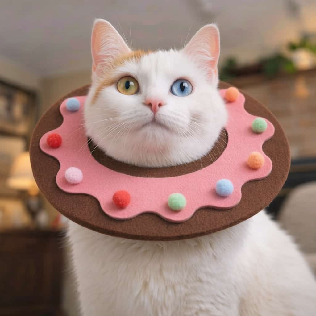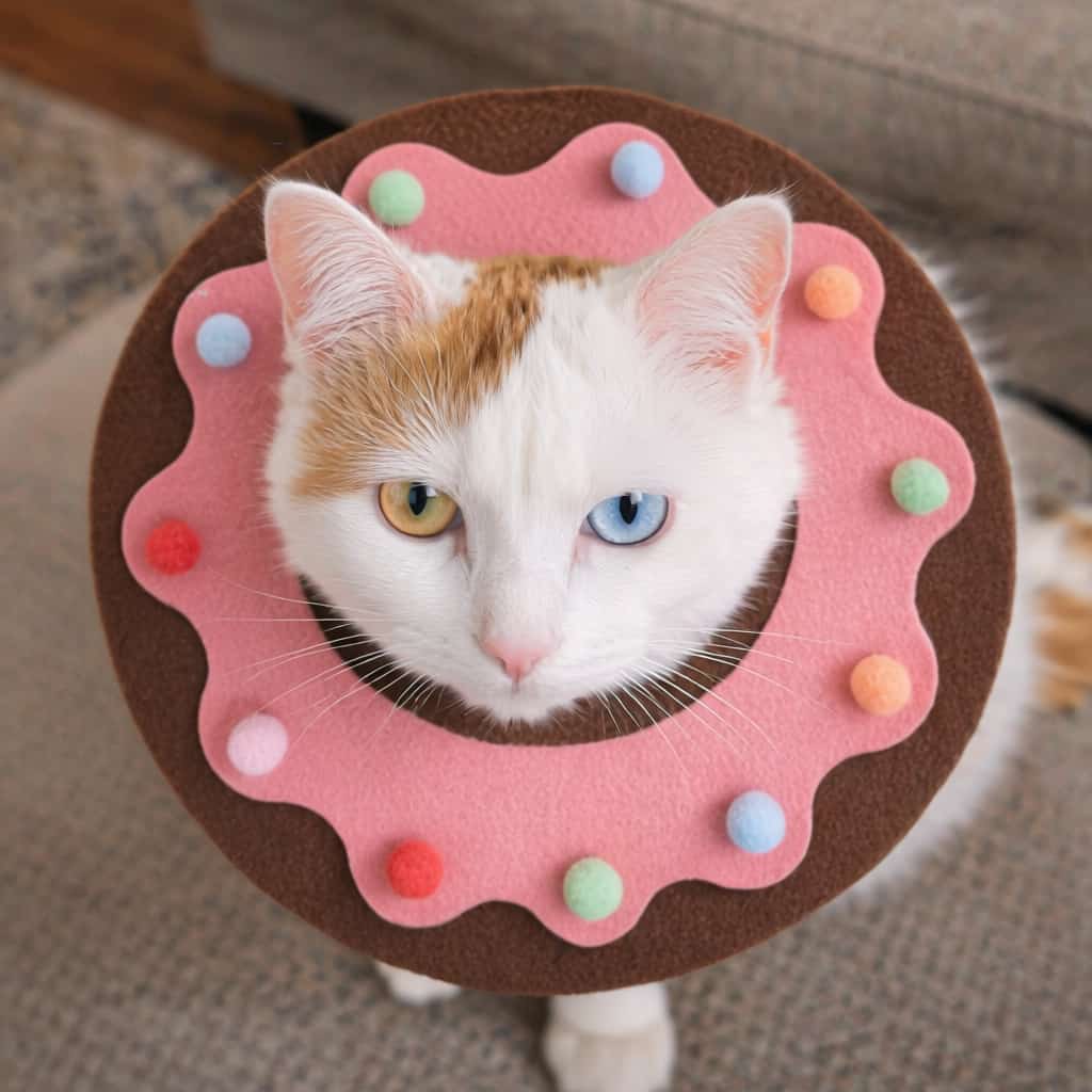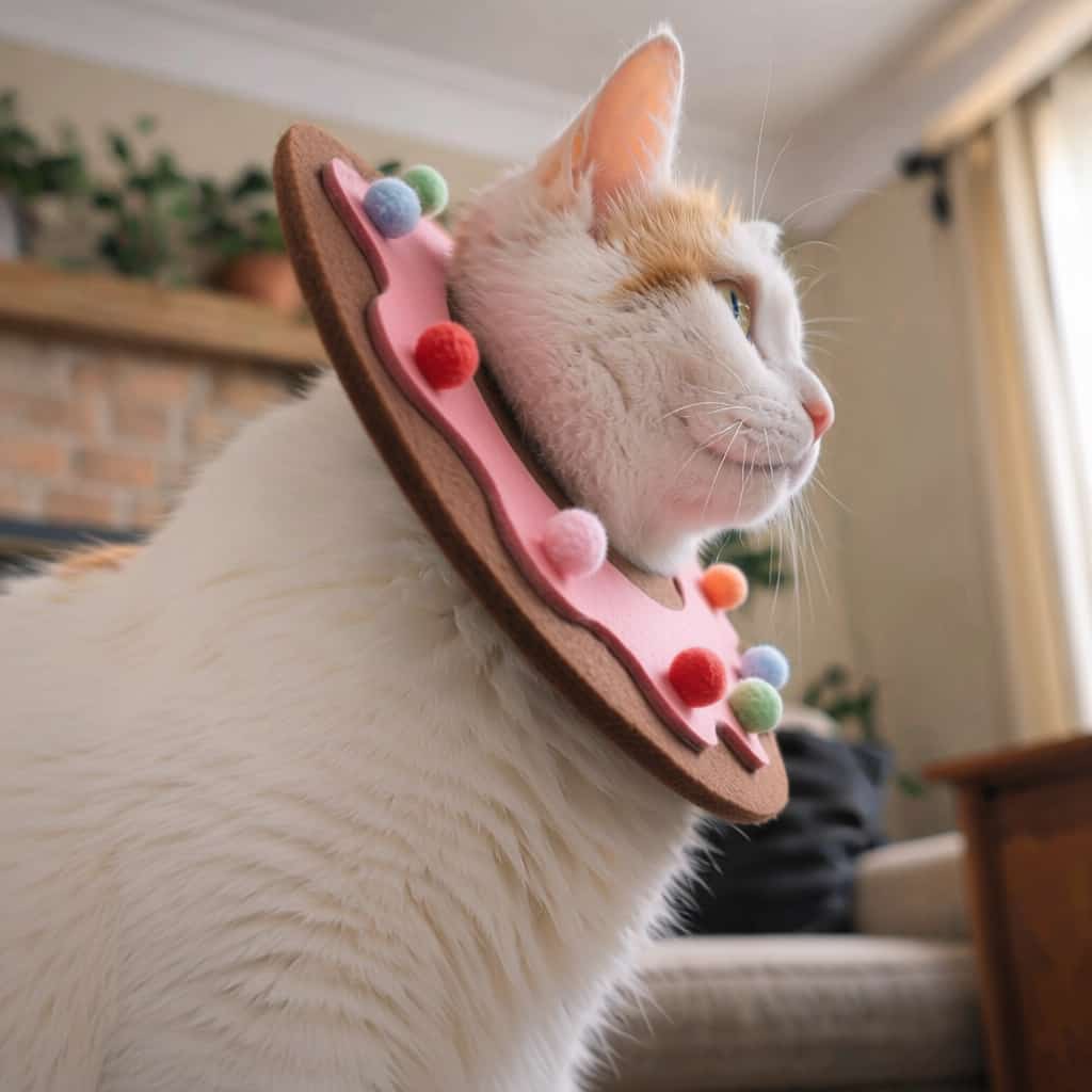 Recovery collar with cushioned felt construction that blocks access to wounds without hard plastic edges that bump furniture. Donut shape prevents licking surgical sites while allowing normal vision and head movement. Soft fabric won’t scratch healing skin or cause irritation around stitches. Adjustable fastening fits cats and small dogs without slipping or choking. Lightweight design prevents neck strain during extended post-surgery wear. Colorful sprinkle pattern reduces recovery stress. Removable for cleaning.