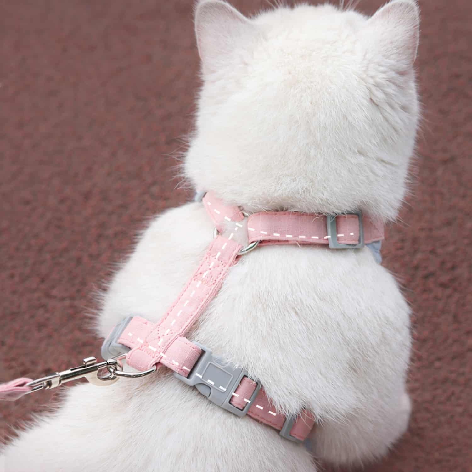 Back-mounted metal D-ring swivels as your cat turns, preventing leash from twisting. Reinforced stitching at attachment point holds pulling cats without tearing. Works with any standard leash. Matching leash set available for coordinated look.