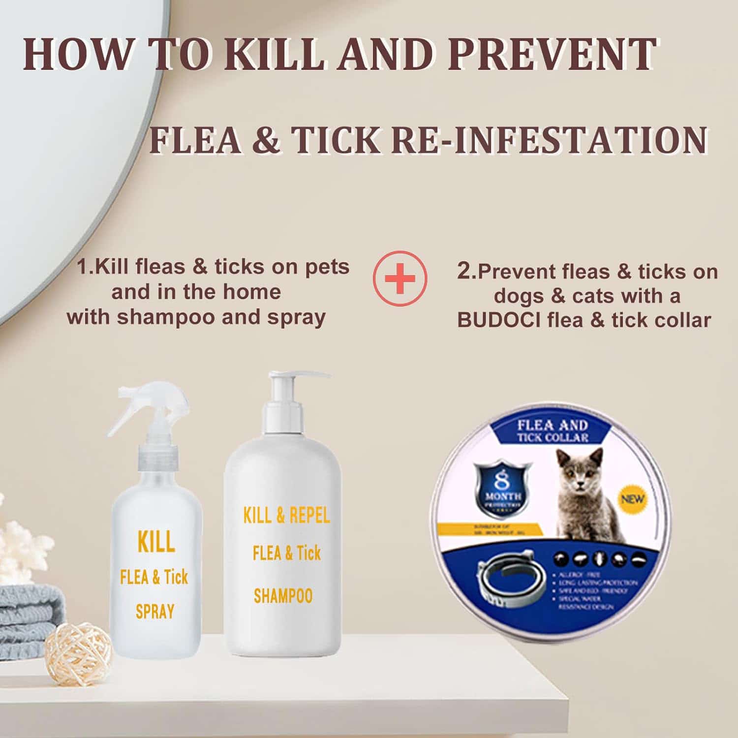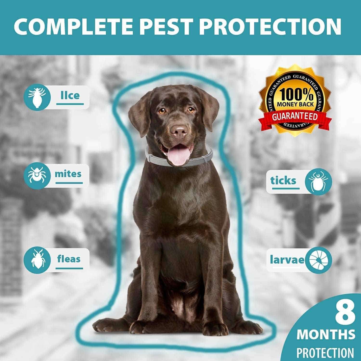 Flea and tick collar with 24/7 protection for up to 8 months, eliminating monthly treatments.