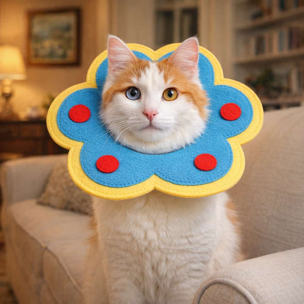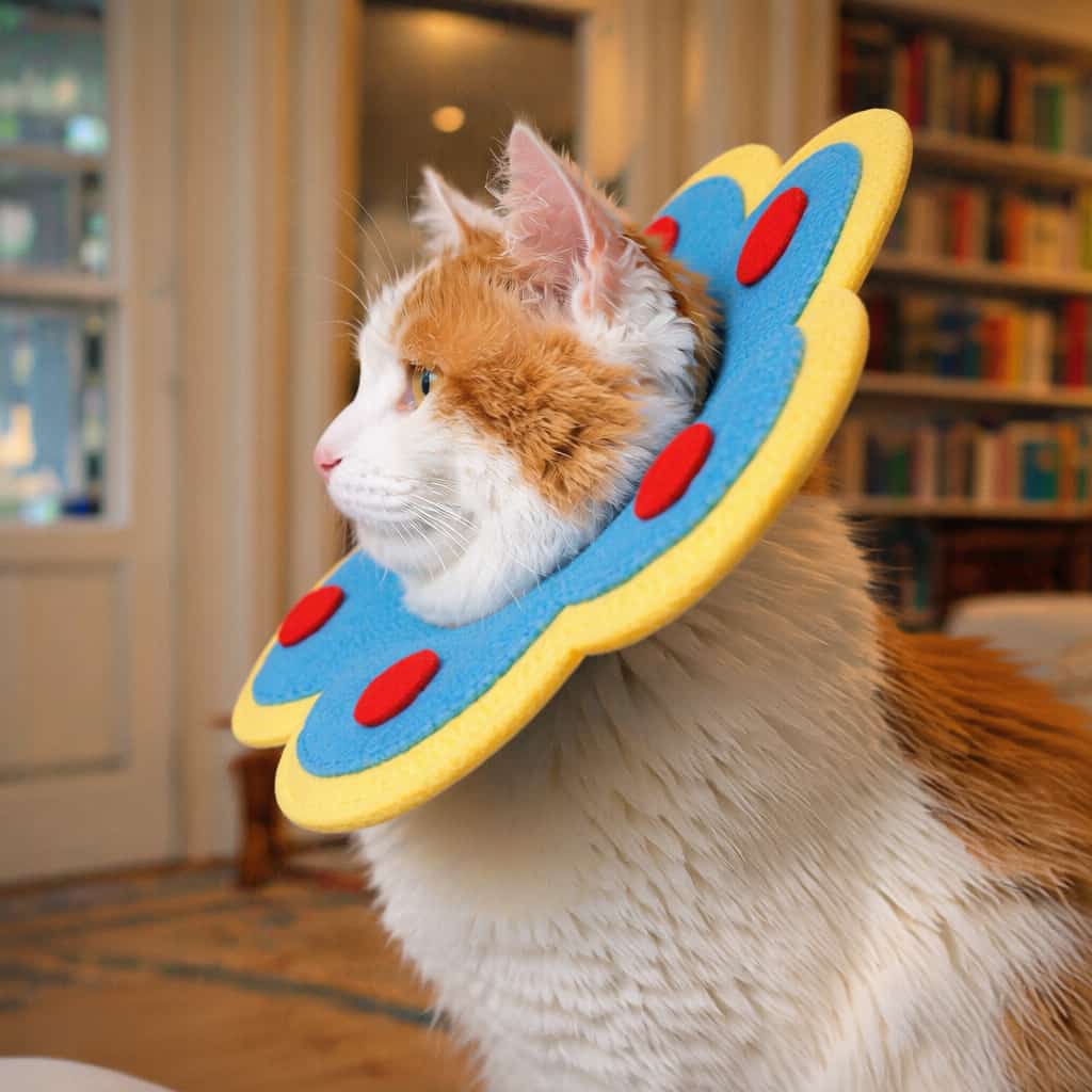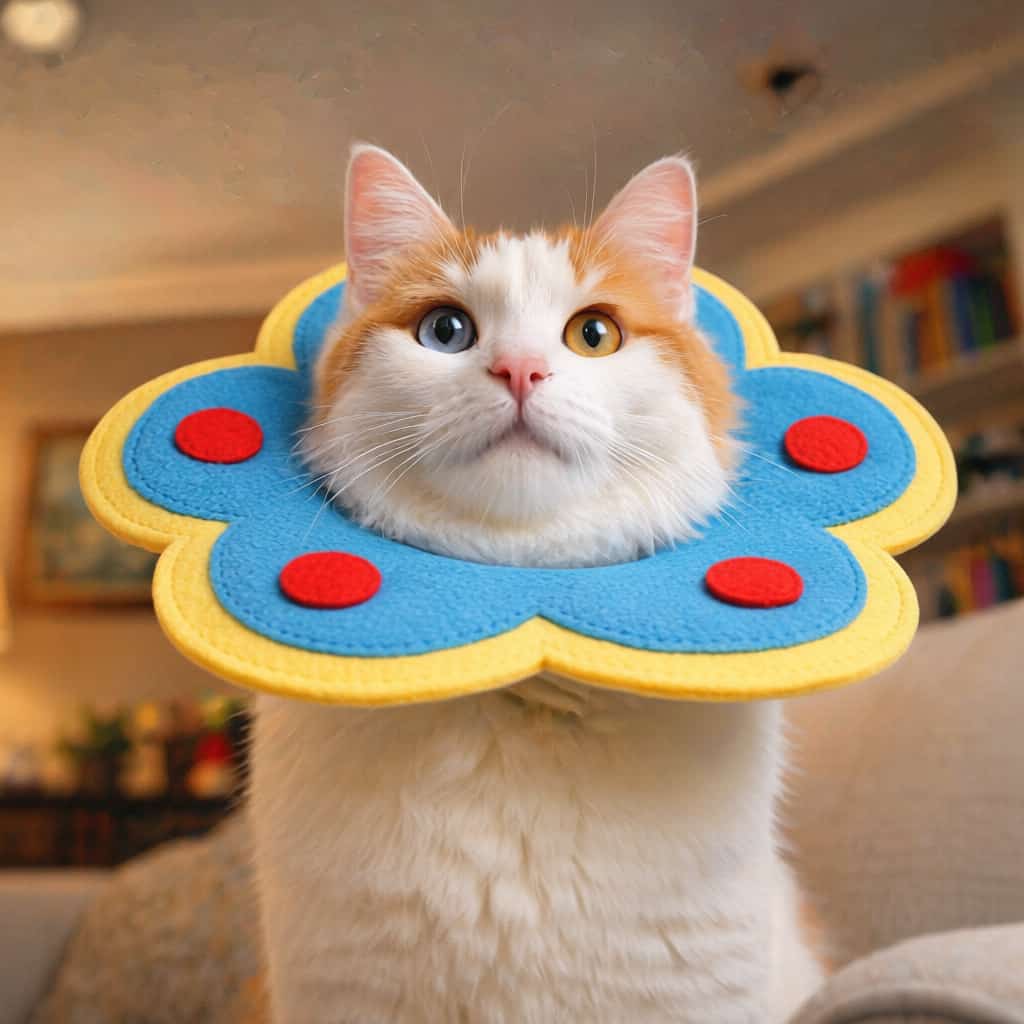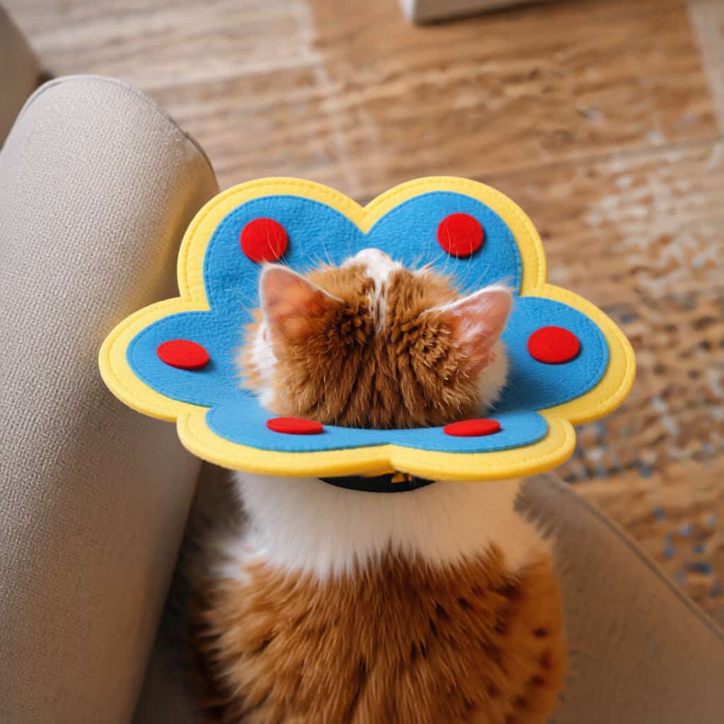 Recovery collar with flower-shaped felt construction that blocks wound access without hard plastic edges that bump furniture or doorways. Soft fabric won’t scratch healing skin around stitches or hot spots. Allows normal vision and head movement, reducing anxiety during recovery. Adjustable fastening fits cats and small dog breeds without slipping or choking. Lightweight design prevents neck strain during extended post-surgery wear. Bright blue and yellow colors reduce recovery stress. Removable for cleaning.