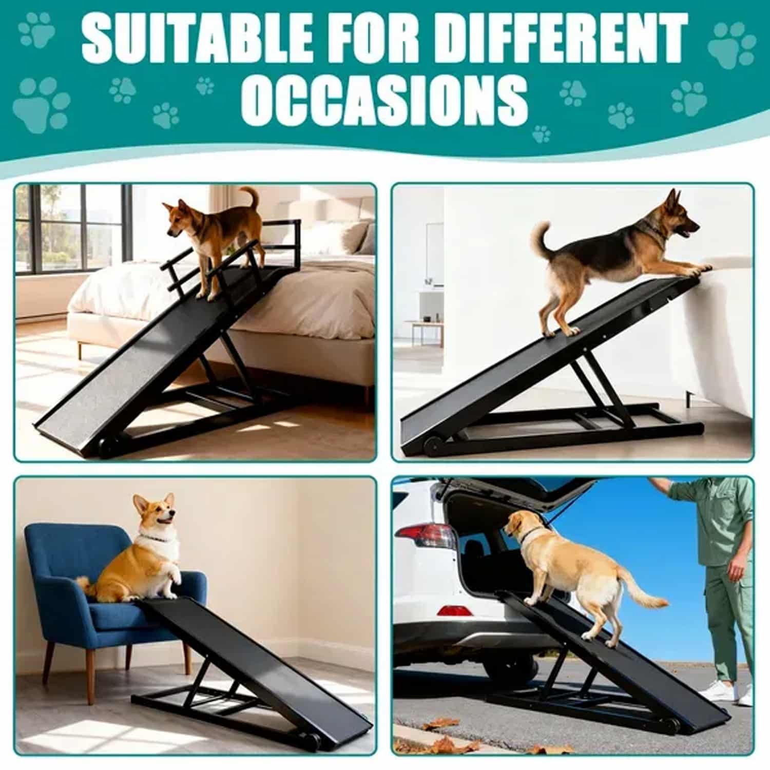 The only folding dog ramp with six adjustable heights that accommodates beds, couches, and cars, plus textured rubber surface that prevents senior dogs from slipping.