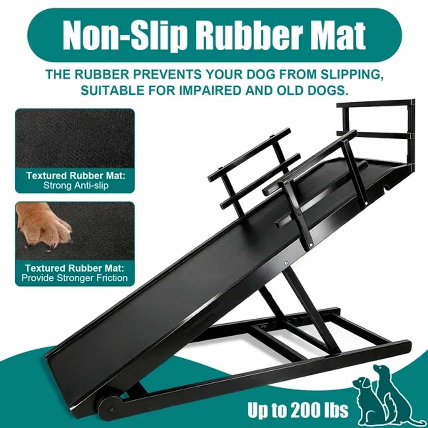 Non-slip rubber mat with raised texture provides friction for arthritic or weak-legged dogs. Surface stays grippy when wet from rain or snow. Bottom rubber pads prevent ramp from sliding on hardwood or tile floors during use.