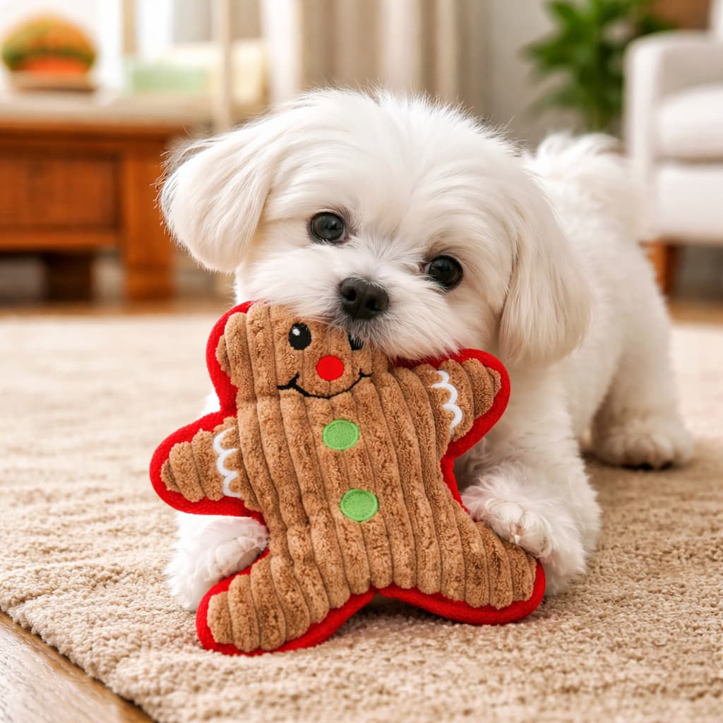 A corduroy gingerbread plush with raised ridges that scrape plaque during chewing, delaying $300-800 veterinary dental cleanings requiring anesthesia. Internal squeaker redirects dogs from tinsel and ribbon that cause $2,000-5,000 intestinal blockage surgeries. Soft PP cotton filling prevents tooth fractures requiring $800-$2,500 repairs, safe for puppies, seniors, and small breeds under 30 lbs. Reinforced double stitching withstands light chewers and tug games. Machine washable on gentle cycle, quick-drying prevents mold. Lightweight for indoor winter fetch. Works year-round after holidays. Not for aggressive destroyers.