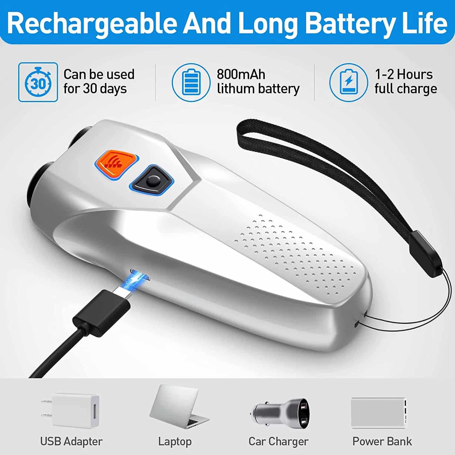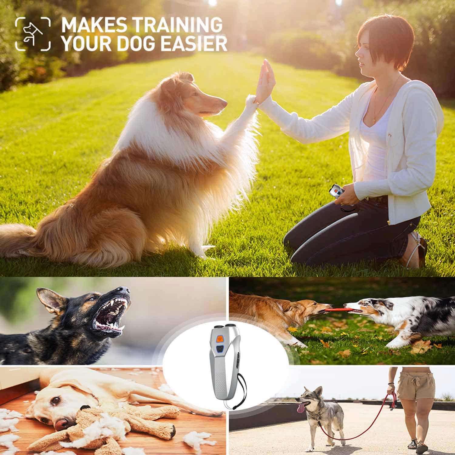 Handheld ultrasonic bark deterrent with dual speakers and two dedicated modes. Deterrent mode fires high intensity ultrasound with flashing light to drive aggressive or stray dogs away. Training mode emits lower intensity pulses to correct barking, biting, jumping, and other unwanted behaviors. Dual speakers reach 25 ft at 20 to 25 kHz, inaudible to humans. Built in LED flashlight with continuous on mode for night walks. 1000mAh USB rechargeable battery lasts about 30 days. Anti misfire lock prevents pocket activation. Includes wrist strap and charging cable. Safe for all breeds 6 months and older.
