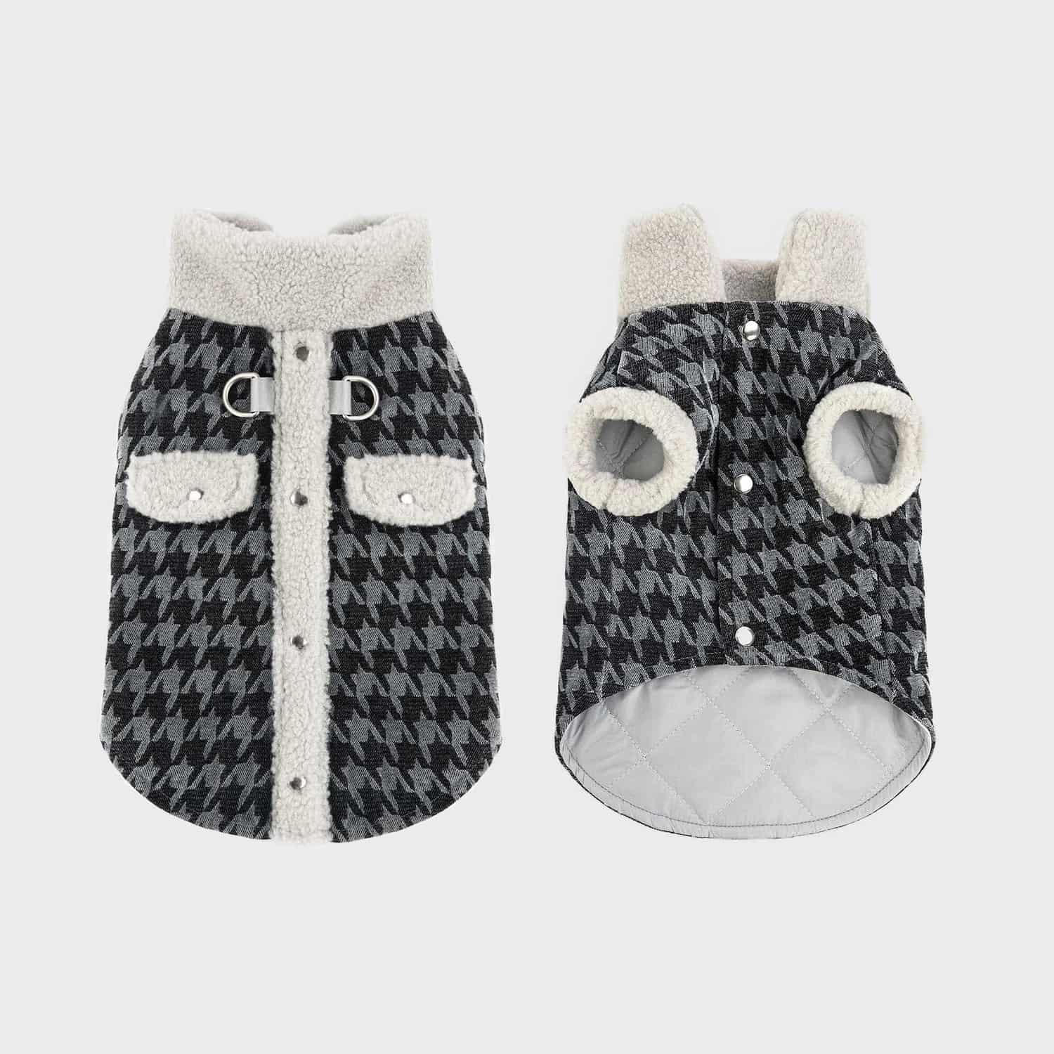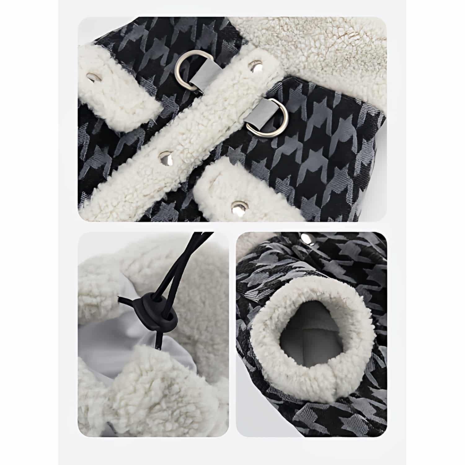 Houndstooth dog jacket with sherpa-lined hood and two-leg design.