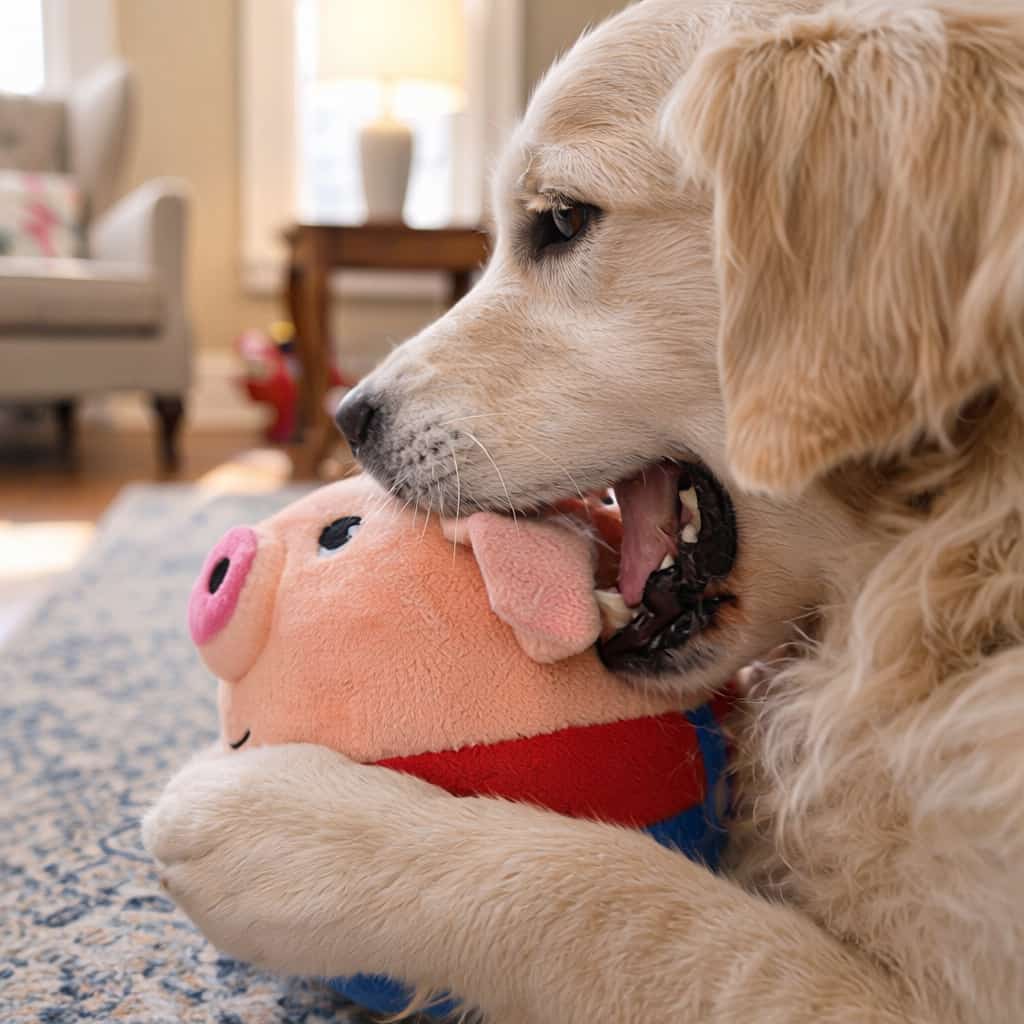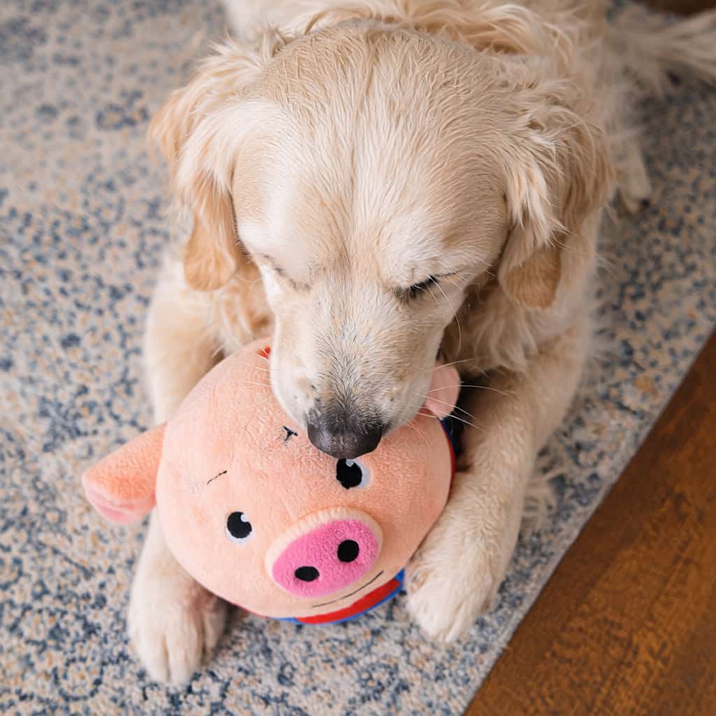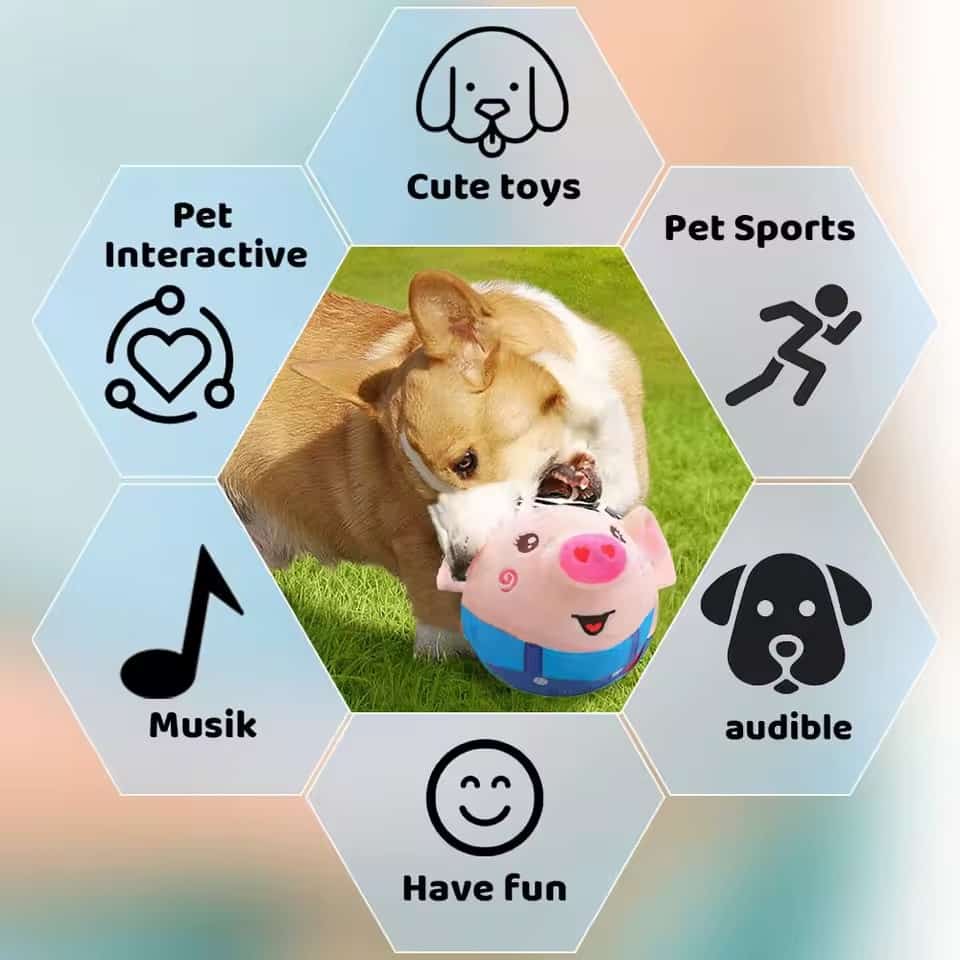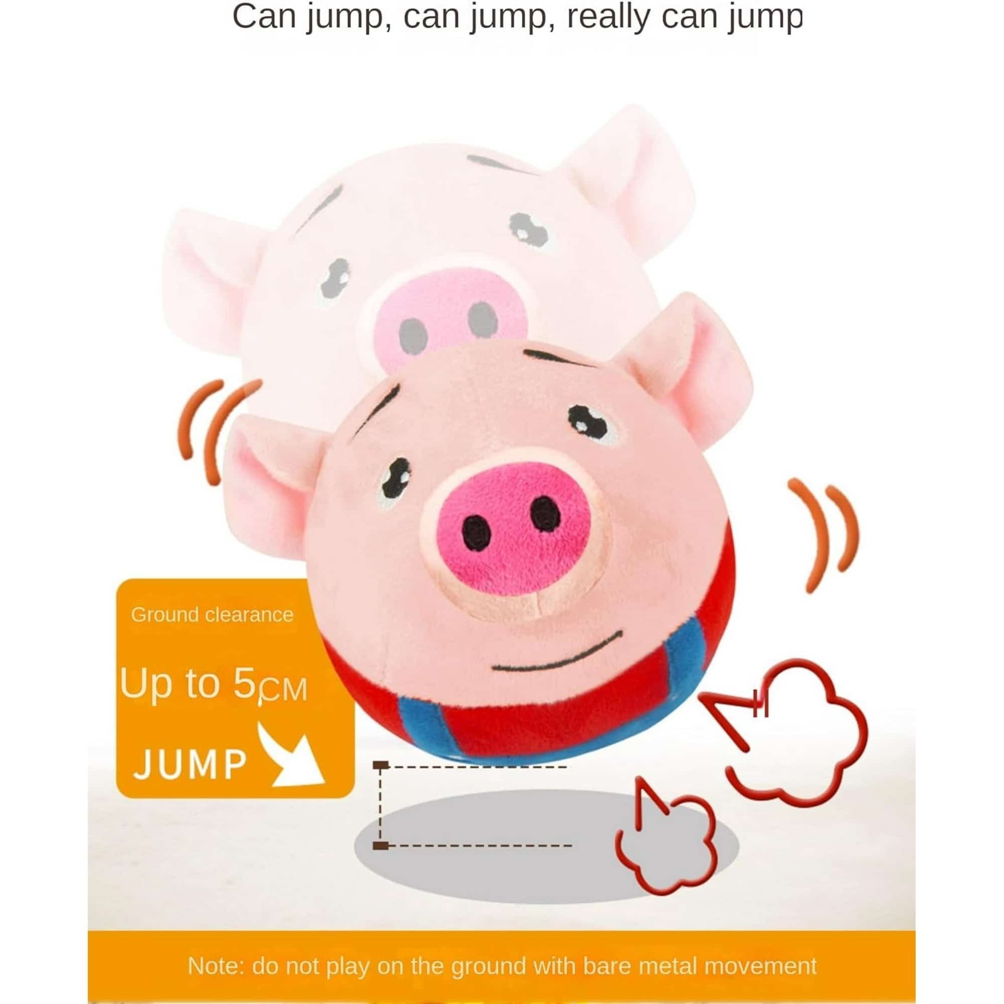USB rechargeable bouncing ball toy with automatic jumping mechanism that reaches up to 2 inches high, triggering puppies’ chase instincts and promoting exercise without owner participation. Built-in realistic pig sound effects activate during bouncing, engaging multiple senses and preventing boredom during solo play. Works best on smooth hardwood or tile floors. Soft plush exterior safe for chewing and carrying, removable for machine washing to maintain hygiene after drool or dirt. Cartoon pig design with pink snout, floppy ears, and red collar. Built-in rechargeable battery charges via USB cable, eliminating disposable battery costs. Helps puppy development by stimulating senses and promoting physical activity. Available in multiple cartoon animal designs.