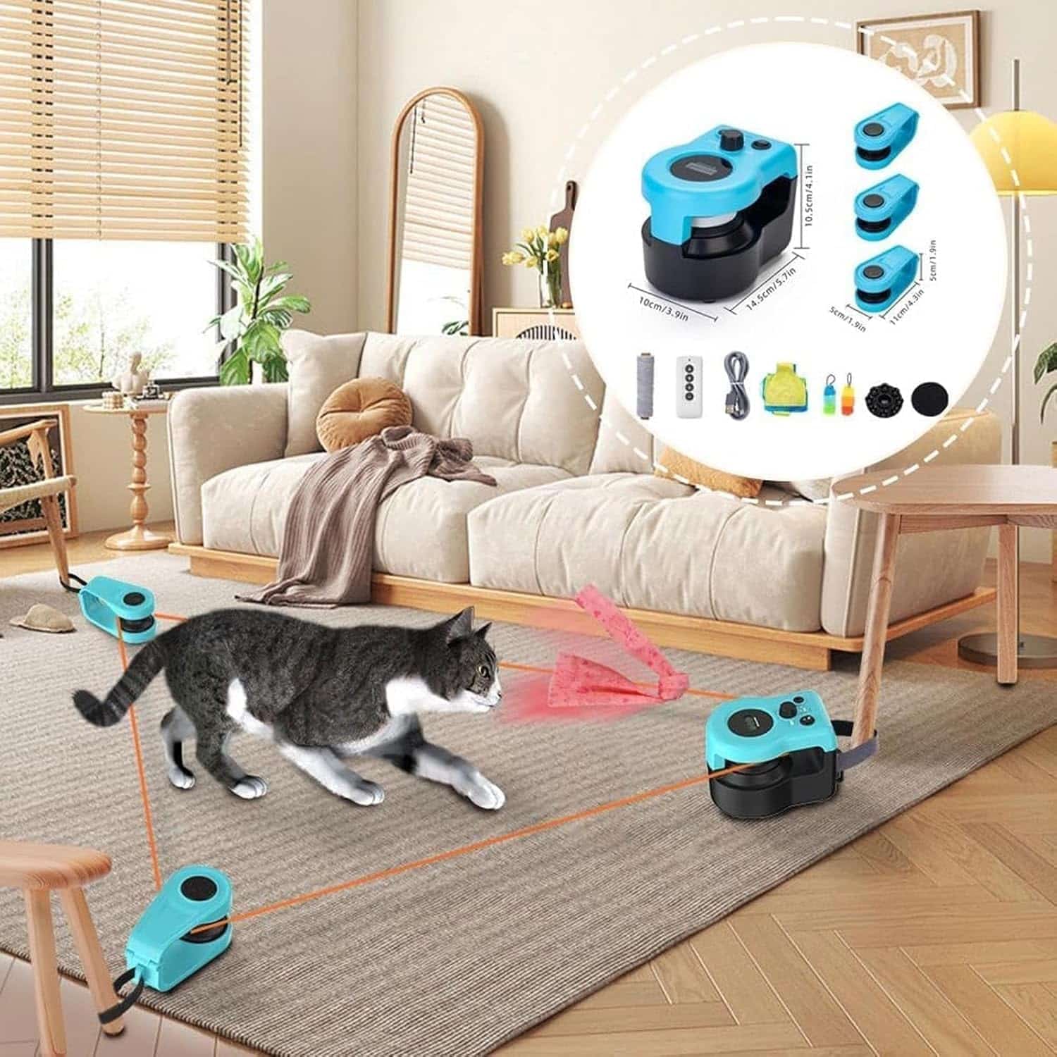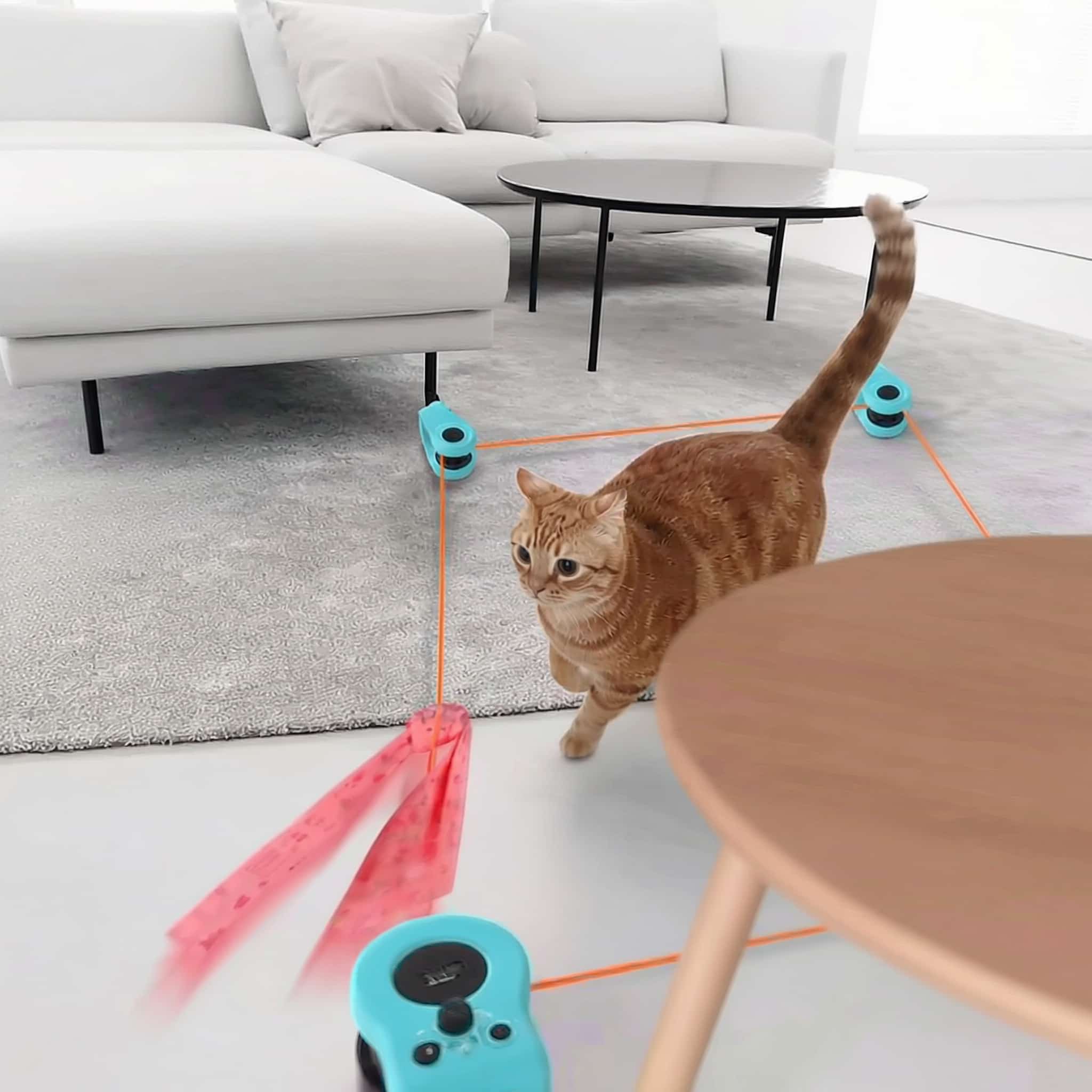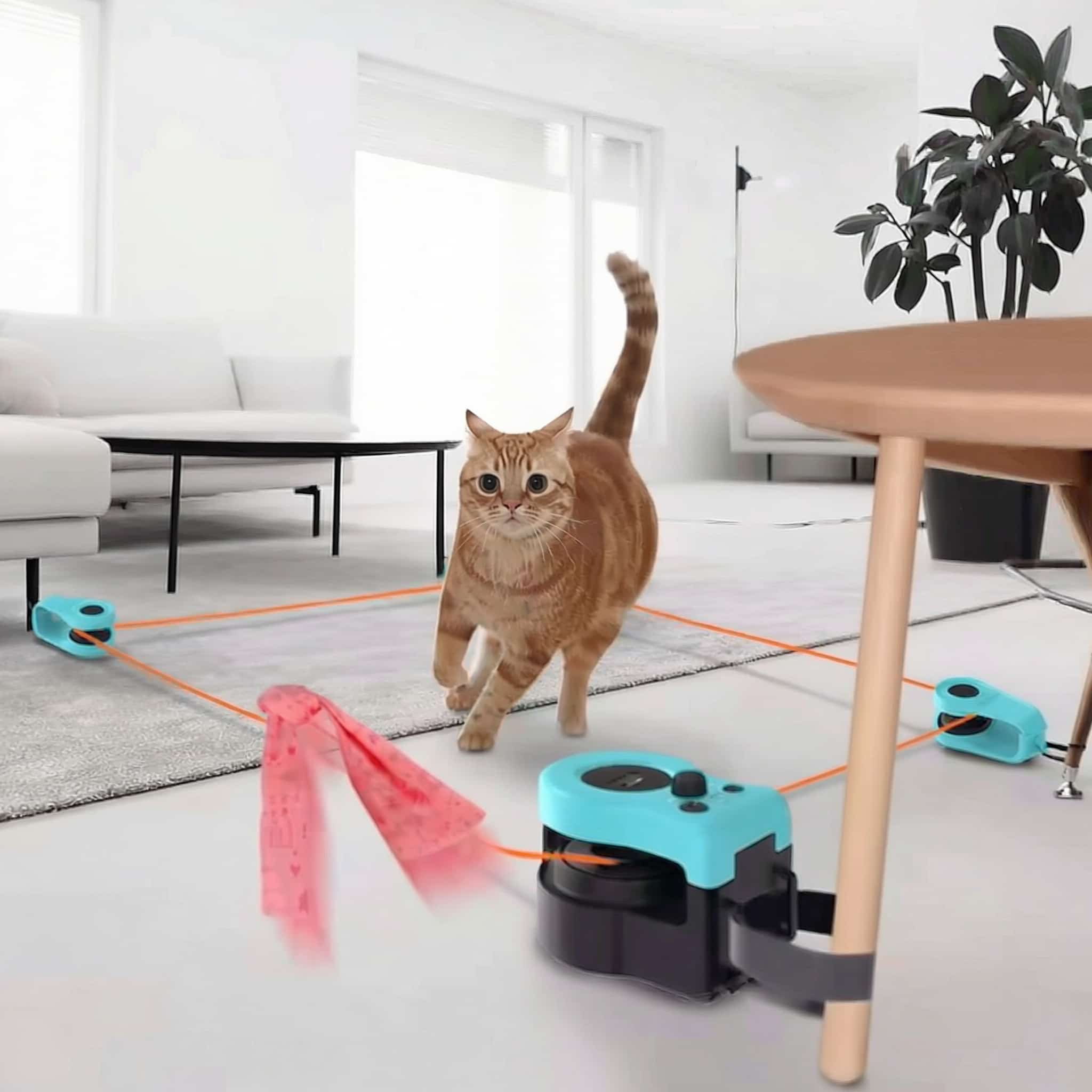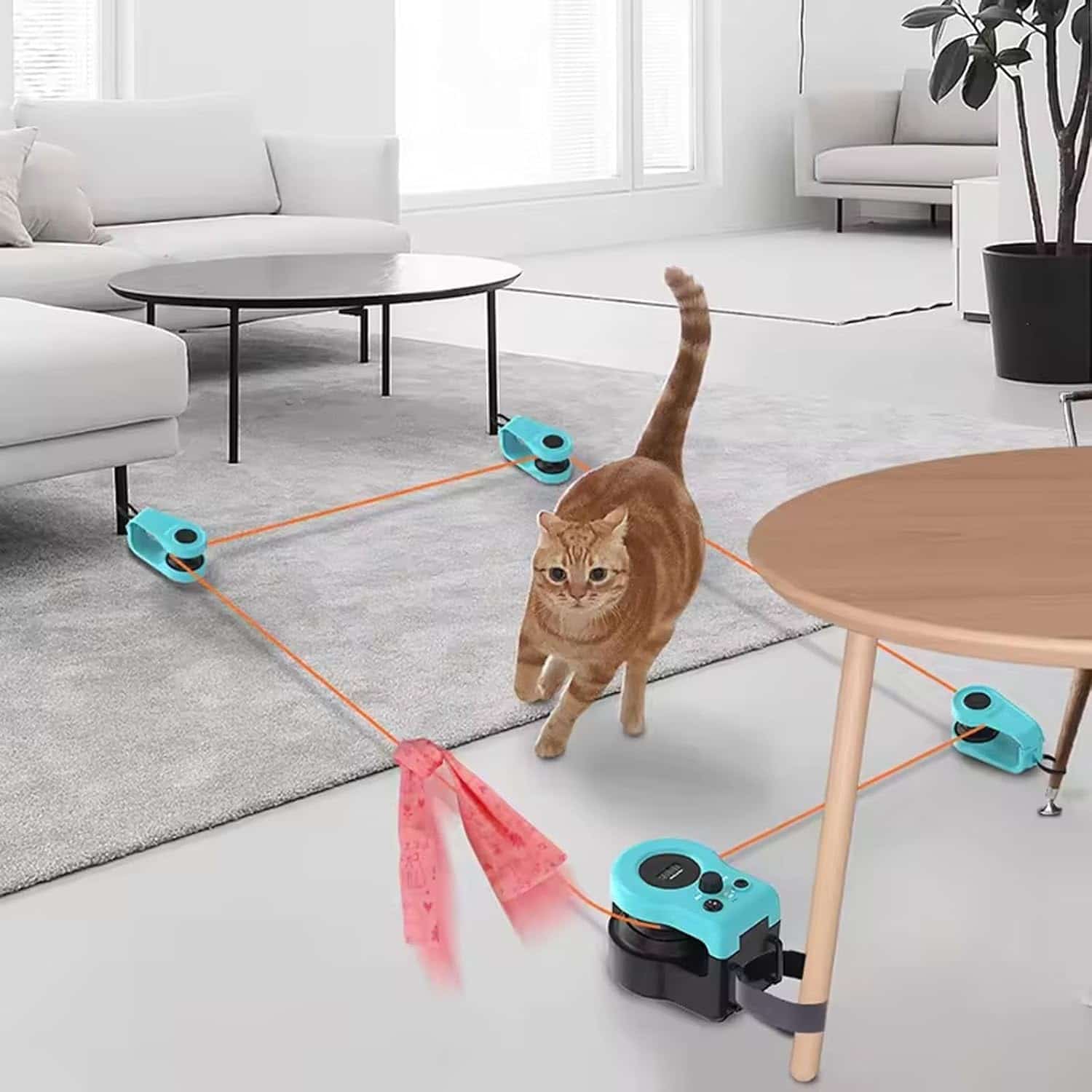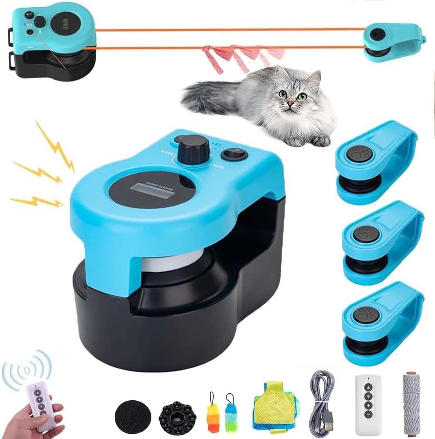 Remote control cat running wheel with adjustable speeds from 1500 to 3000 RPM, customizable for different energy levels. Lower speeds for seniors, higher for high-energy cats. DIY design includes 3 fixed wire clips for creating custom string trajectories around wheel base, preventing predictable patterns. Easy configuration changes challenge cats differently each session. Realistic mouse hunting simulation with moving strings triggers chase drive, satisfies instincts for indoor cats. Built-in safety timer operates 15 minutes then rests 2 hours, preventing overexertion without supervision. USB rechargeable. High-quality ABS construction with smooth edges, plush attachments without hazardous parts. Includes main wheel base, 3 detachable modules, remote, string attachments, USB cable.