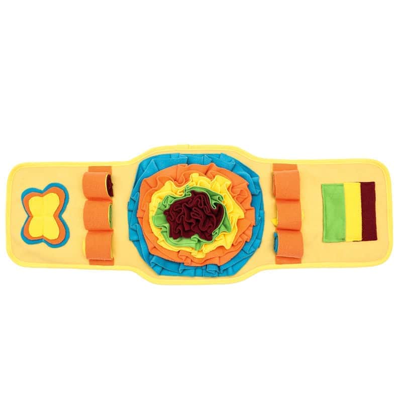 Interactive snuffle mat with multiple soft polyester layers and colorful compartments hiding treats, stimulating nose and brain through puzzle-like challenges.