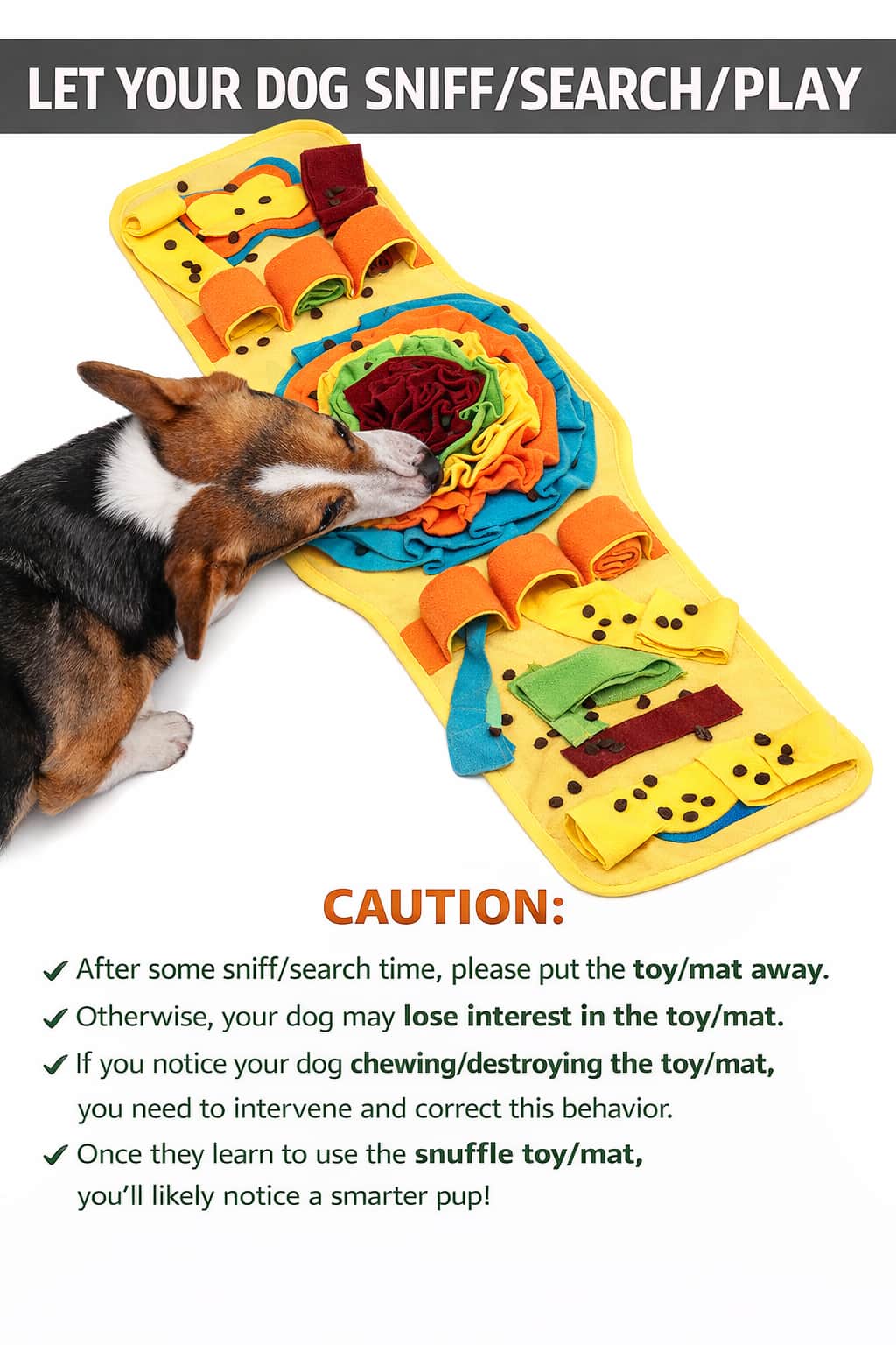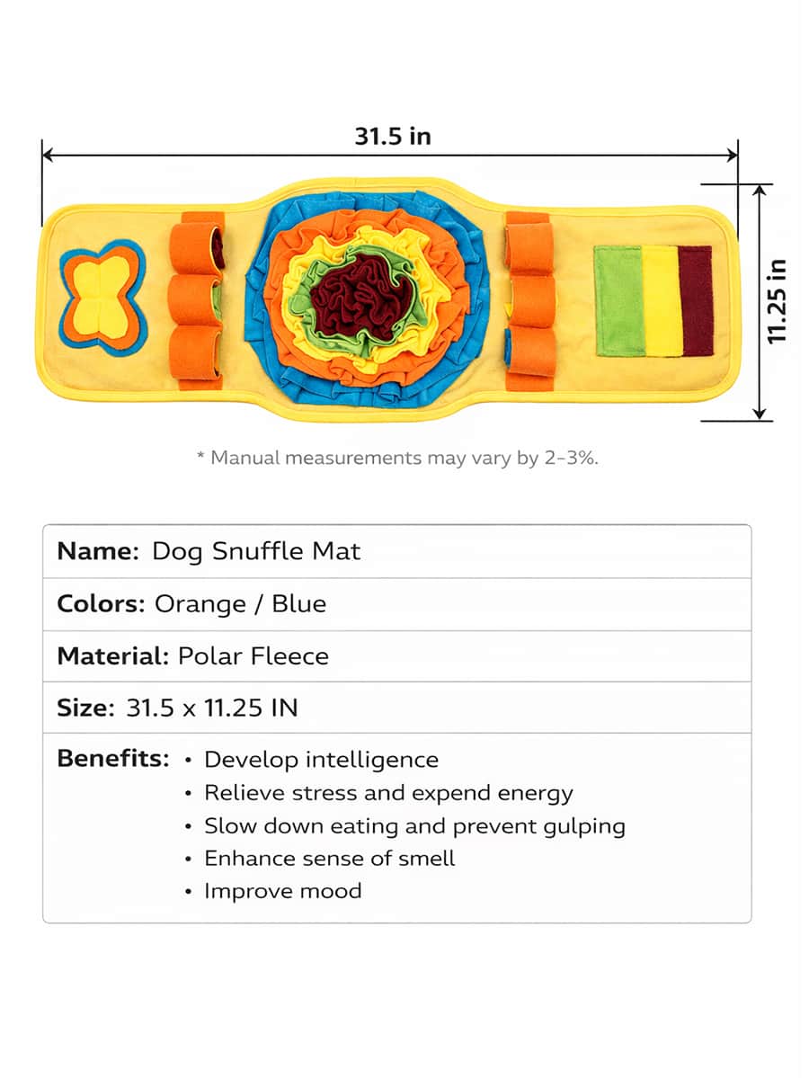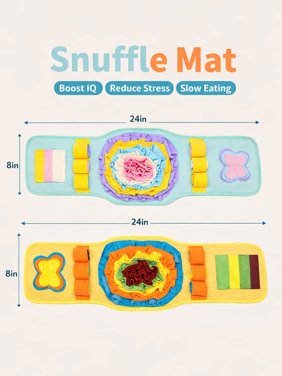 Interactive snuffle mat with multiple soft polyester fabric layers and colorful compartments hiding treats or kibble, stimulating nose and brain simultaneously through puzzle-like challenges. Varied hiding spots create engaging mental enrichment transforming mealtime into exciting experiences for all sizes and breeds, reducing anxiety and boredom through purposeful scavenging.