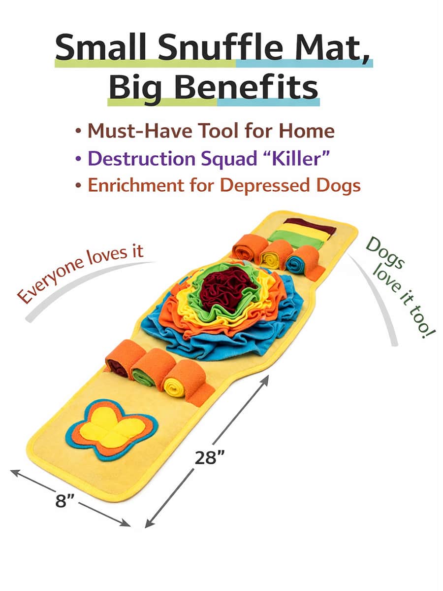 Unique watch-style construction rolls and unrolls easily with integrated fabric straps securing compact configuration. Perfect for at-home training and travel, portable design ensures mental stimulation anywhere with minimal storage. 31.5×11.25 inch foraging surface when unrolled. Anti-slip backing ensures stability during enthusiastic foraging preventing sliding across floors. Bite-resistant polyester withstands aggressive searchers.