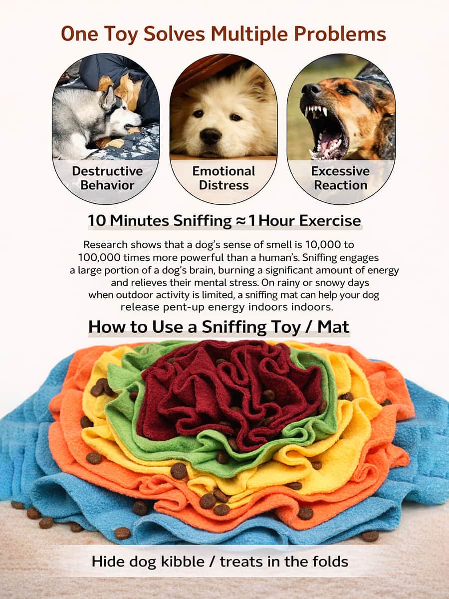 Functions as slow feeding pad extending mealtimes to 15-20 minutes, promoting healthy digestion and preventing choking in fast eaters. Engages powerful sense of smell burning brain energy, relieving mental stress, developing foraging skills, reducing destructive behavior.