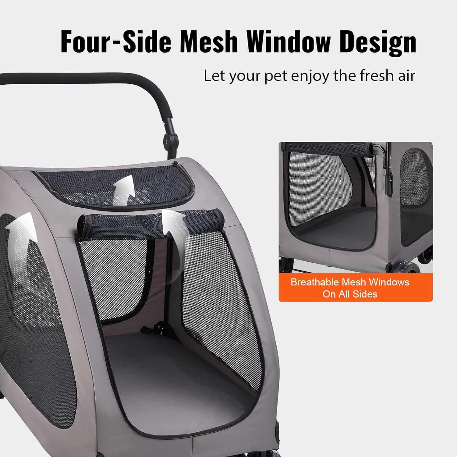 Heavy-duty 4-wheel pet stroller with 160 lb alloy frame, linked brake system, and four-sided mesh ventilation for large breeds on any terrain.