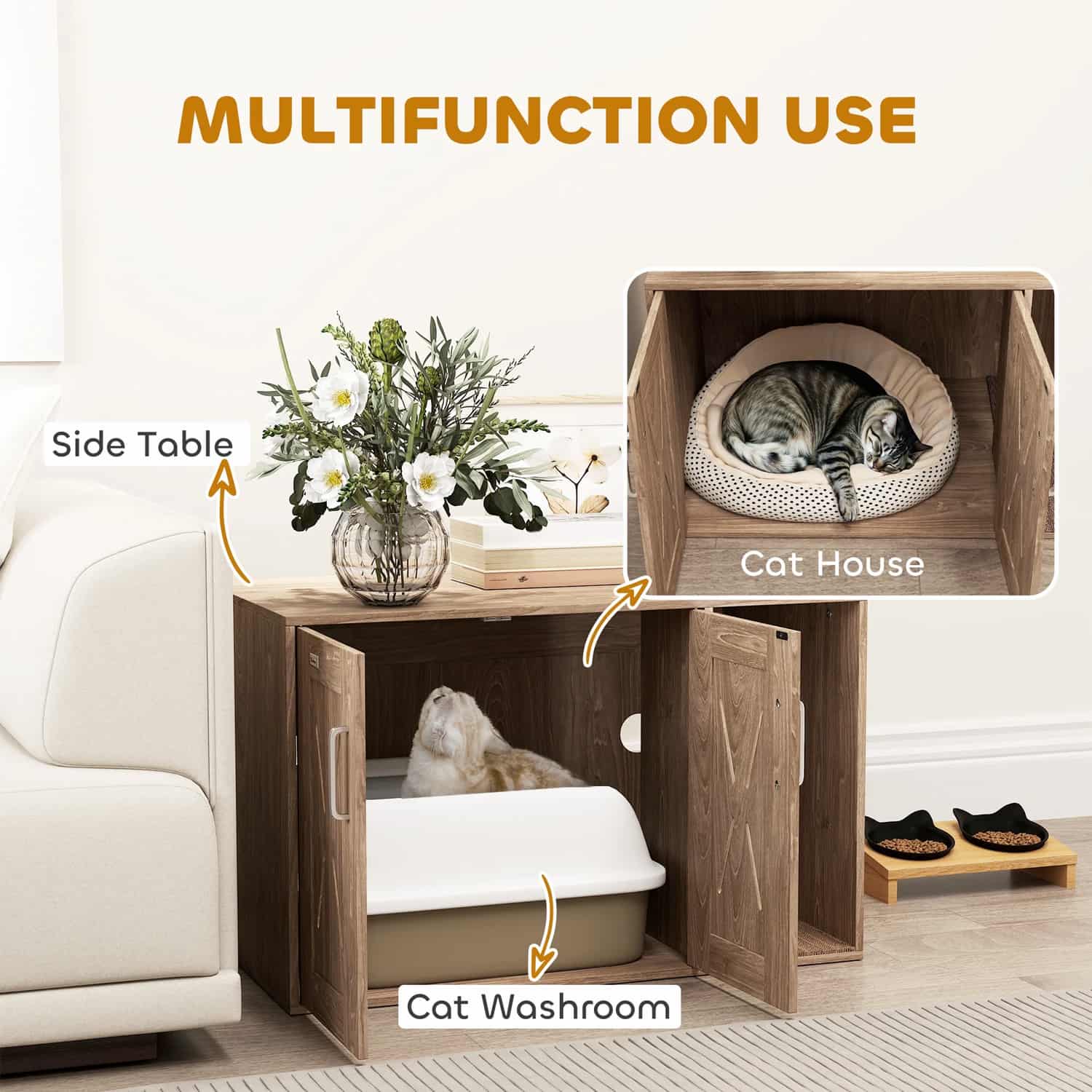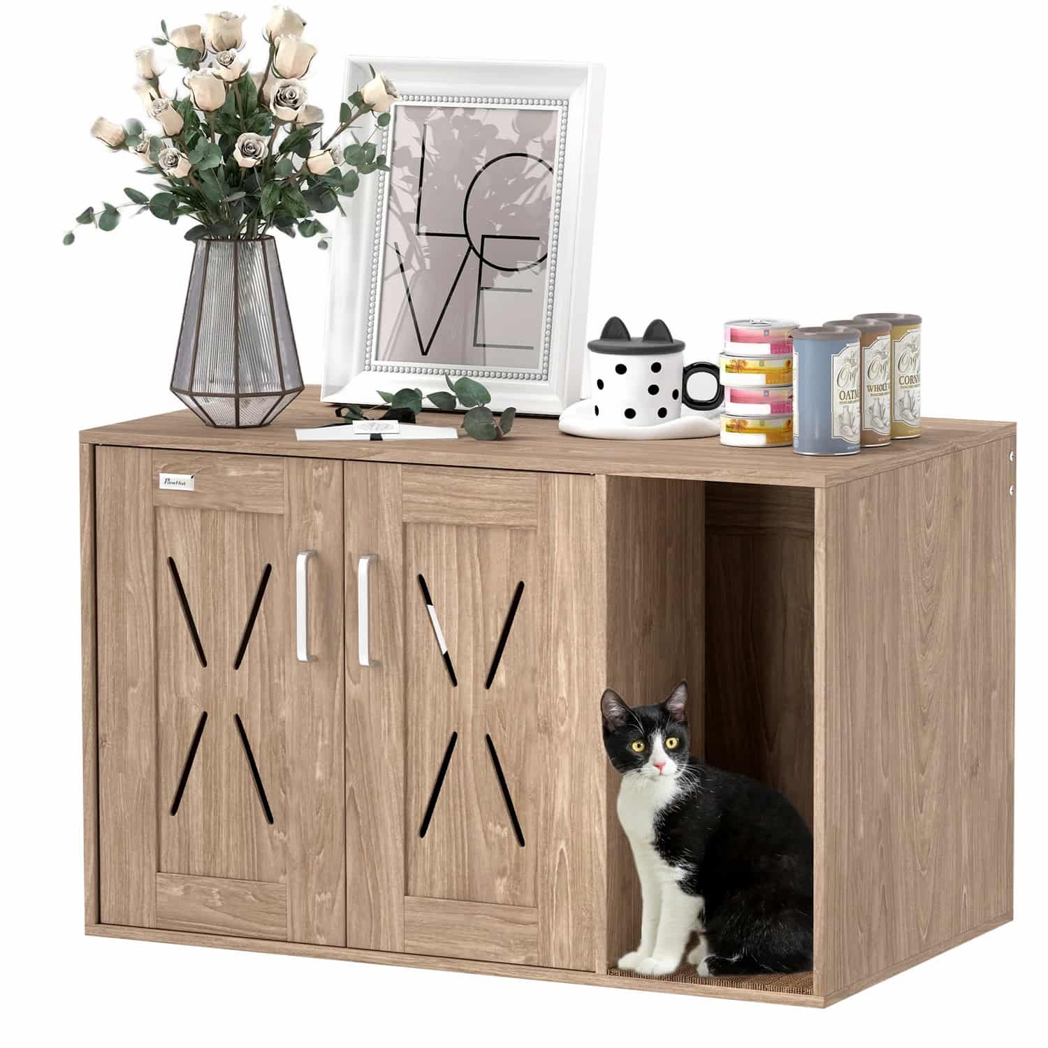 The only litter box enclosure that functions as furniture, with a usable tabletop for decor and a scratching pad at the entrance that catches litter on paws.
