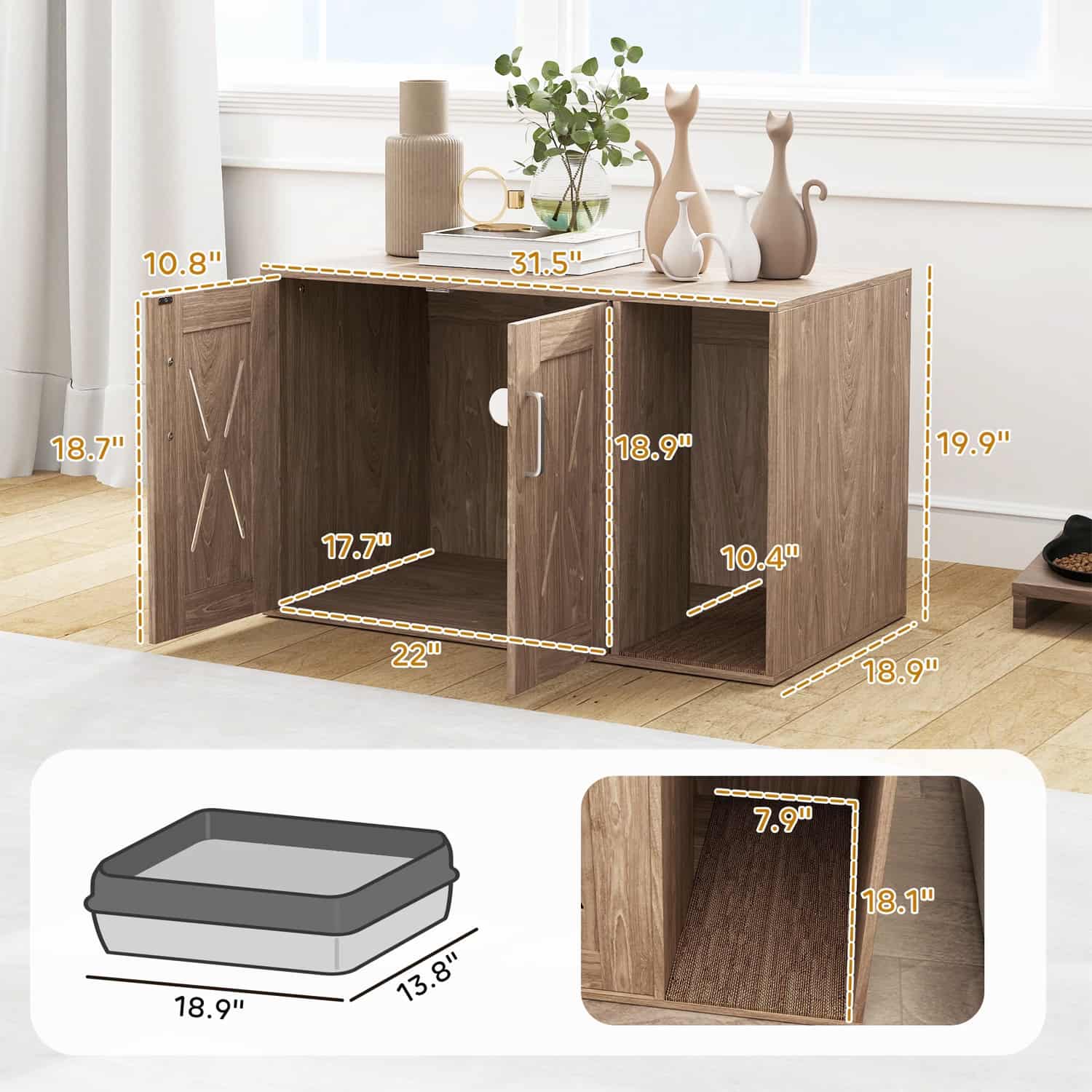 Sturdy tabletop holds lamps, plants, or books like regular furniture. Two-tier design creates upper cat hideaway and lower litter compartment. Walnut wood grain finish blends with living room decor. Magnetic door closures keep cabinet shut without visible hardware.