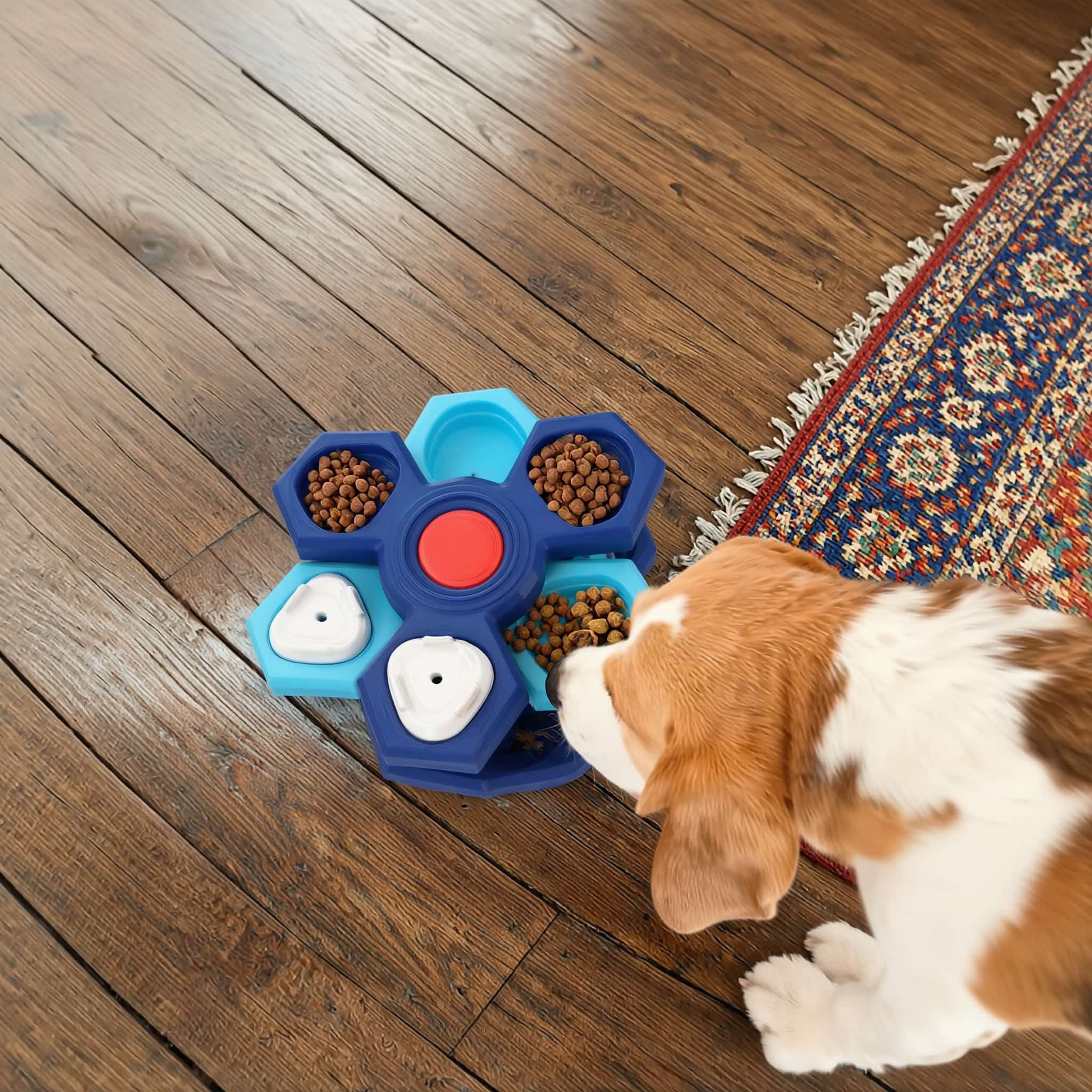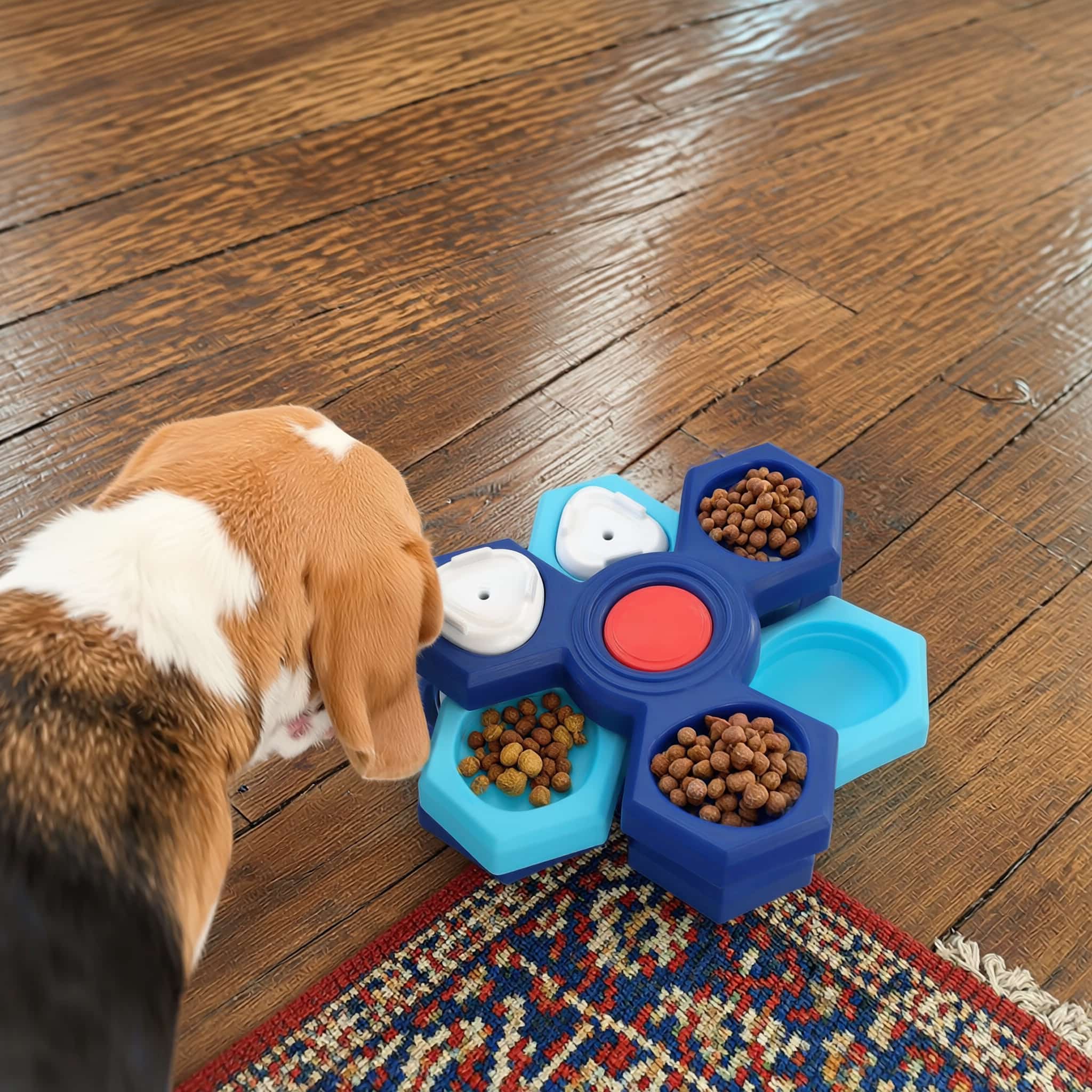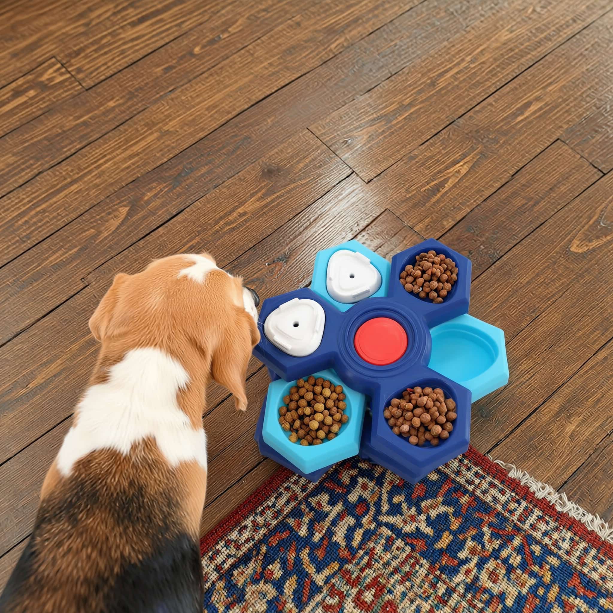 Multi-layer puzzle feeder with up to four stackable layers that adjust difficulty from beginner to advanced. Each layer adds hidden compartments with sliding lids requiring increased problem-solving. Extends meals from 5 minutes to 15-20 minutes, reducing risk of choking, vomiting, or gastric torsion from rapid eating. Maze channels force sniffing and searching instead of gulping, supporting healthier digestion. Mental stimulation reduces boredom during work hours, prevents destructive behaviors like barking or furniture chewing. Rubberized anti-slip pads prevent sliding and floor scratching. Durable PP plastic with moderate-width channels resists dirt, hand-wash or dishwasher-safe. Suitable for cats and dogs of all sizes.