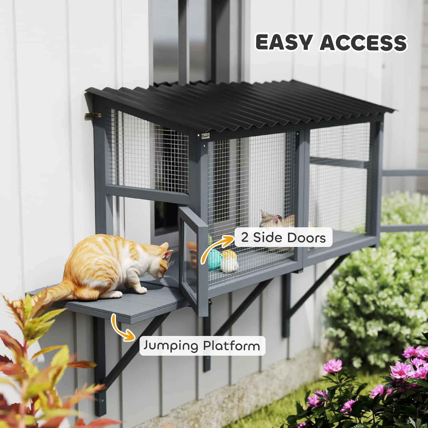 Two access doors (15.7"W x 11.8"H) on sides let you place cats inside or clean interior without climbing through window. Interior jumping platform (11.8"W x 19.7"D) provides elevated lounging spot. Spacious enough for 1 to 2 cats. Interior space: 39.8"L x 18.9"W x 25.6"H.