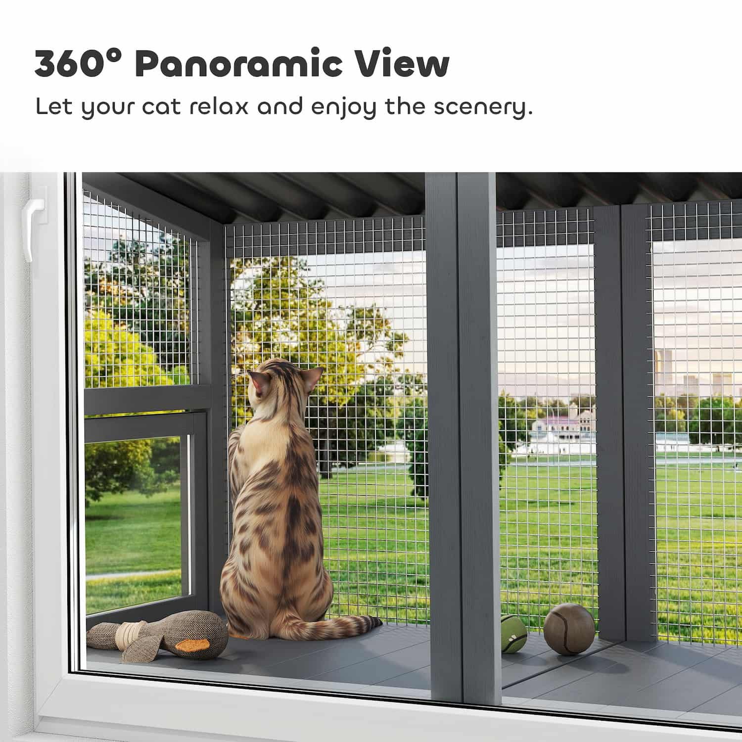 The only outdoor cat enclosure that mounts below windows, giving indoor cats safe access to fresh air and bird watching without ground-level installation.
