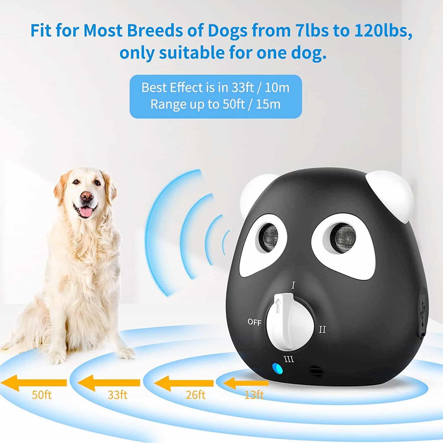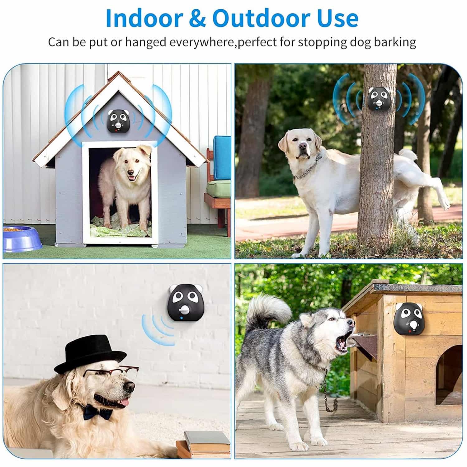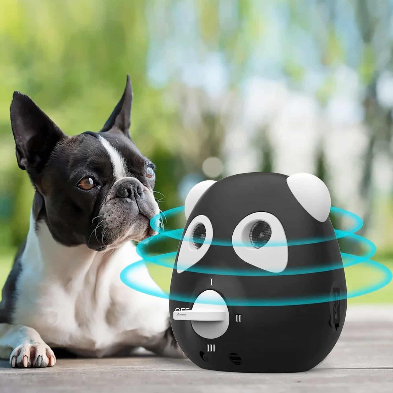 Panda shaped ultrasonic bark deterrent with dual speakers that emit frequencies to stop barking from 25 to 33 ft away. Three adjustable frequency levels match the device to small, mid size, or large dogs. The decorative panda design blends into home and yard settings without looking like a training device. UV resistant ABS shell resists fading outdoors. 1500mAh rechargeable battery with USB charging. IPX4 splash proof for outdoor placement. Inaudible to humans. Works on all breeds. Does not work on deaf or hard of hearing dogs.
