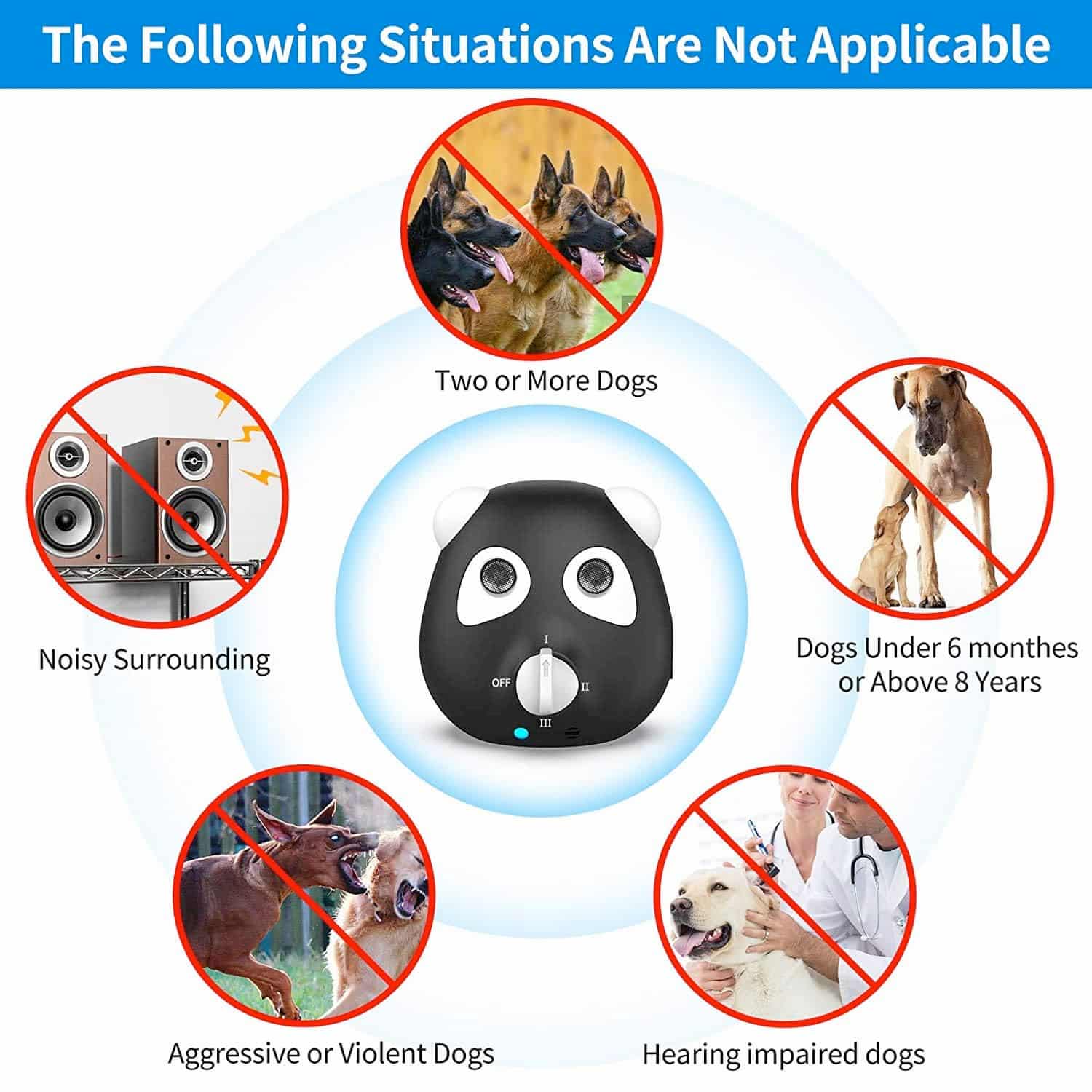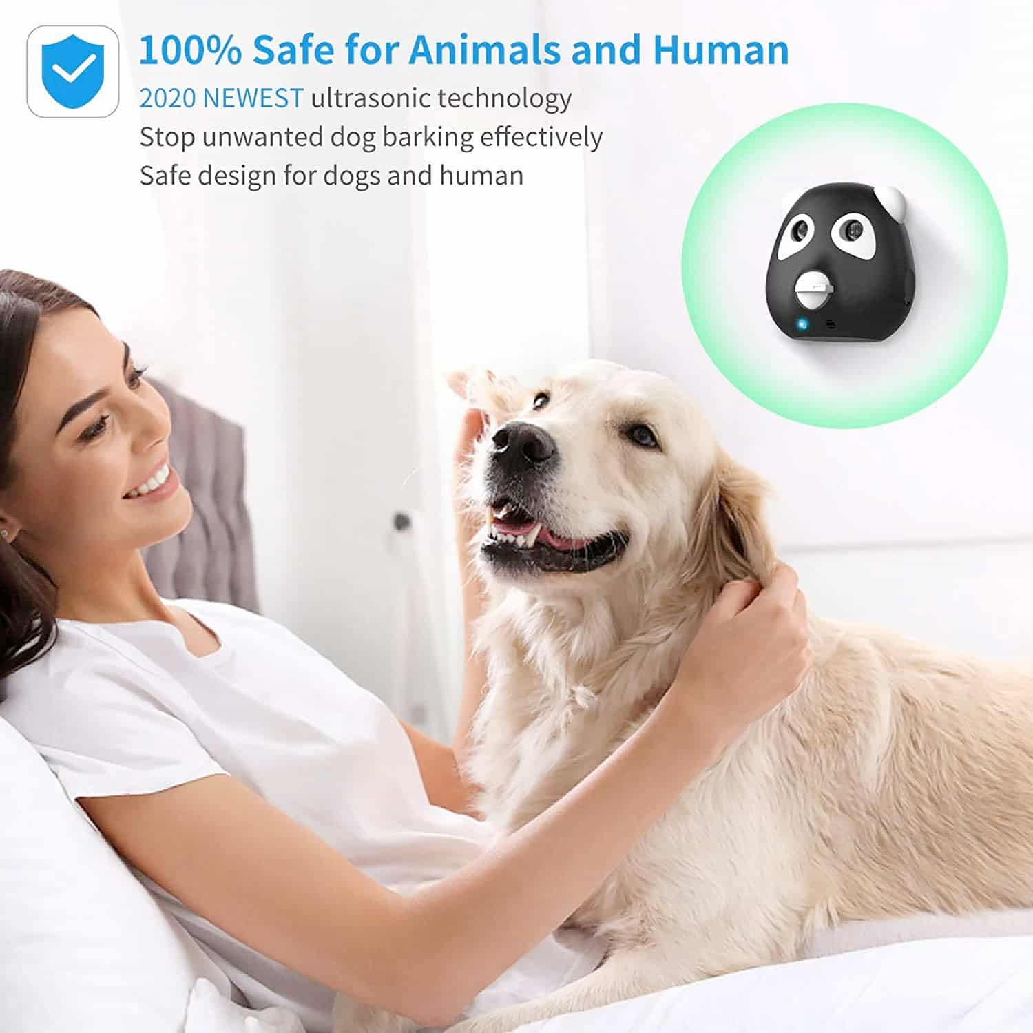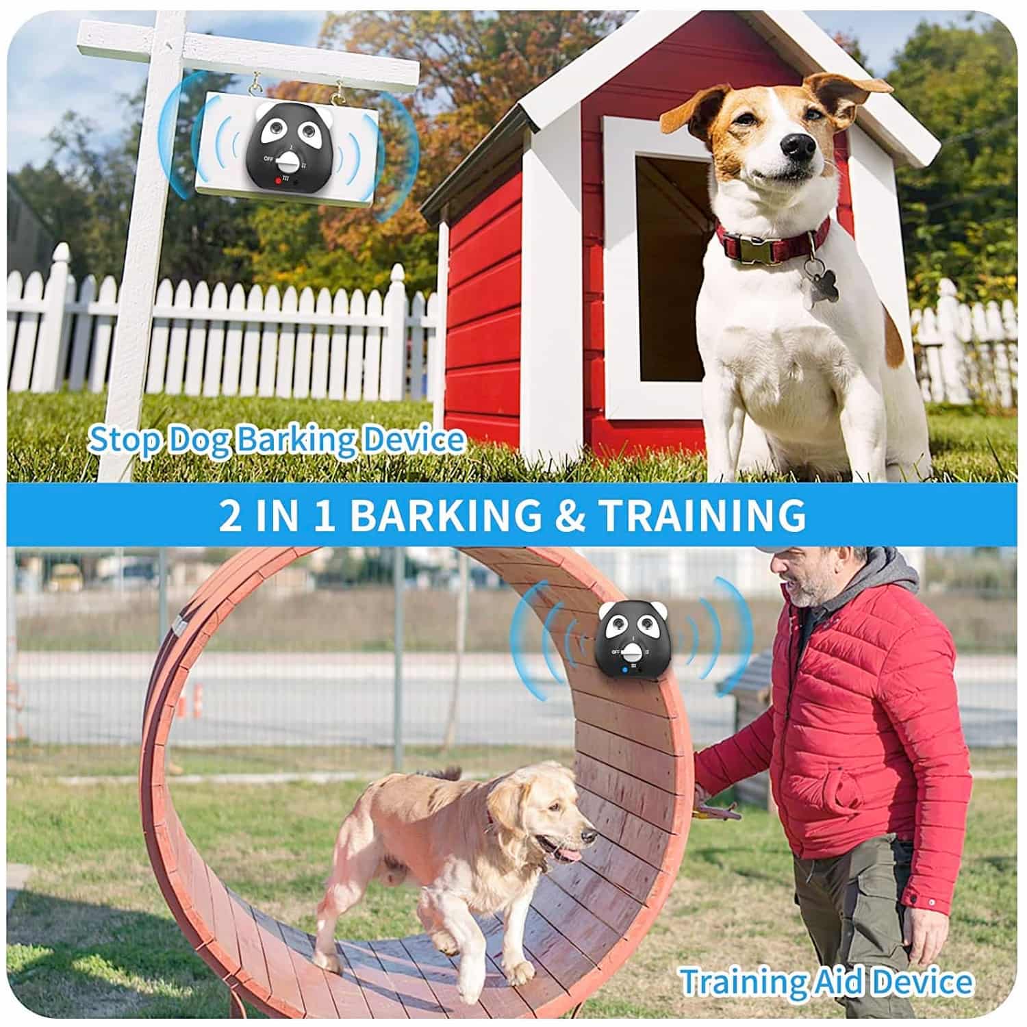Panda shaped ultrasonic bark deterrent with dual speakers that emit frequencies to stop barking from 25 to 33 ft away. Three adjustable frequency levels match the device to small, mid size, or large dogs. The decorative panda design blends into home and yard settings without looking like a training device. UV resistant ABS shell resists fading outdoors. 1500mAh rechargeable battery with USB charging. IPX4 splash proof for outdoor placement. Inaudible to humans. Works on all breeds. Does not work on deaf or hard of hearing dogs.