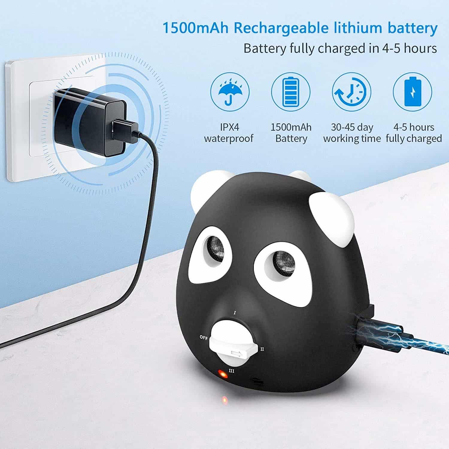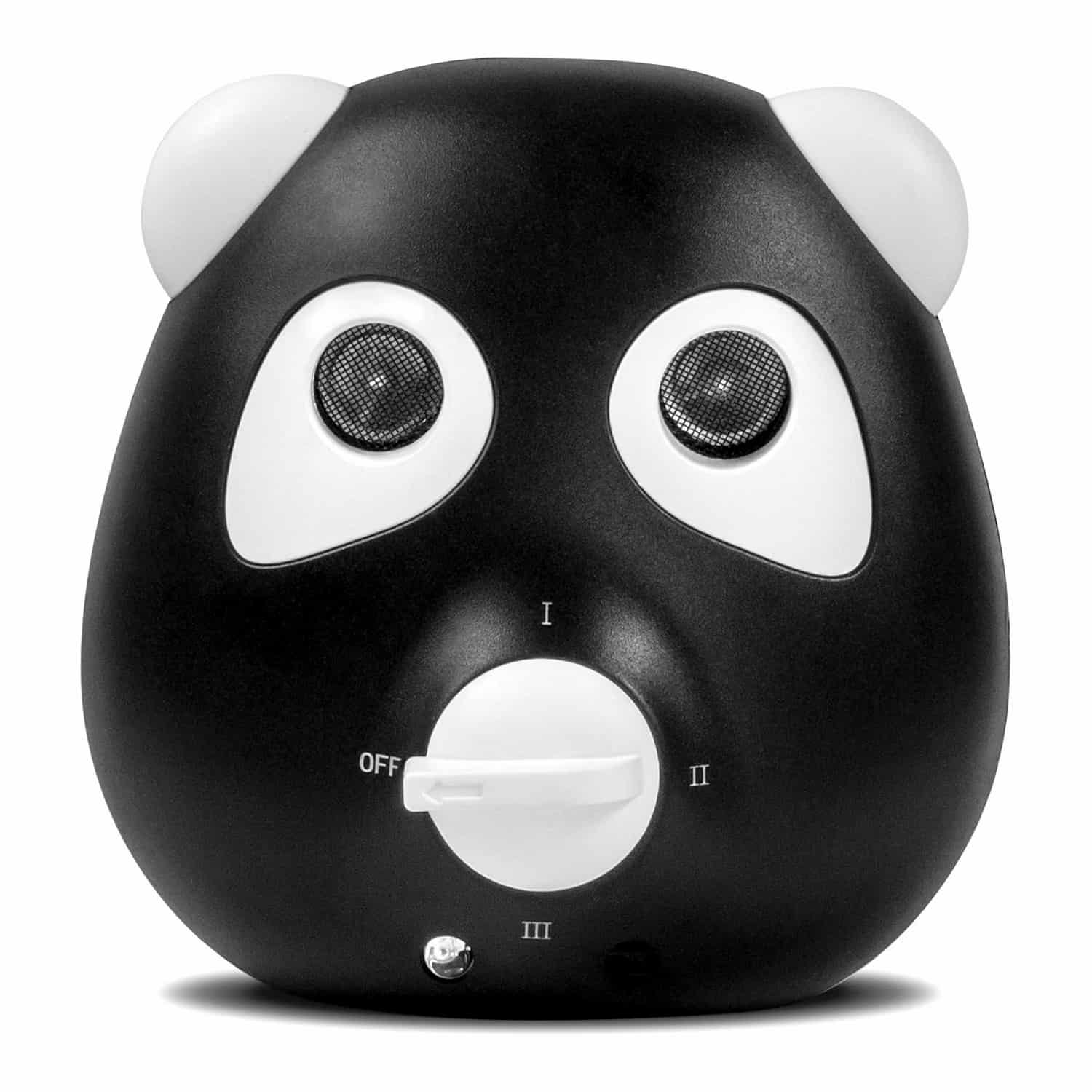 Panda shaped ultrasonic bark deterrent with dual speakers and 3 frequency levels.