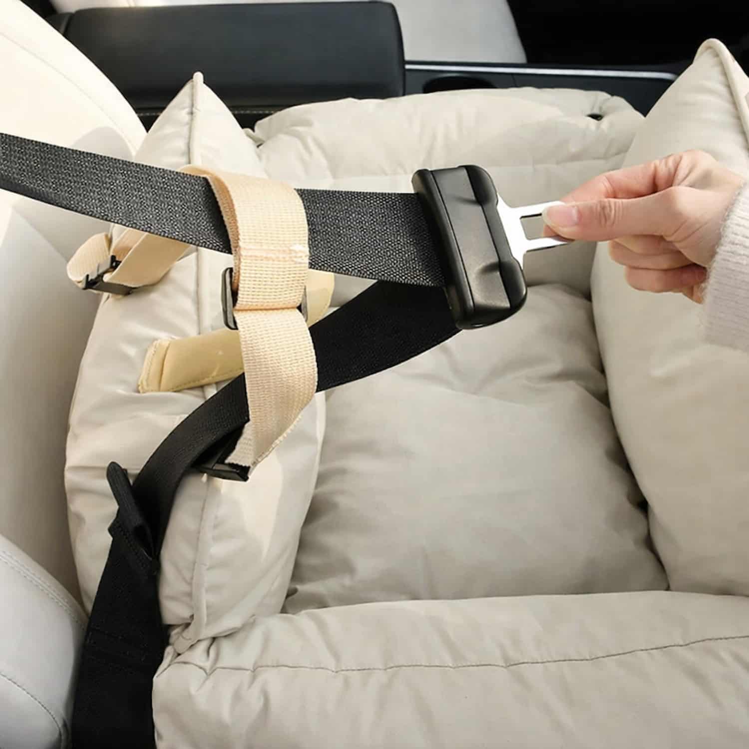 The only pet car seat bed with a waterproof scratch-resistant shell, an adjustable safety buckle, and a thickened padded carry handle that transfers the loaded bed from car to home without setting it down.