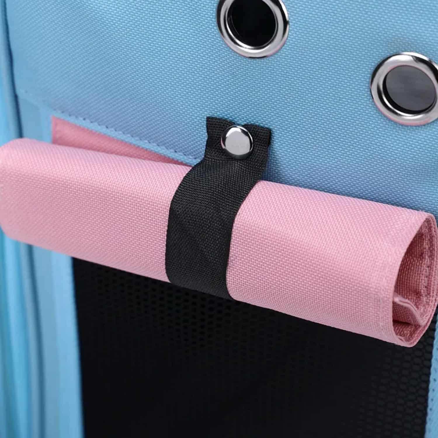The only pet backpack pairing a transparent panoramic bubble window with five-point ventilation, top, sides, front, and rear. Oxford fabric shell and polyester liner hold a structured 14.2 x 15 x 9.8 inch frame at 2.1 lbs, then fold flat for storage. Dual zippers,snap-button closure, Velcro front pocket, and adjustable shoulder strap for any carry style.