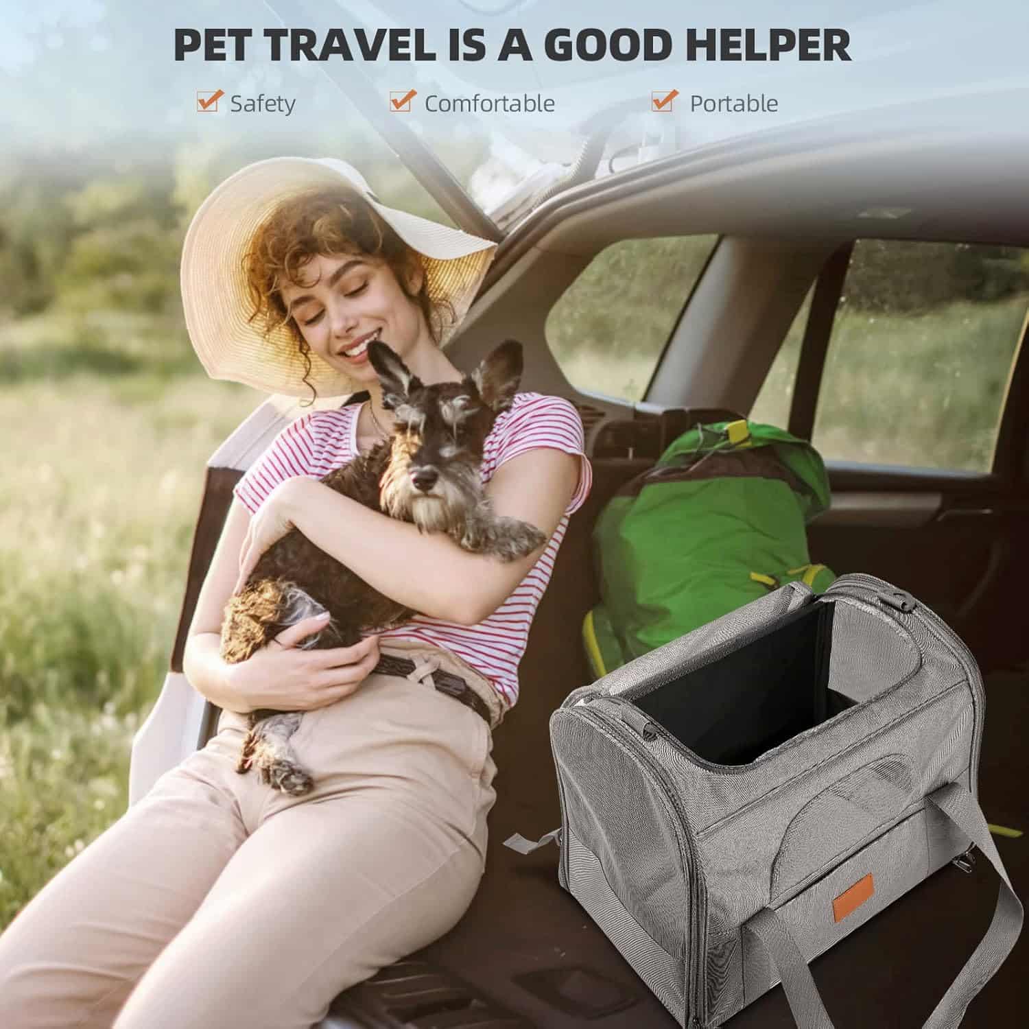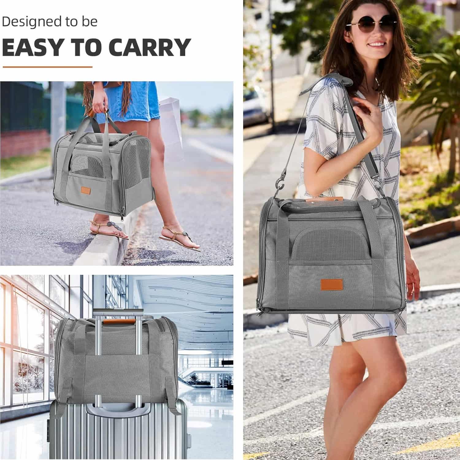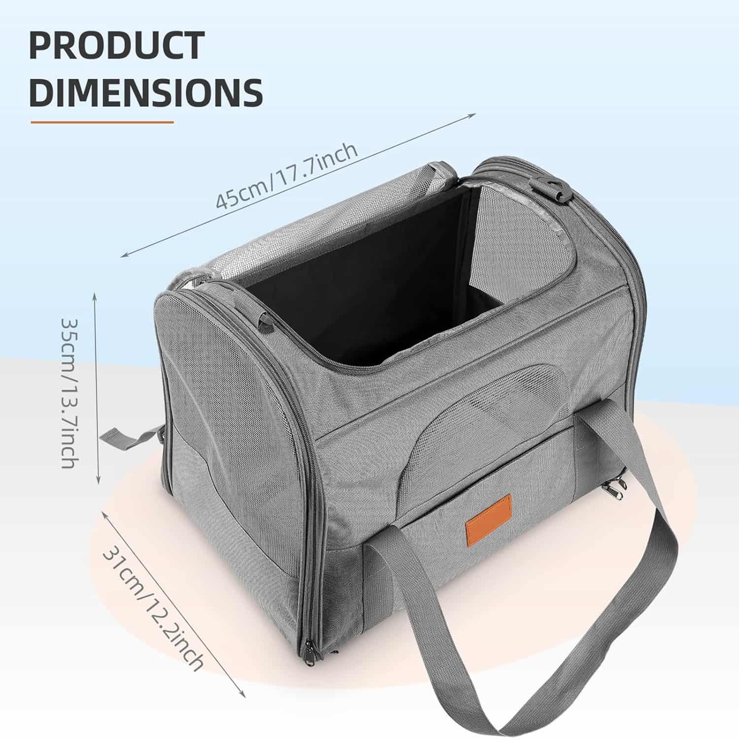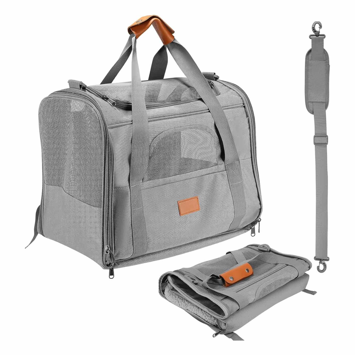 The only large foldable carrier that combines 4-side mesh airflow with a 1-second flat fold, making it as packable as a laptop bag between trips. Three mesh side panels plus a top vent window cycle air on all sides. Fits cats and dogs up to 20 lbs across a 17.7 x 13.8 x 13 inch interior. Includes a detachable snack pouch, front storage pocket, anti-escape internal clip, and a removable washable plush pad. Reinforced Oxford cloth exterior with metal lock closures and load-bearing metal shoulder clip.
