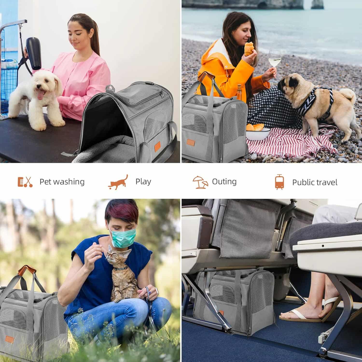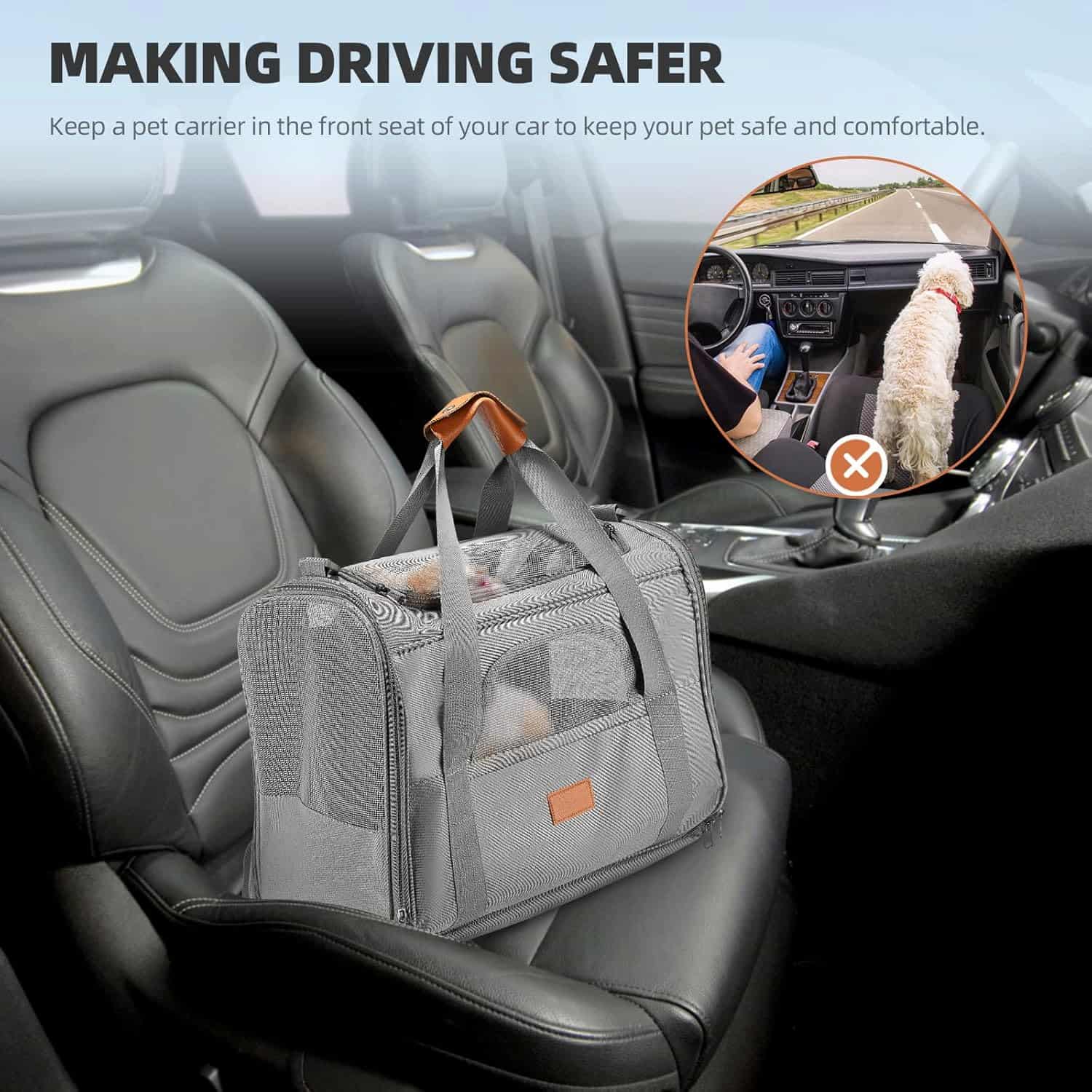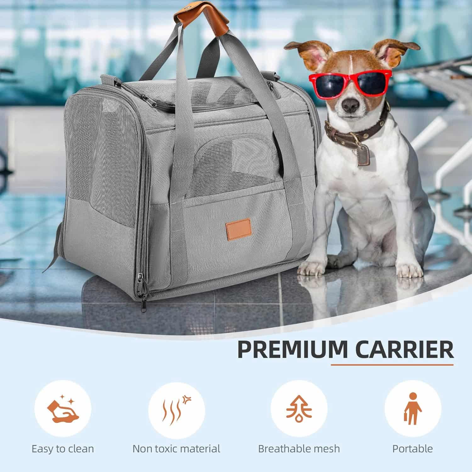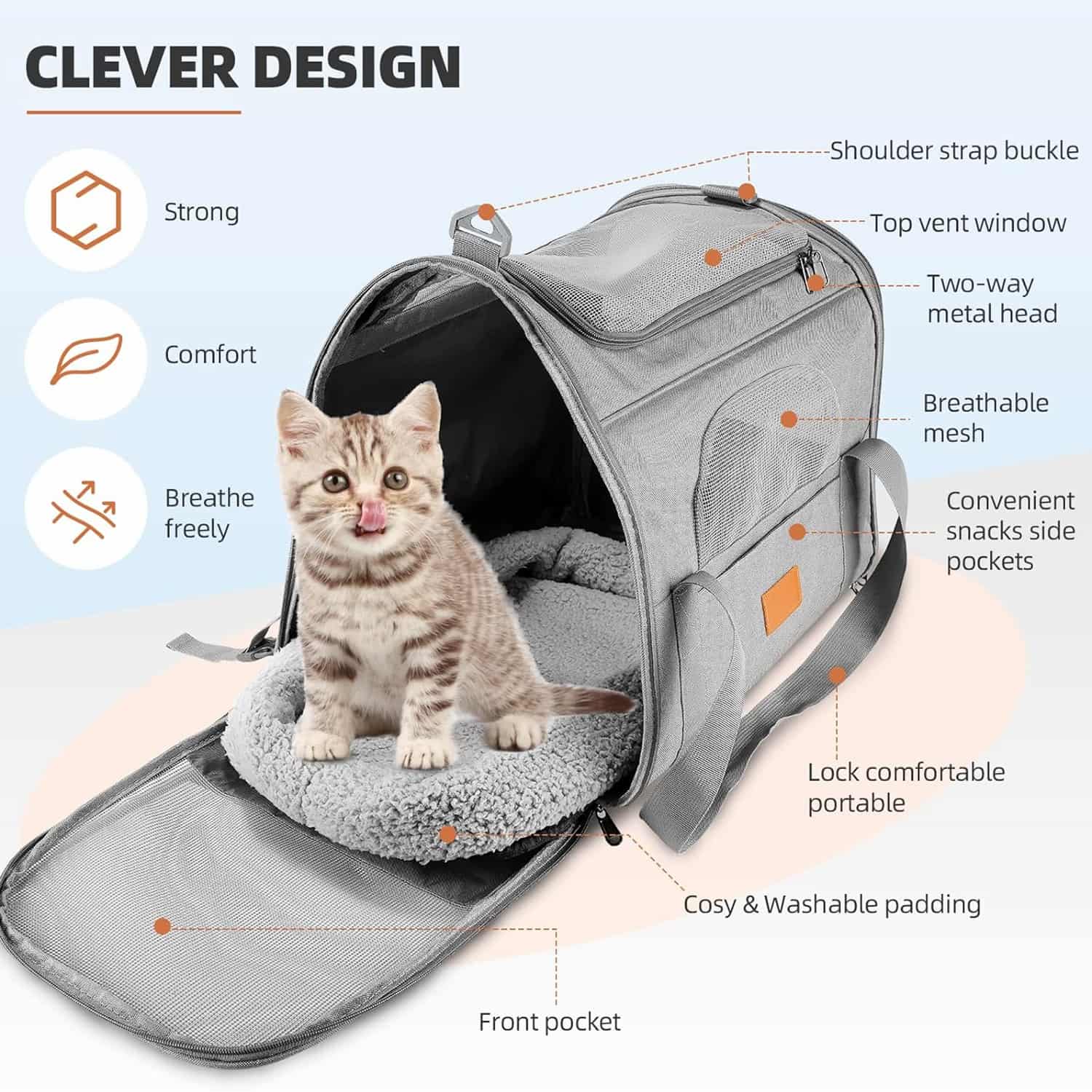The only large foldable carrier that combines 4-side mesh airflow with a 1-second flat fold, making it as packable as a laptop bag between trips. Three mesh side panels plus a top vent window cycle air on all sides. Fits cats and dogs up to 20 lbs across a 17.7 x 13.8 x 13 inch interior. Includes a detachable snack pouch, front storage pocket, anti-escape internal clip, and a removable washable plush pad. Reinforced Oxford cloth exterior with metal lock closures and load-bearing metal shoulder clip.