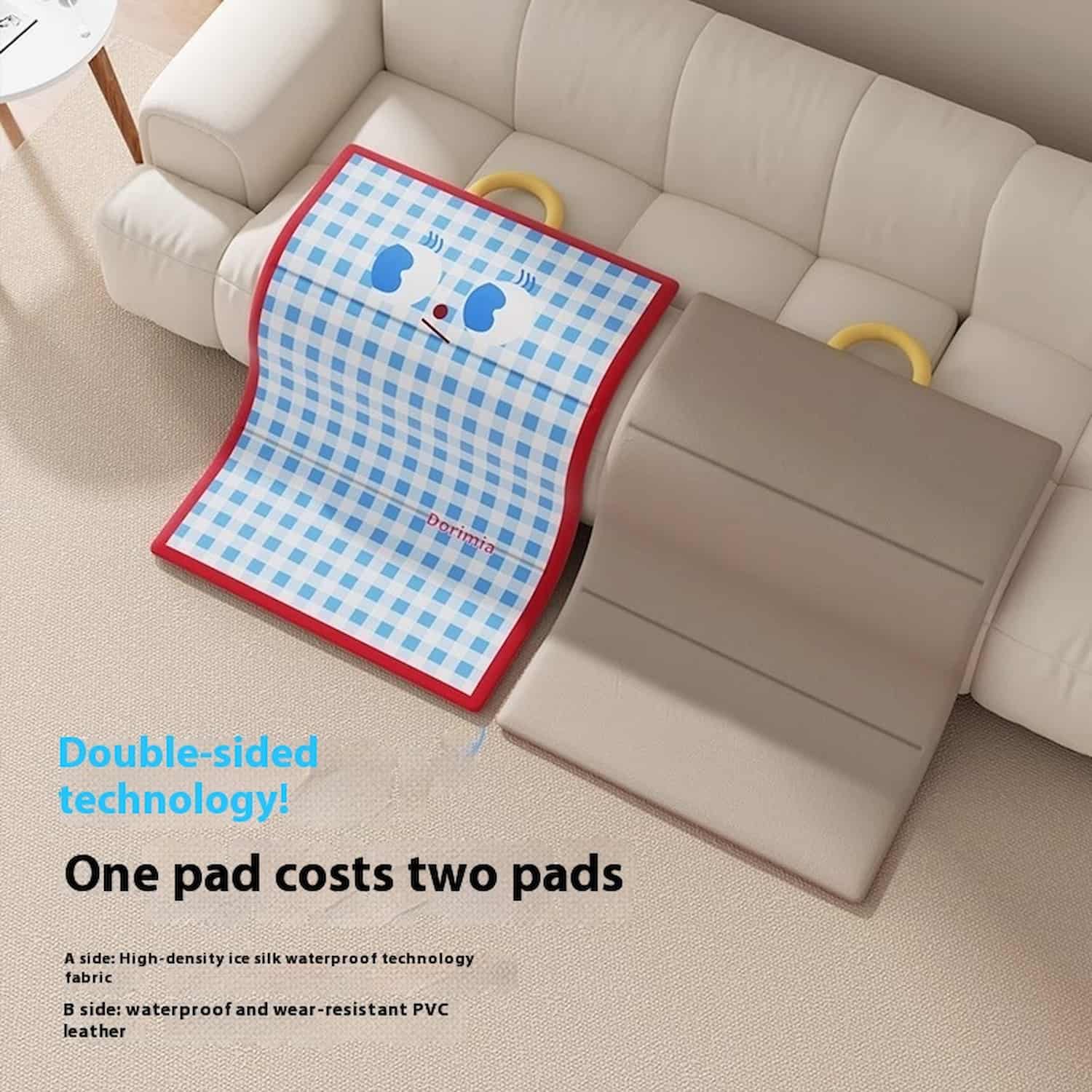 Ice silk pet cooling pad with double sided waterproof surfaces that dissipate heat on contact.