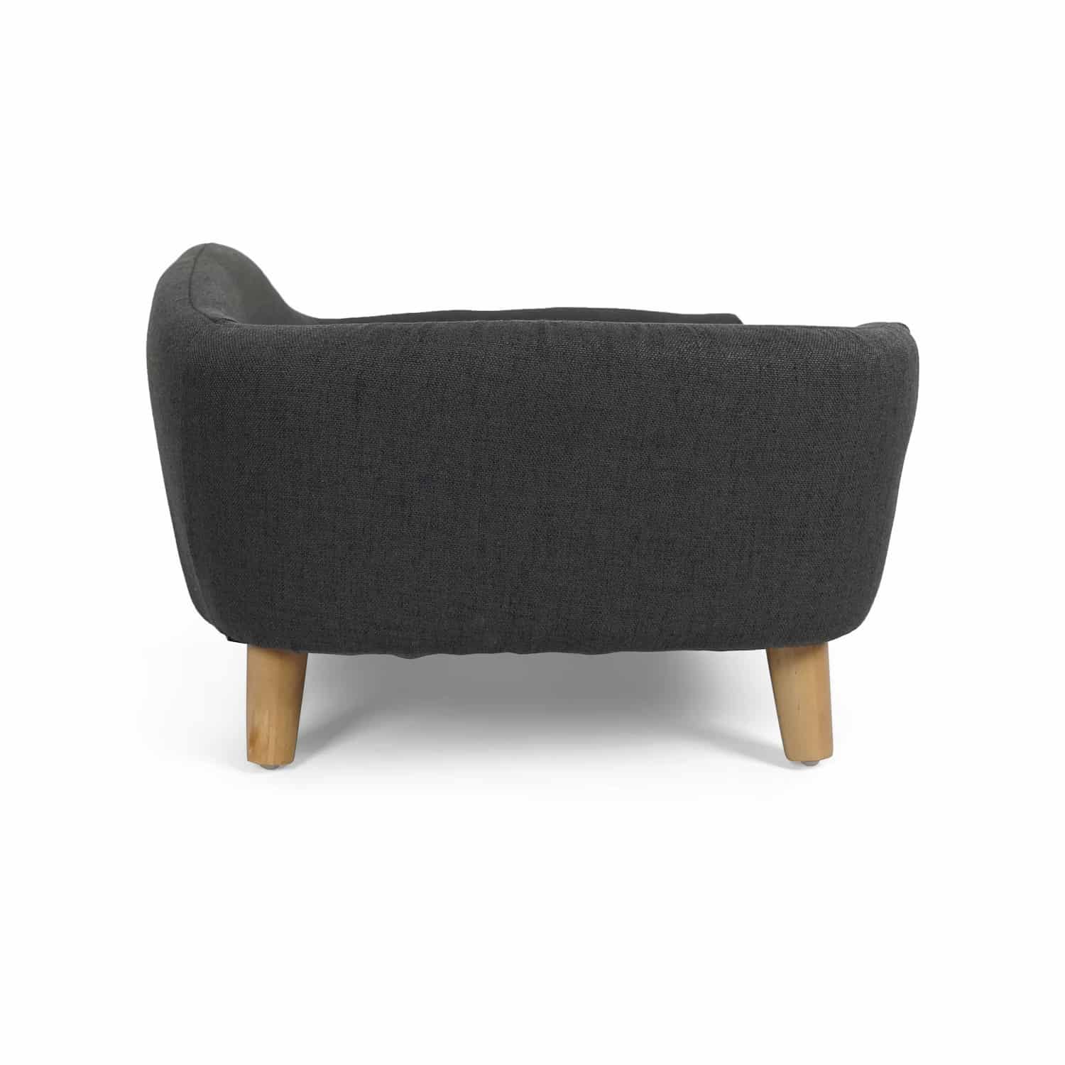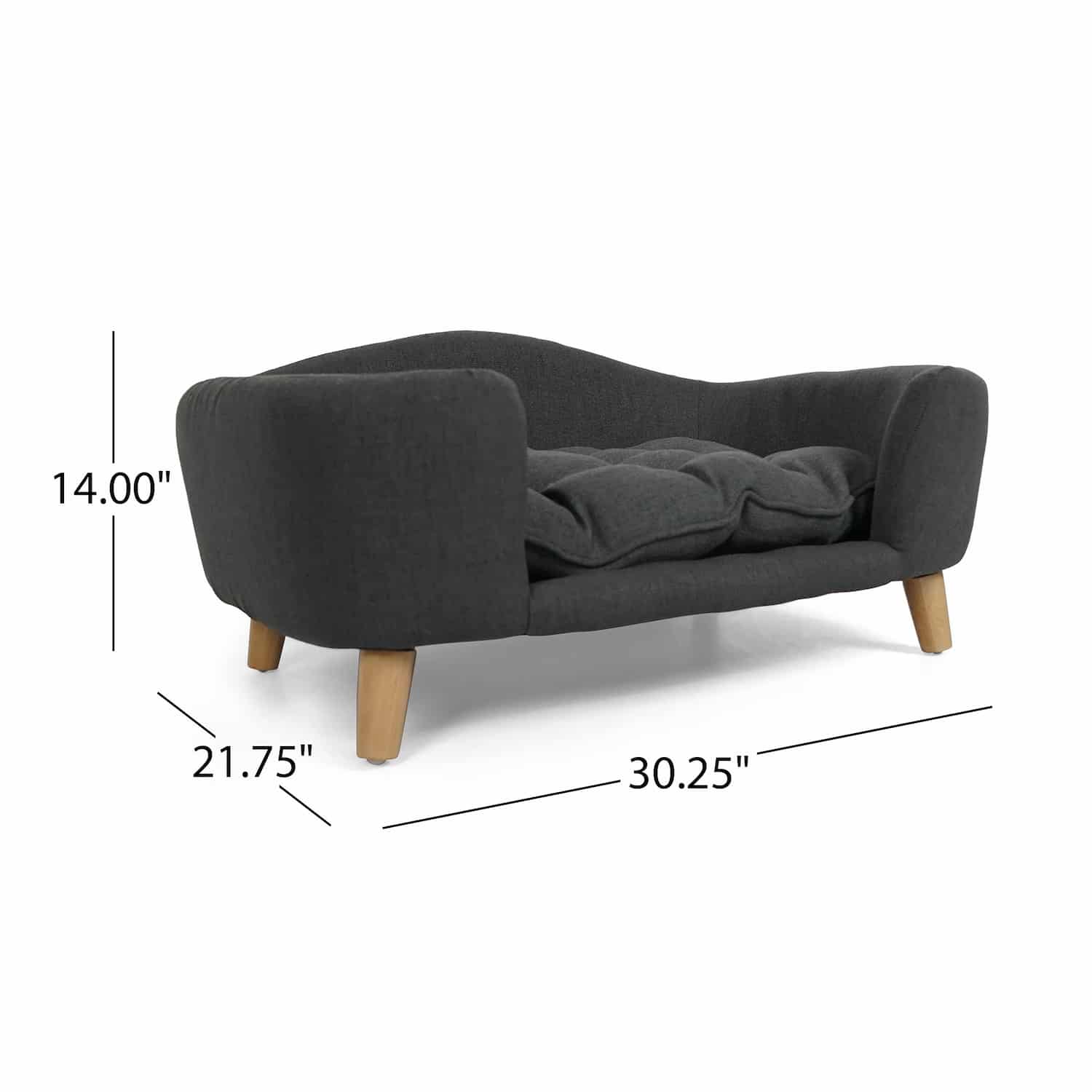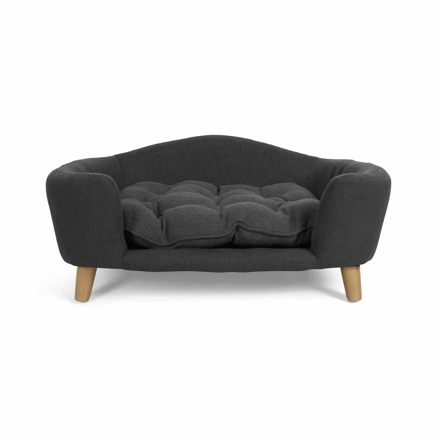 Upholstered dog sofa with curved armrests, tufted cushion, birch wood legs, dark gray linen-look fabric, 30.25 x 21.75 x 14 inches. Low-profile couch with rounded arms mimics human furniture blending into decor. Clean lines create elegant appearance. Dark gray coordinates with modern interiors. Raised design keeps dogs off cold floors. Channel-tufted seat with scalloped quilting adds texture and comfort. Tufting prevents filling from shifting maintaining even padding. Thick foam supports joints reducing pressure on hips and elbows.