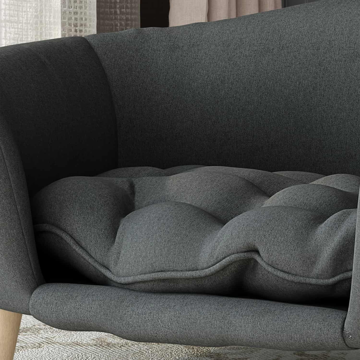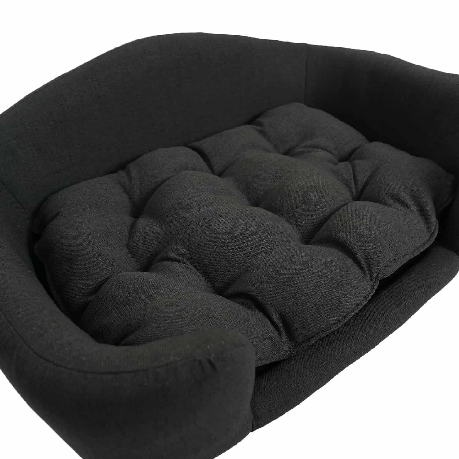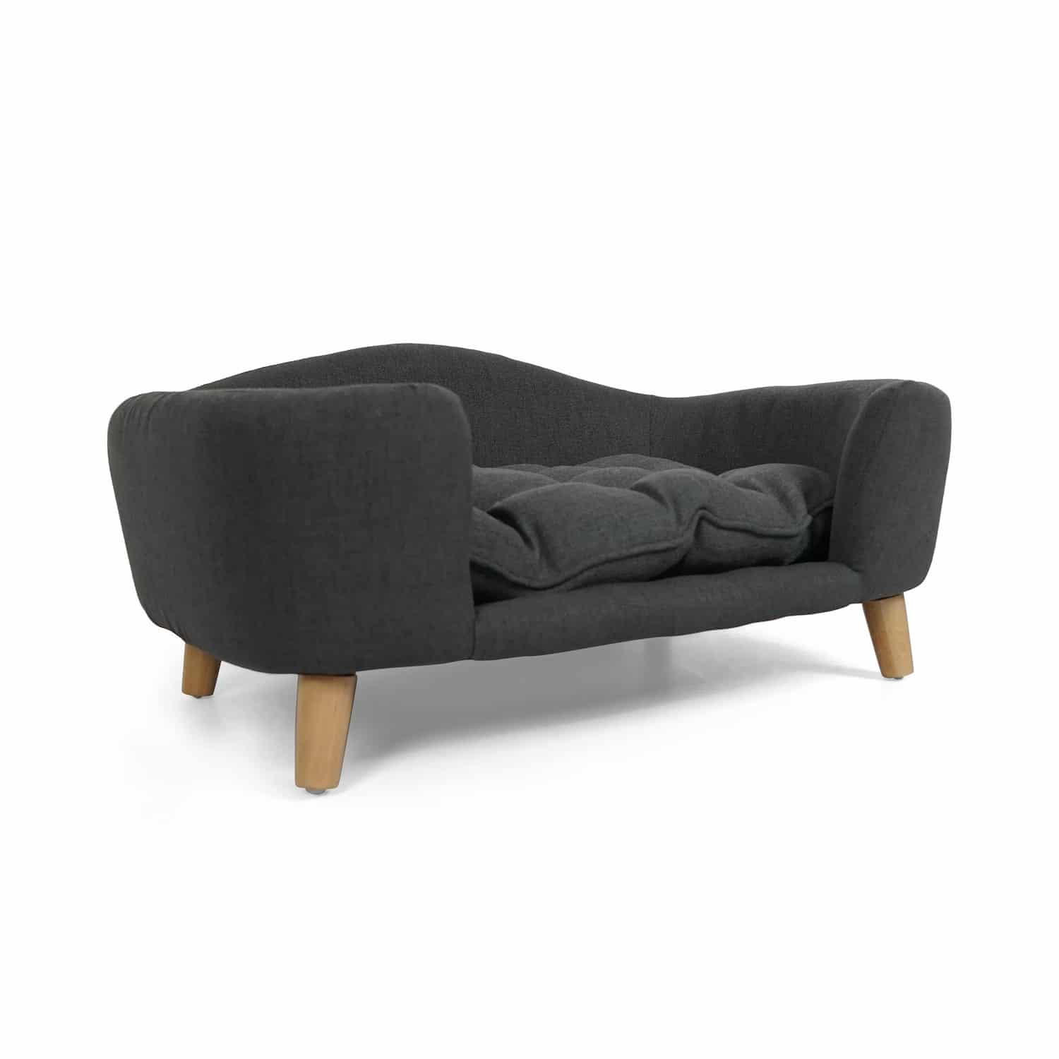 Upholstered dog sofa with curved armrests, tufted cushion, birch wood legs, dark gray linen-look fabric, 30.25 x 21.75 x 14 inches. Low-profile couch with rounded arms mimics human furniture blending into decor. Clean lines create elegant appearance. Dark gray coordinates with modern interiors. Raised design keeps dogs off cold floors. Channel-tufted seat with scalloped quilting adds texture and comfort. Tufting prevents filling from shifting maintaining even padding. Thick foam supports joints reducing pressure on hips and elbows.