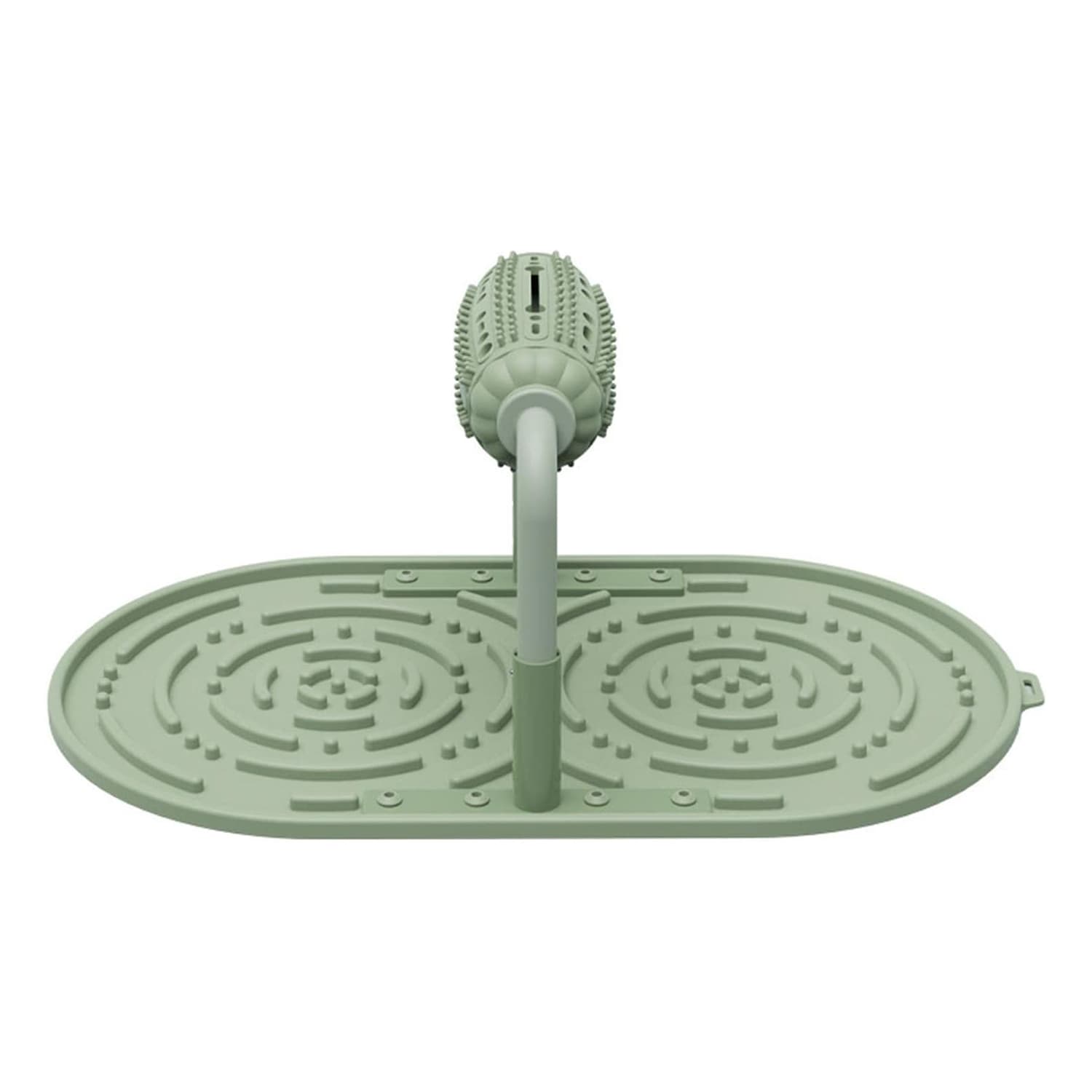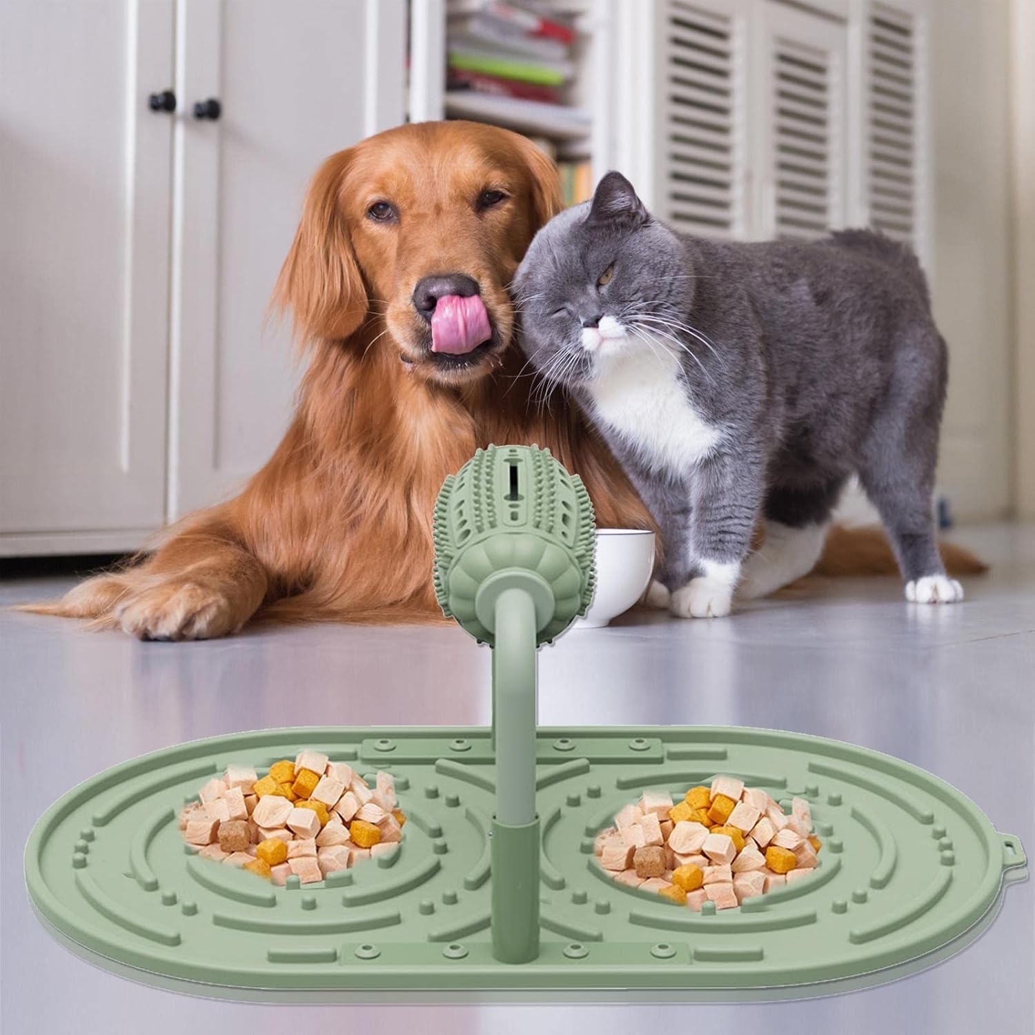 2-in-1 puzzle feeder with spinning roller that dispenses treats onto maze-style lick pad.
