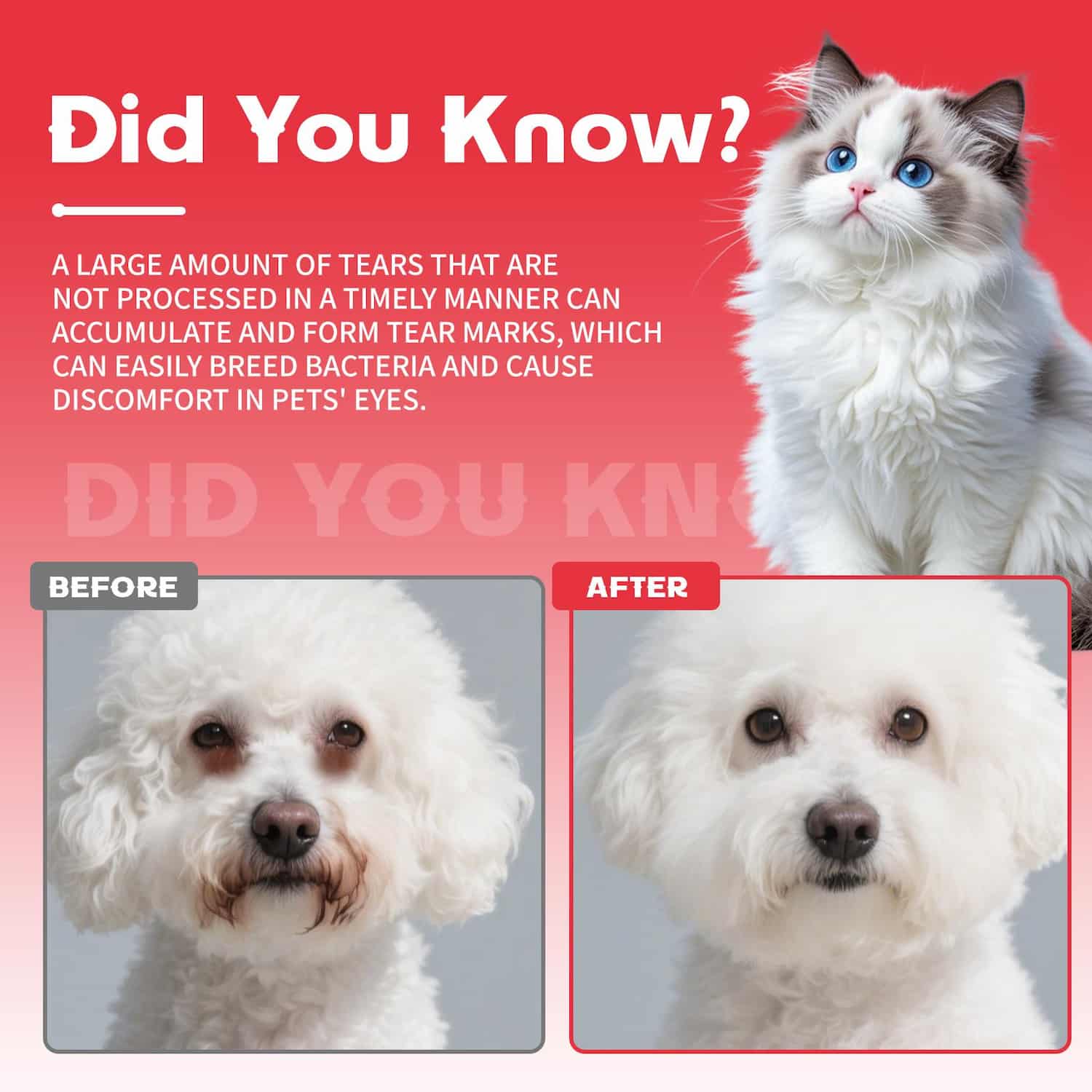 Six-ingredient plant-derived pet tear stain powder with lysozyme and vitamin C targeting pigment at source.